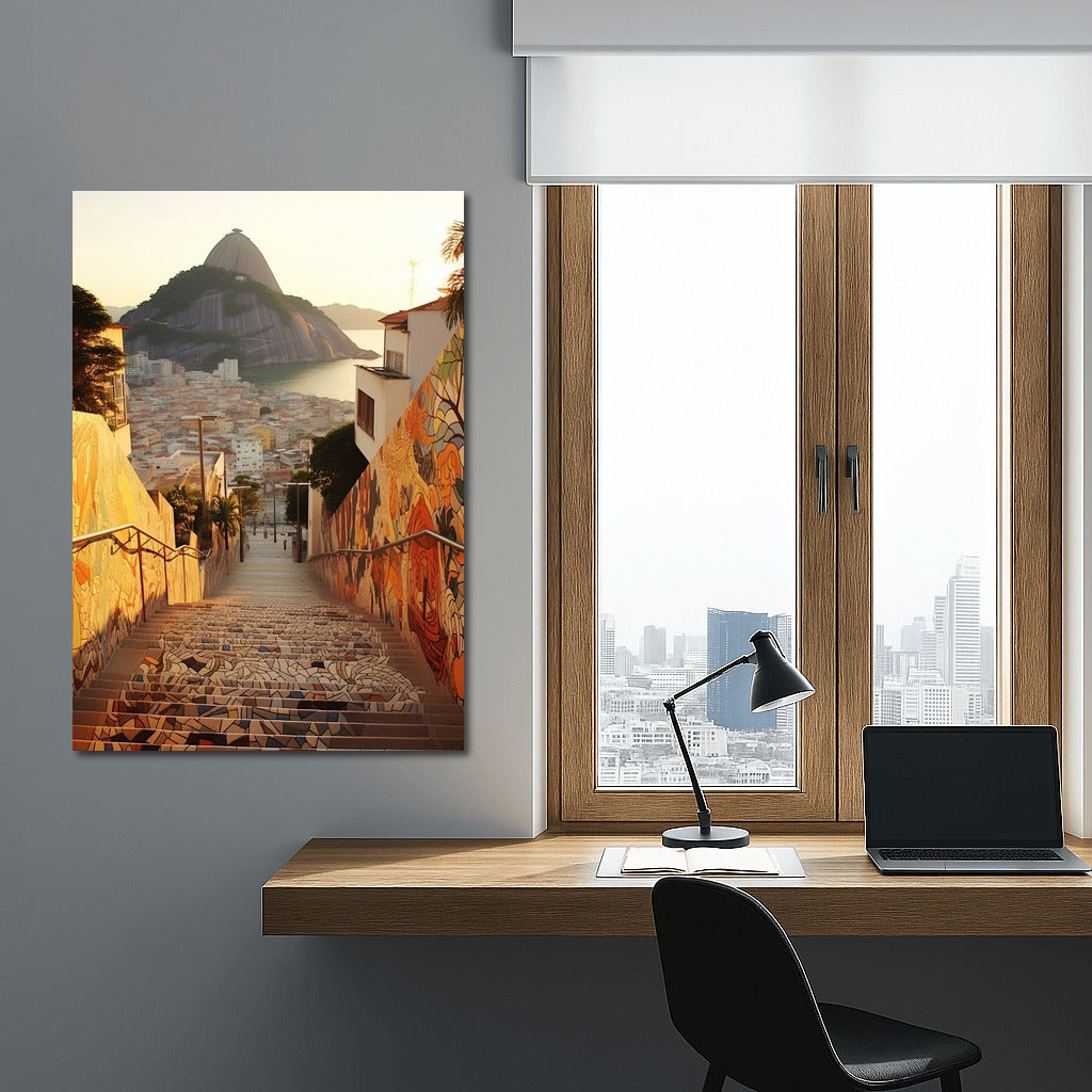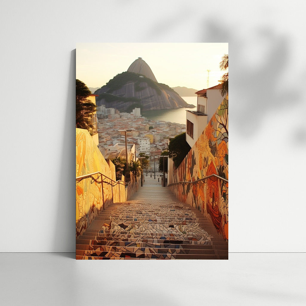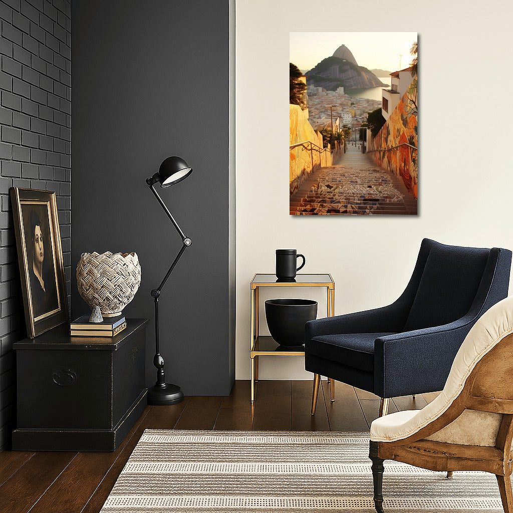 Immerse yourself in the atmosphere of Rio: a poster with a view of the city and the mountain, framed by colorful mosaics. Dream wall art! See more from the collection: Mixed Wall Art