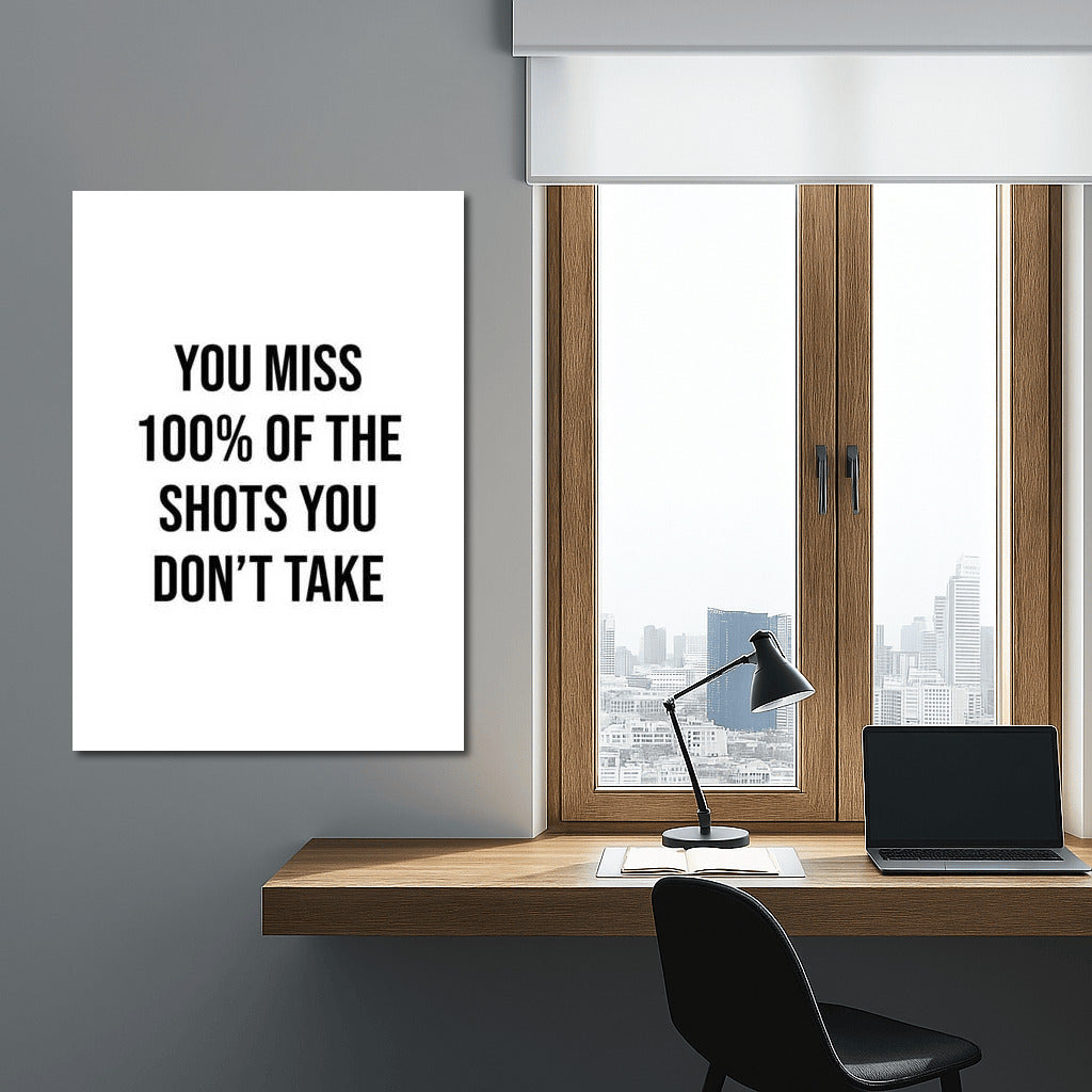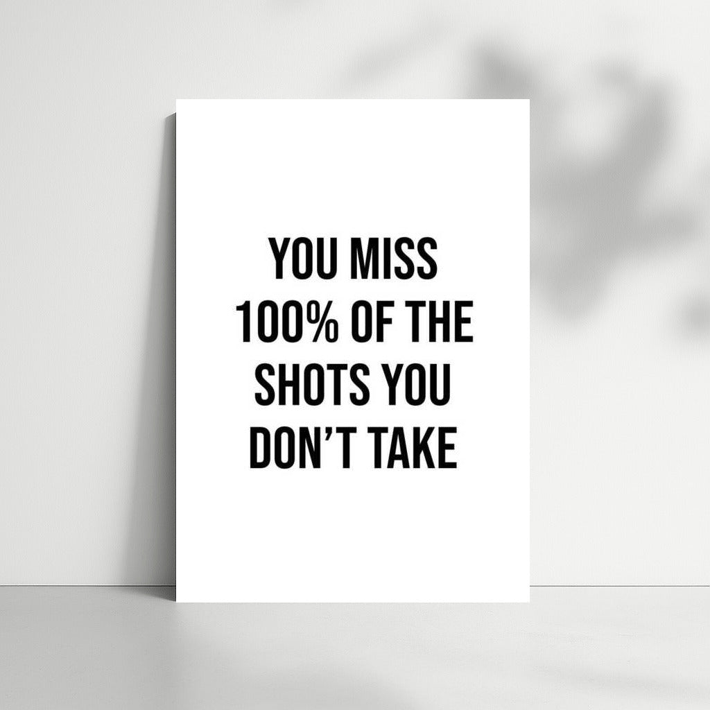 An inspiring poster to get you motivated: You miss 100% of the shots you don’t take. Wall art that inspires action! See more from the collection: Inspirational & Motivational Quotes Art