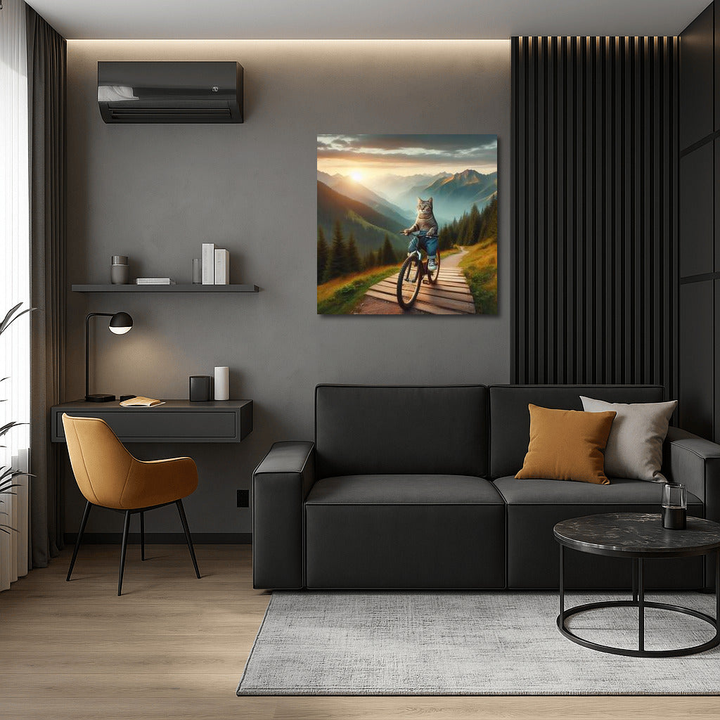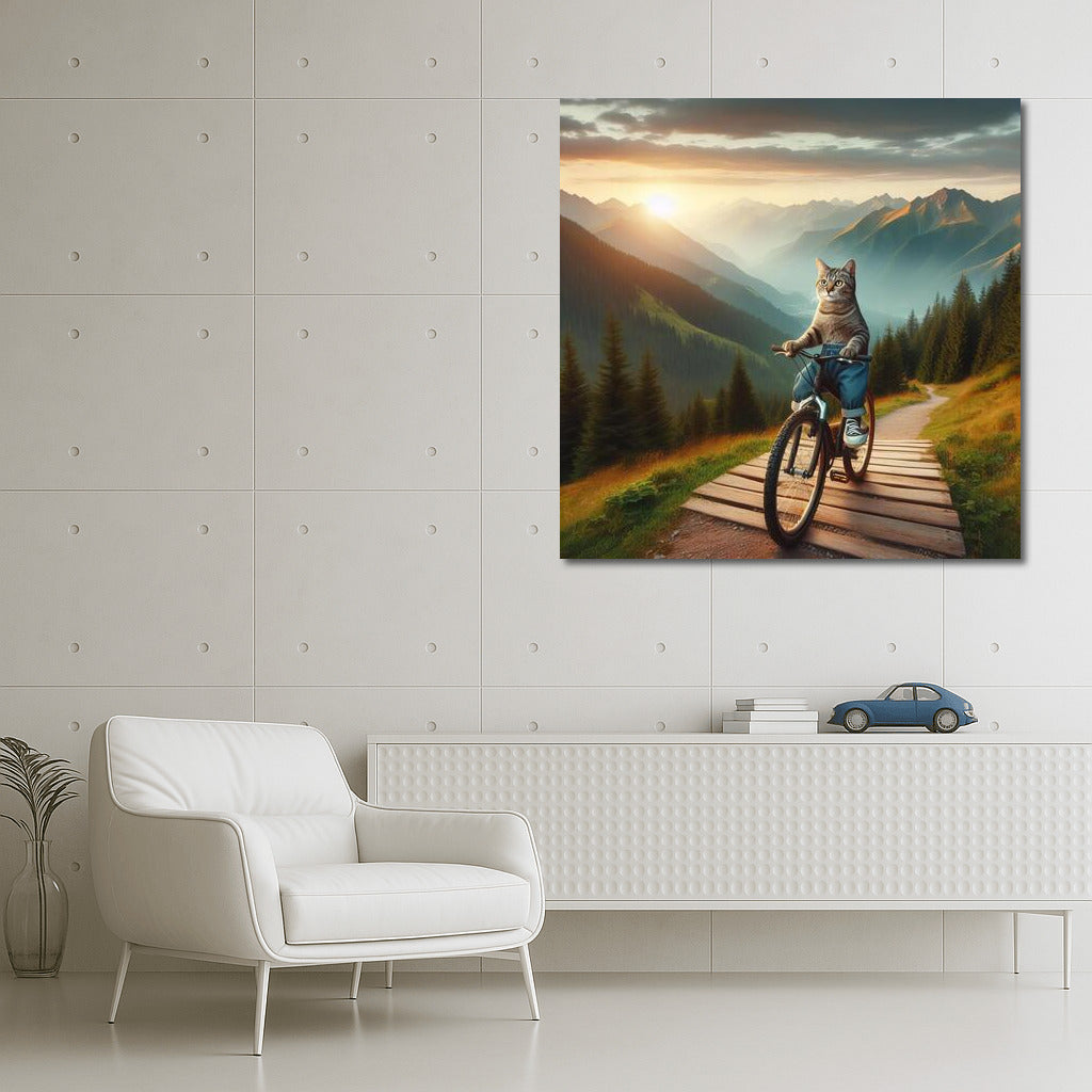 A cat on a bicycle rushes along a mountain path, giving an atmosphere of adventure! The perfect poster for your space. See more from the collection: Animals Art