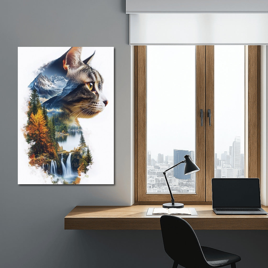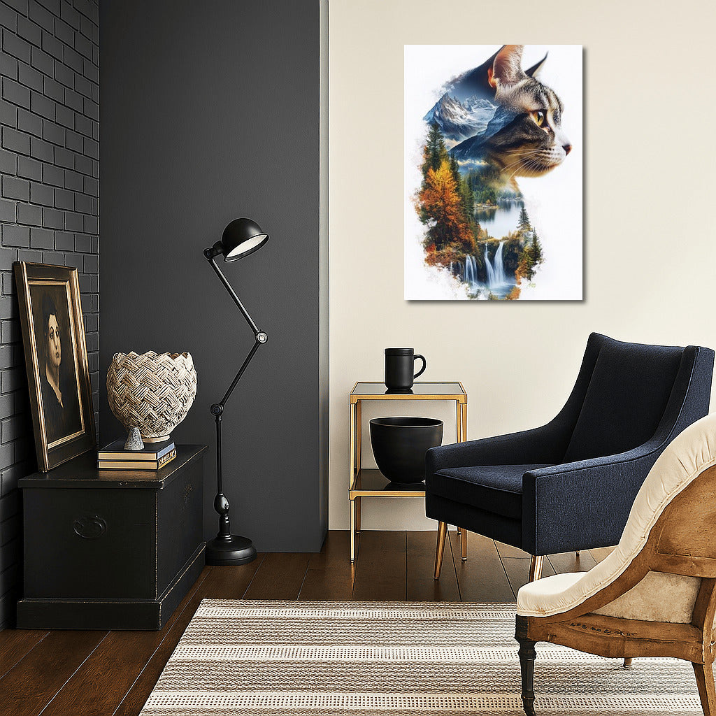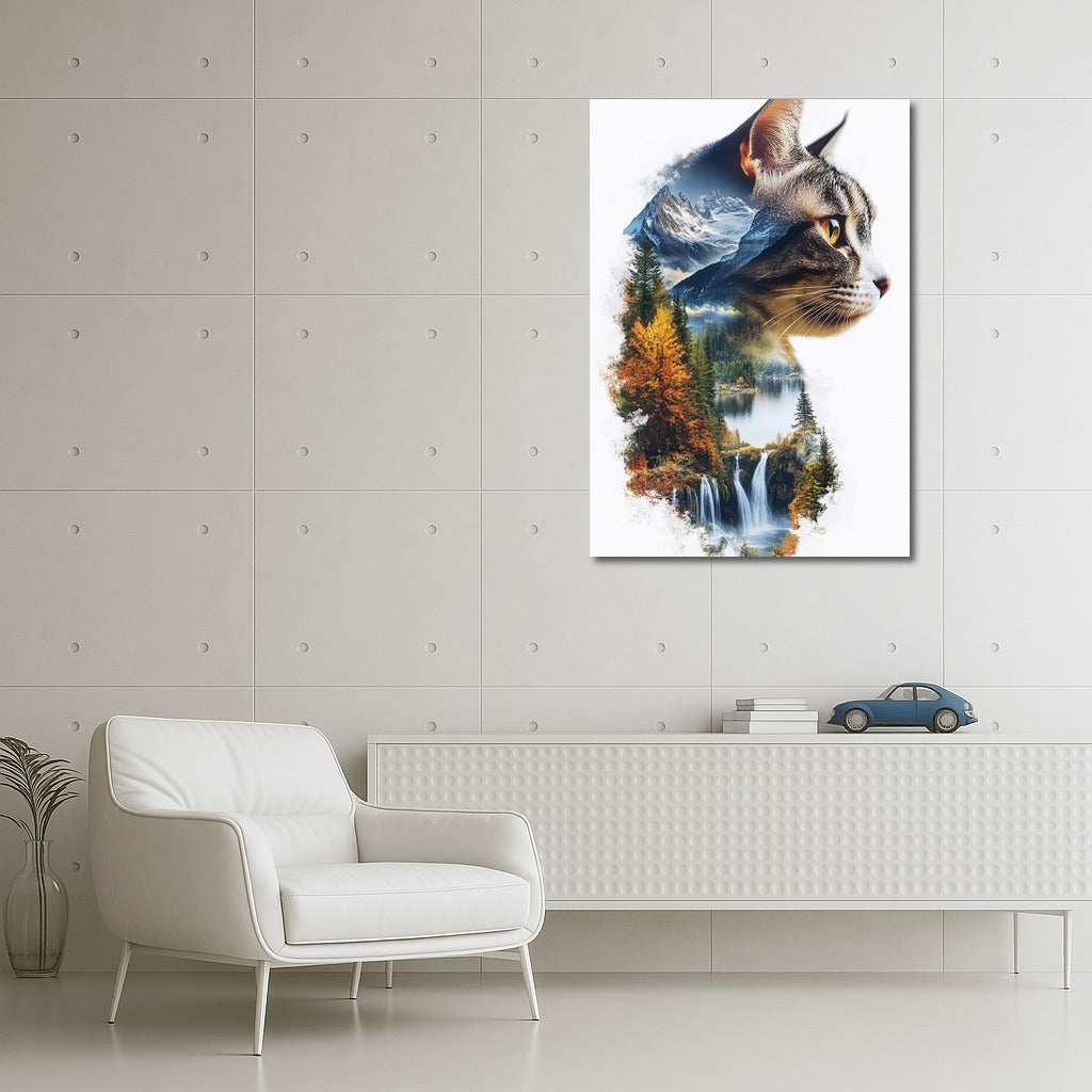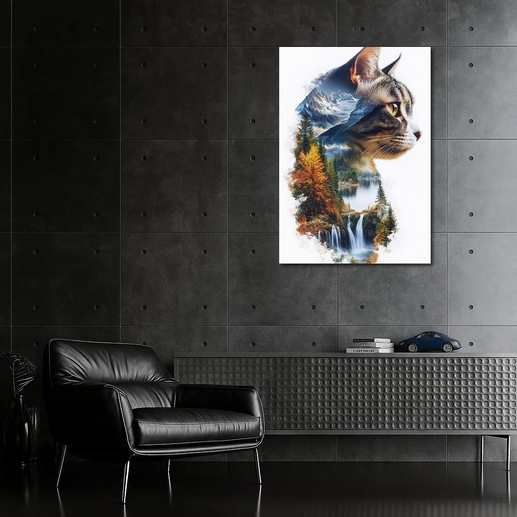 Immerse yourself in the magic of wild nature with this poster: cat and mountain landscape in one, amazing wall art for your home. See more from the collection: Animals Art
