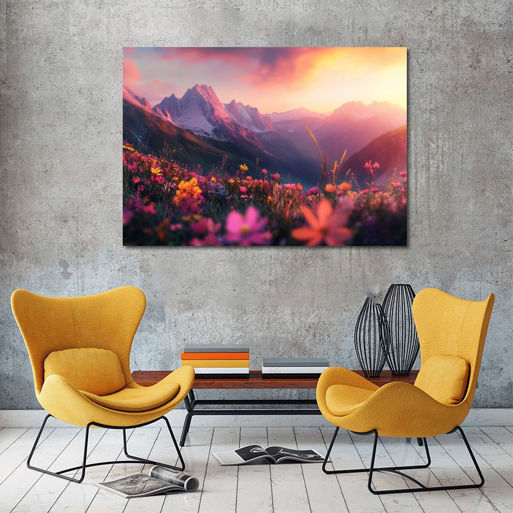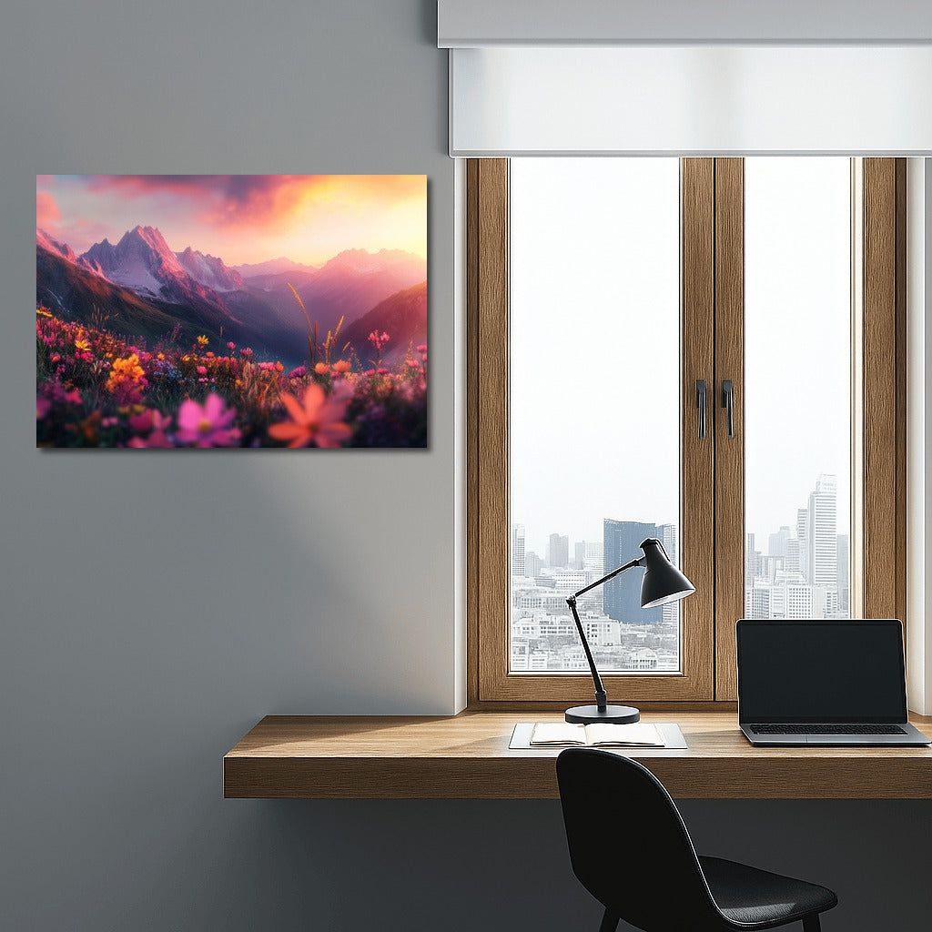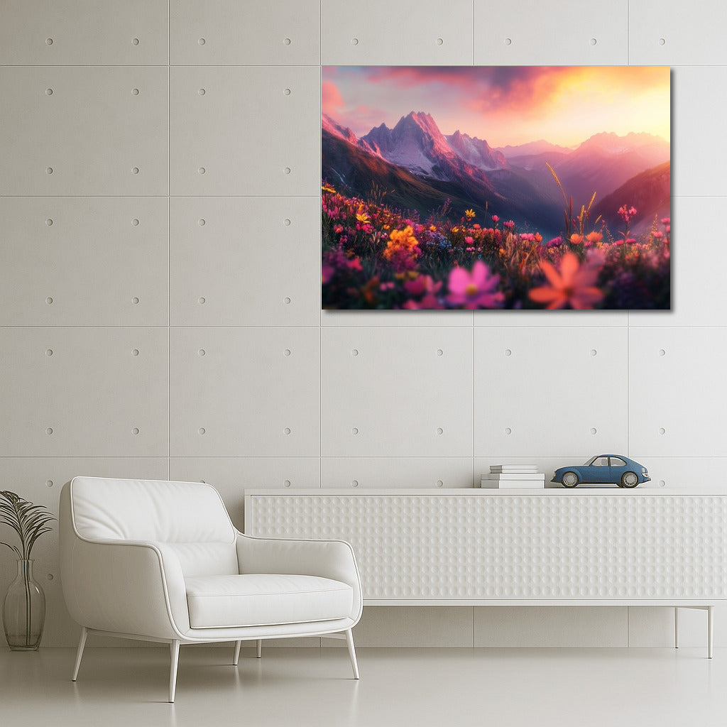 Immerse yourself in the magic of sunset with this painting: mountains and flowers come to life, creating the perfect wall art for your home. See more from the collection: Nature & Landscapes Art