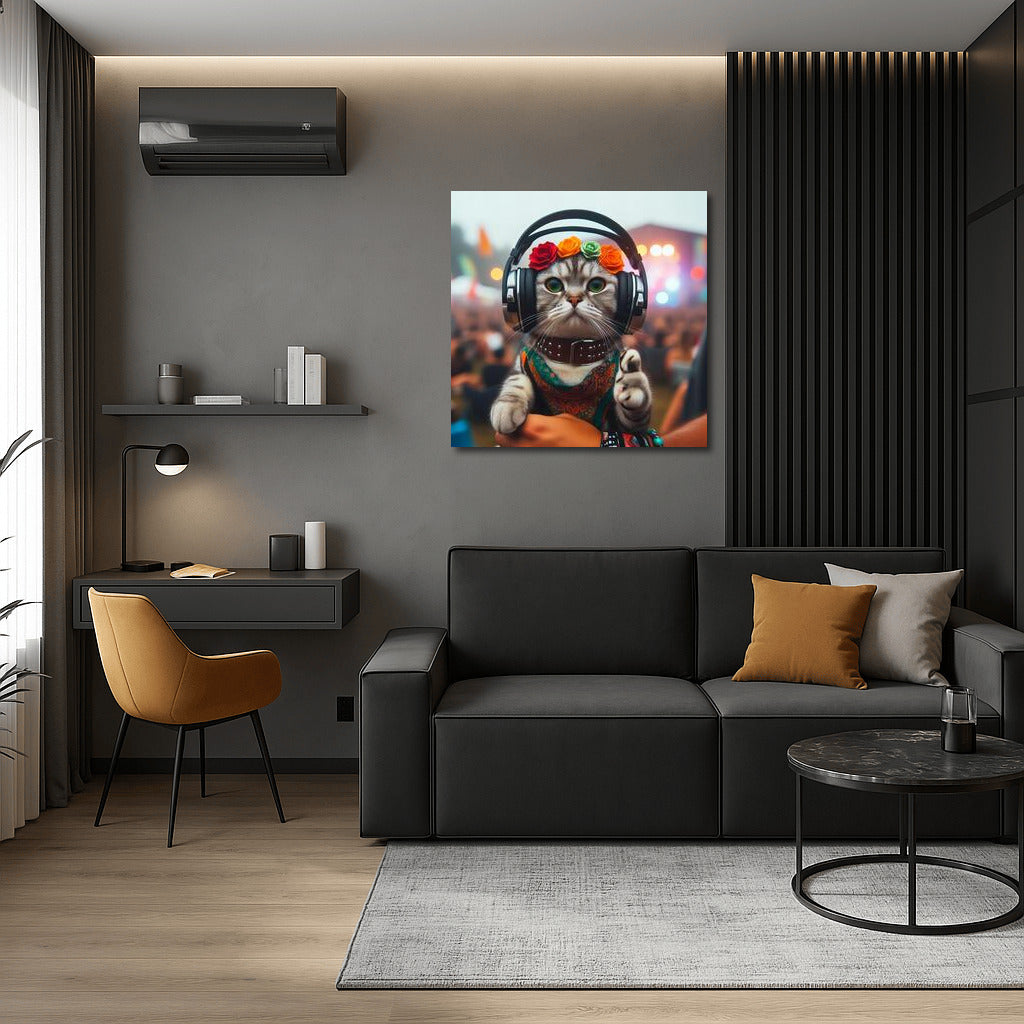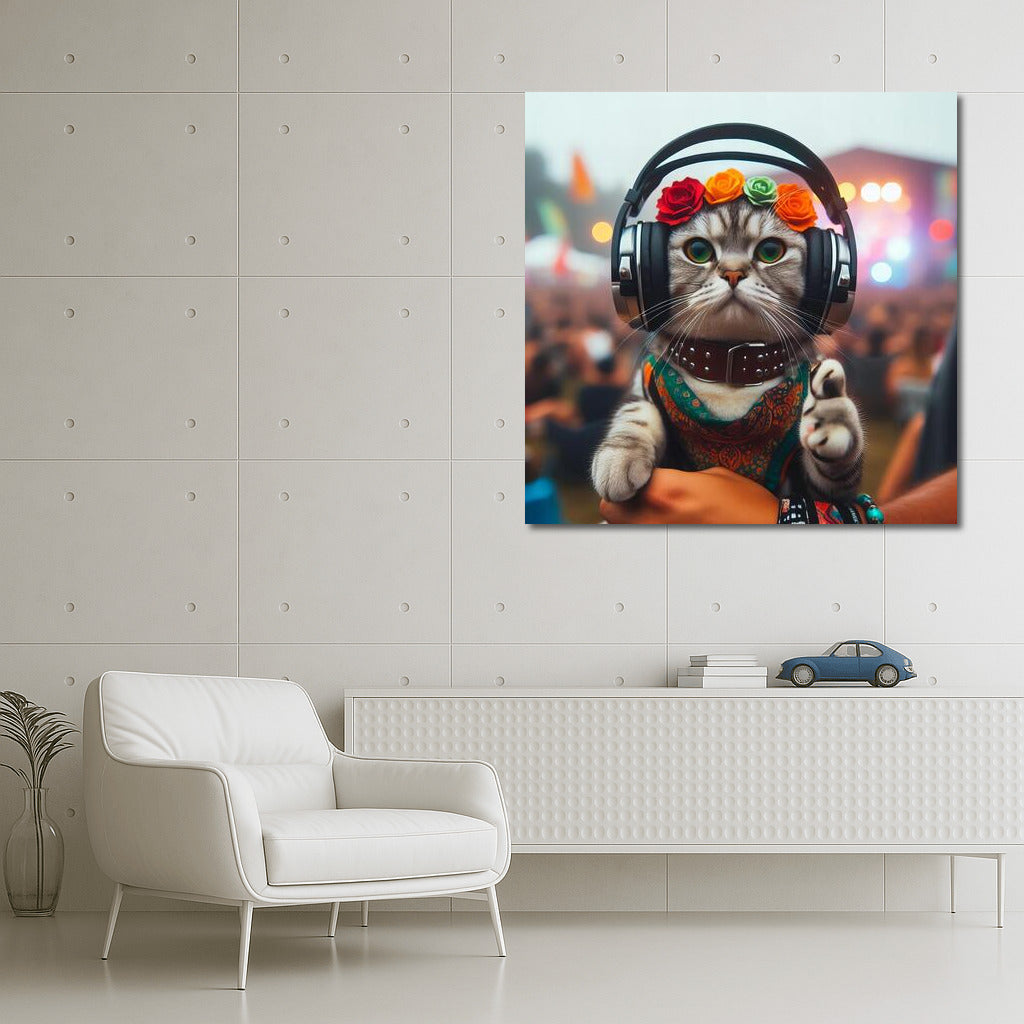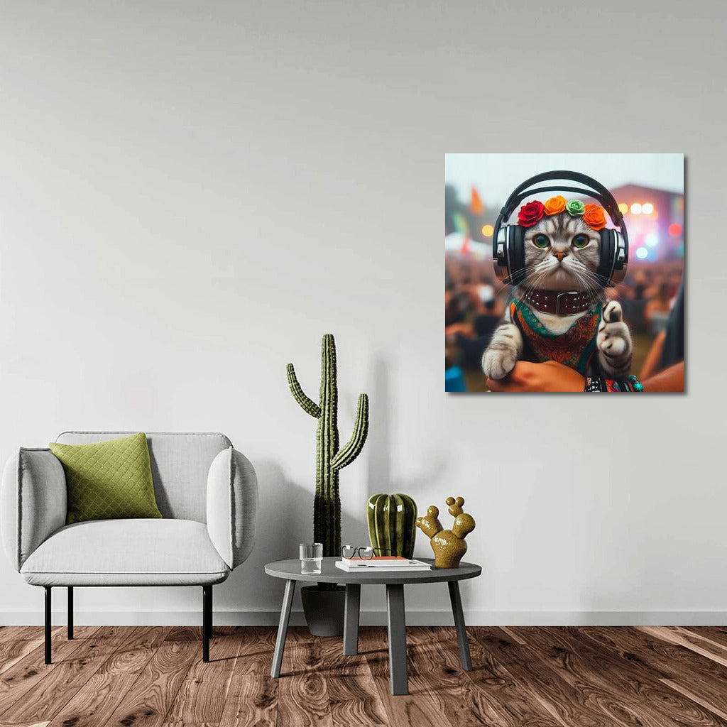 Musical Cat at the Festival: Stylish Headphones and Flower Crown Wall Art