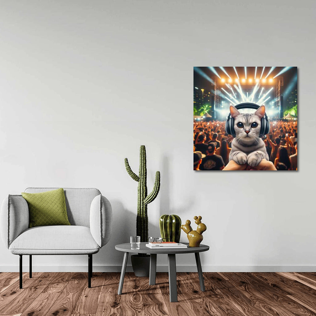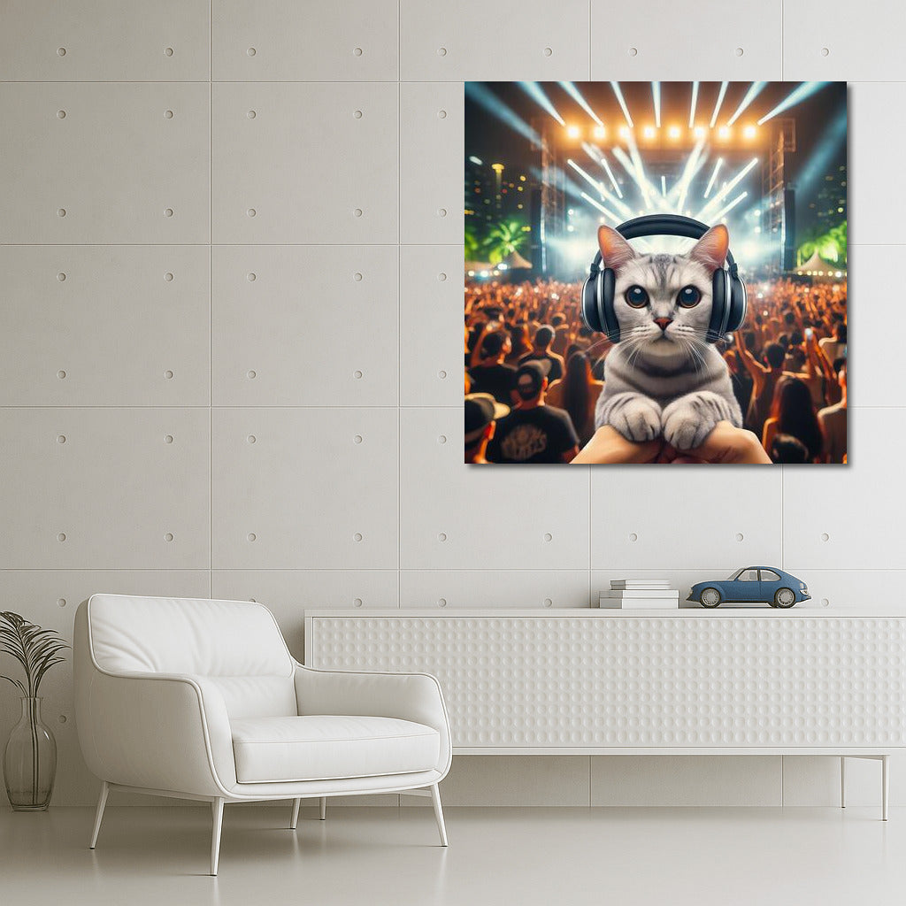 A cat in stylish headphones enjoys the festival against the backdrop of bright lights and crowds. The perfect poster for music lovers! See more from the collection: Animals Art