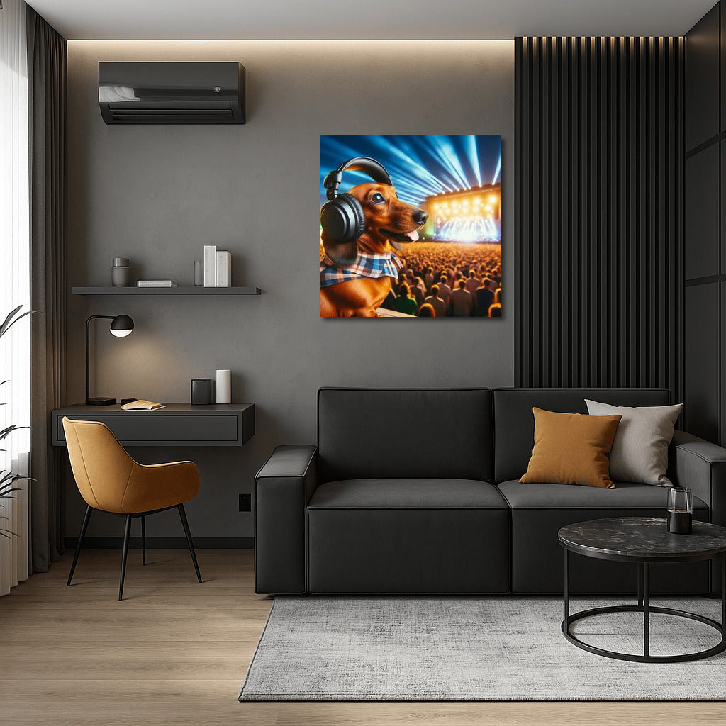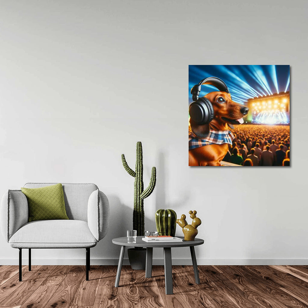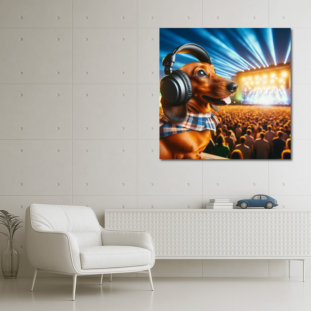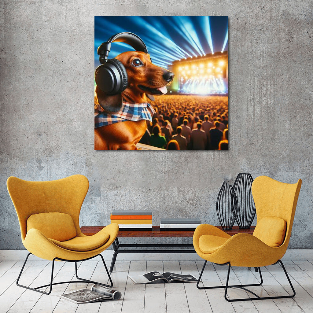Cheeky wall art: a dog with headphones enjoys a concert. Add some drive to your interior with this bright poster! ?? See more from the collection: Animals Art