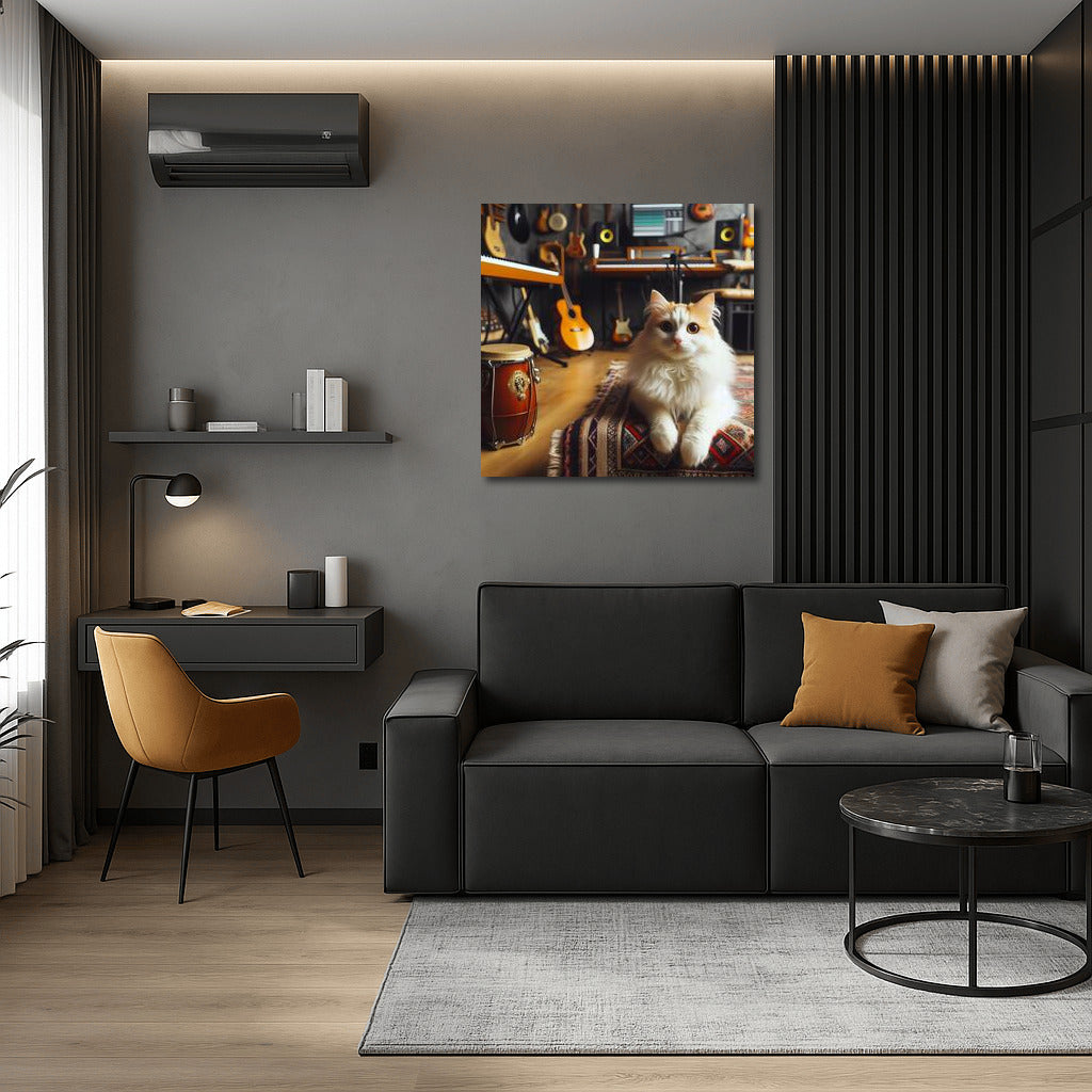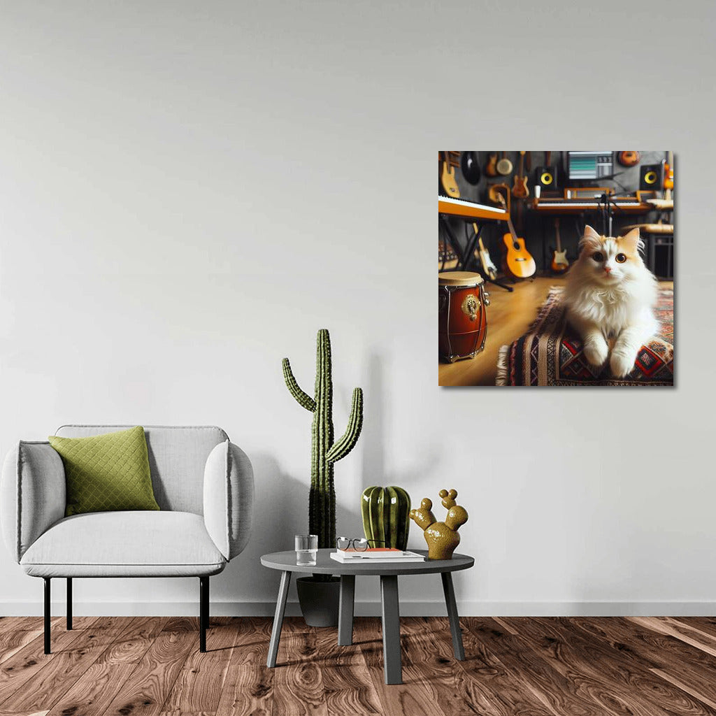 Turkish Van in the Music Studio 3 poster: a fluffy cat inspires melodies among instruments. Wall art with character! See more from the collection: Animals Art