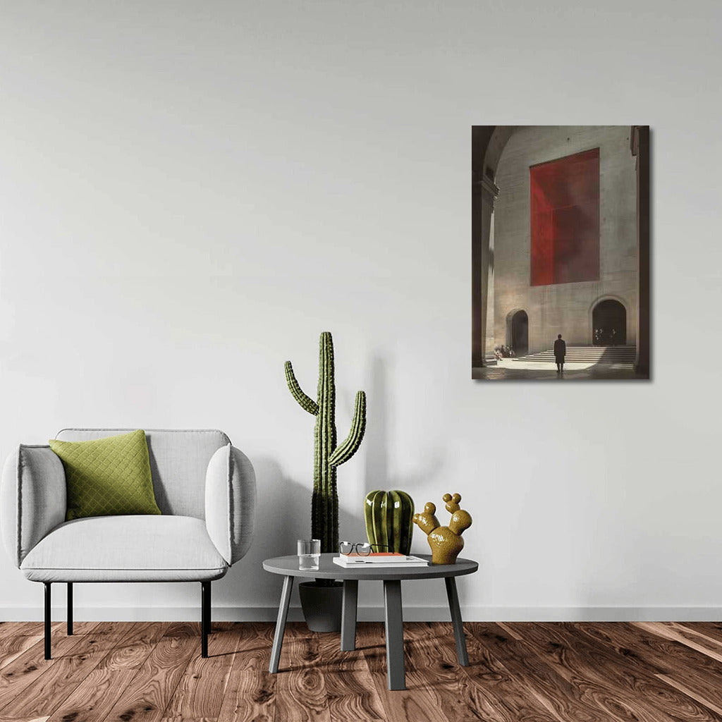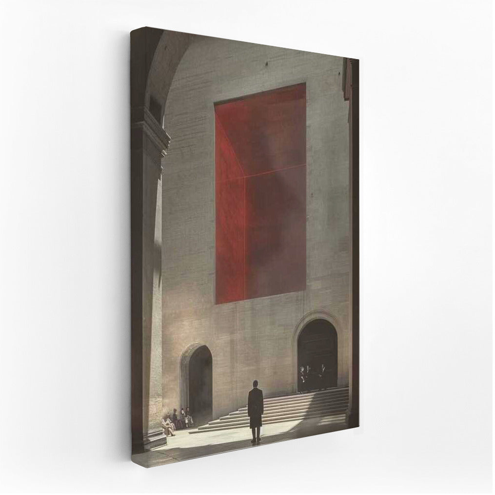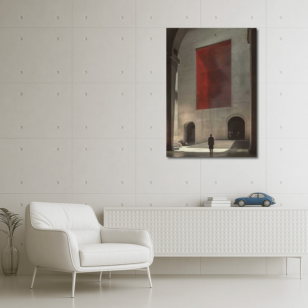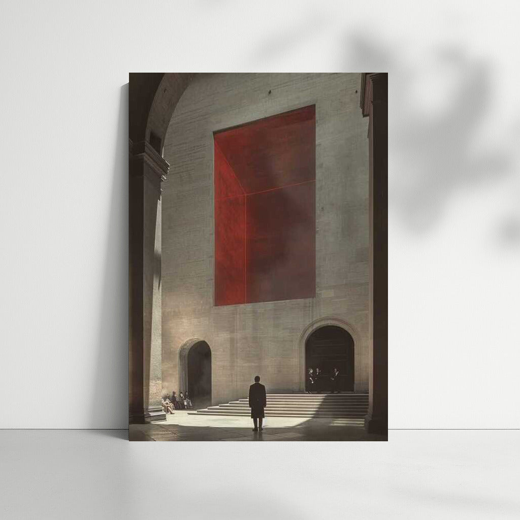 Take a look at the surreal painting: a mysterious figure in front of a red cube in a majestic space. Dream wall art. See more from the collection: Surreal Art