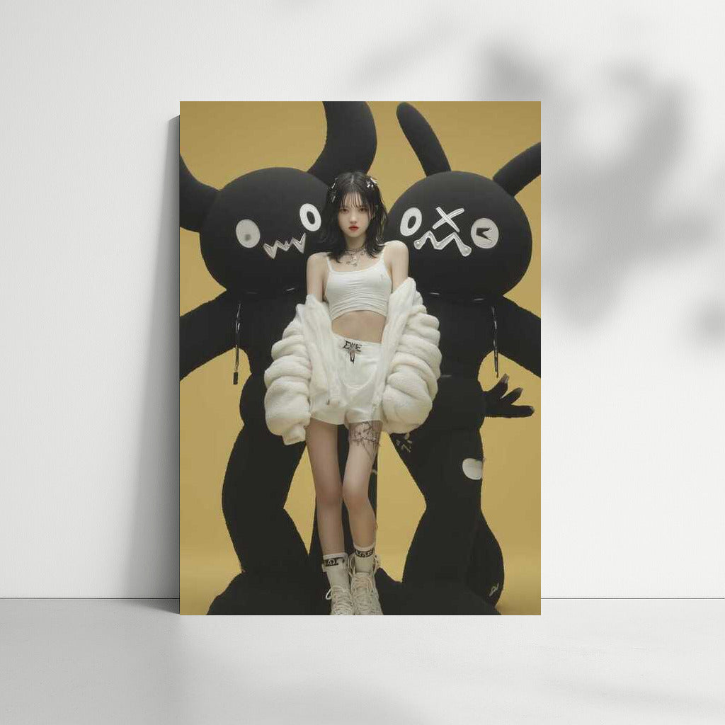 A vibrant K-Pop poster featuring a mysterious character surrounded by bold art forms. Bringing Korean culture to your space! See more from the collection: K-pop & Korean culture Art