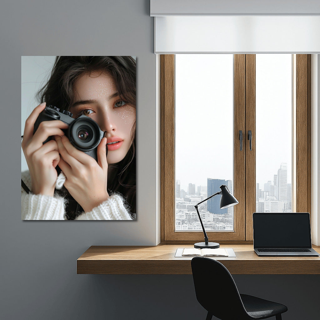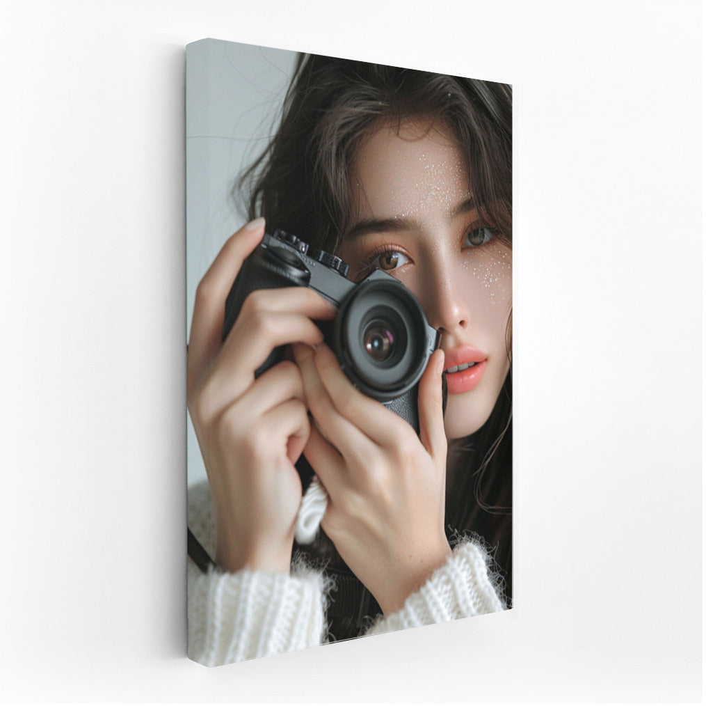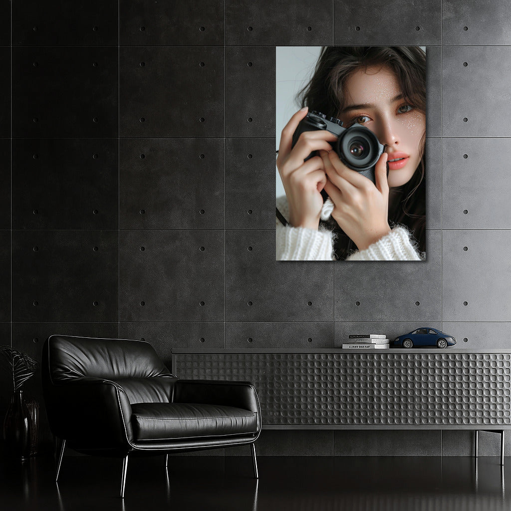An elegant poster: a mysterious smile and a camera in hand attract the eye in an atmospheric play of light and shadow. Wall art that is impossible to tear yourself away from. See more from the collection: Wall Art with Women