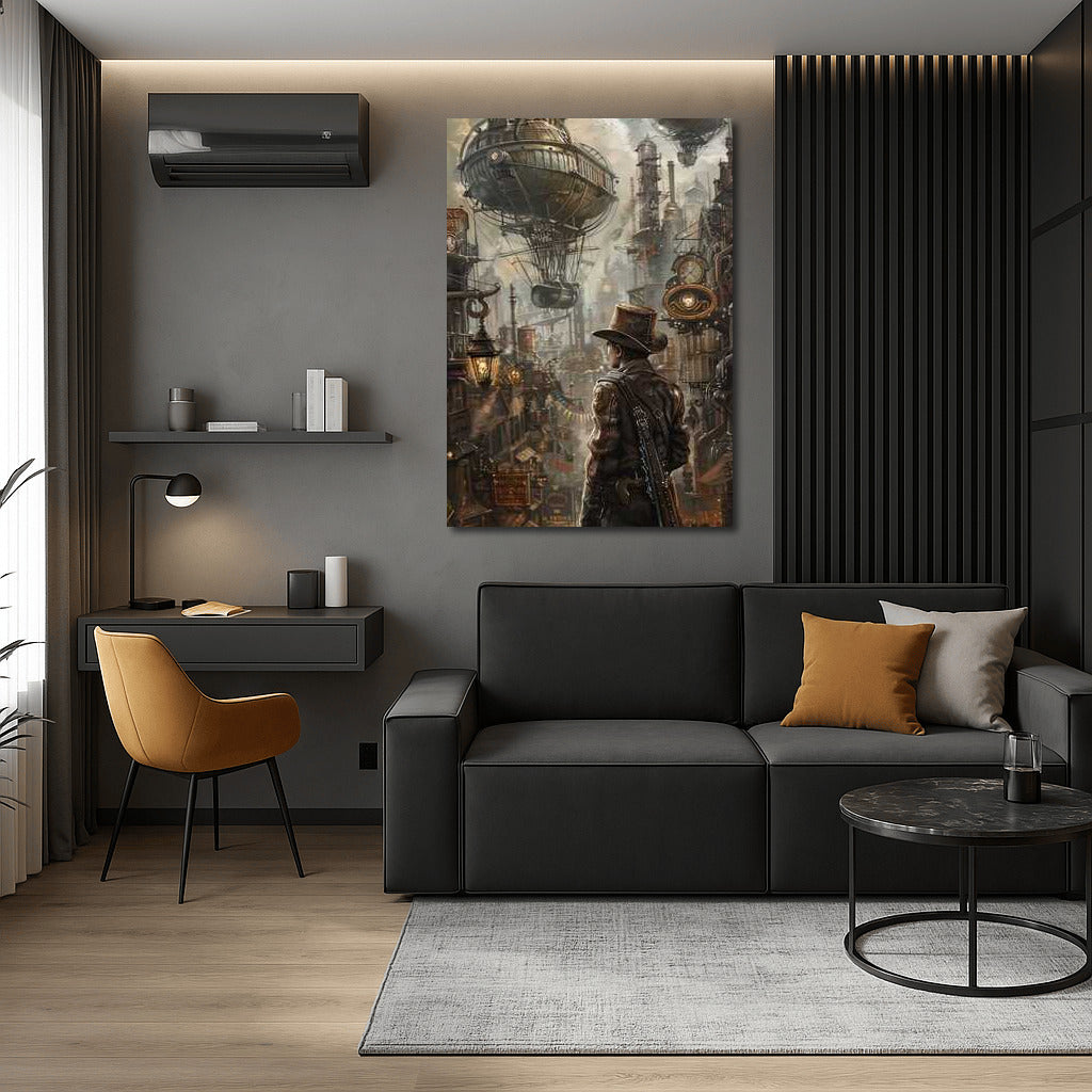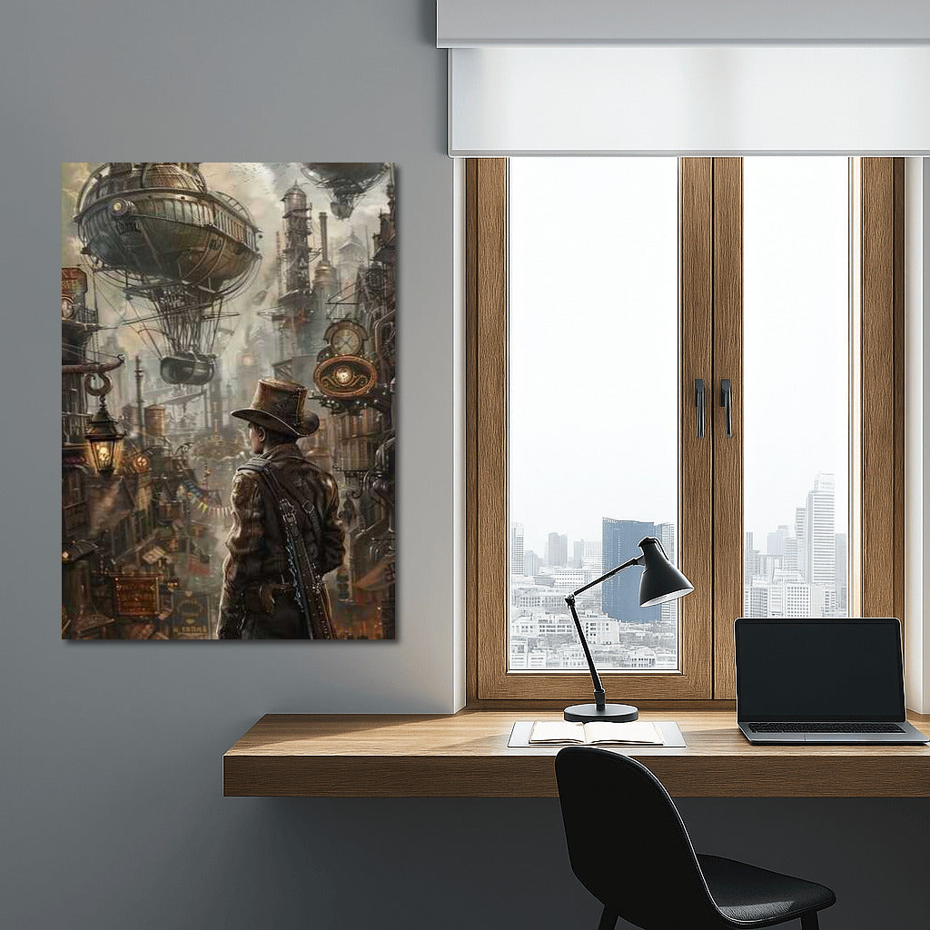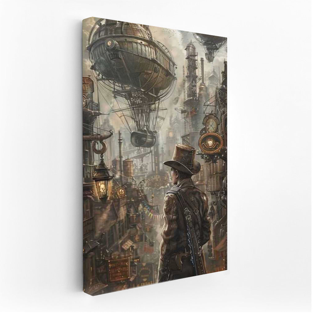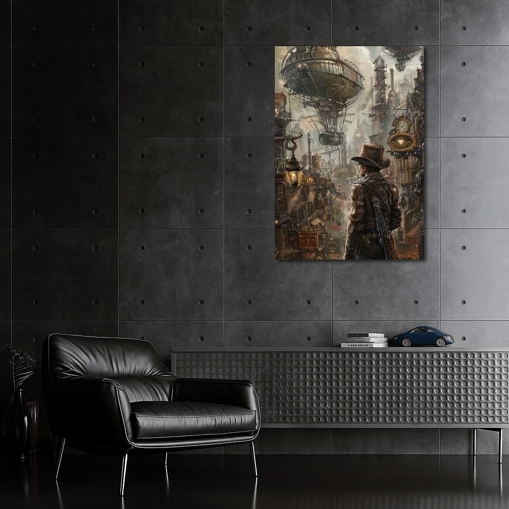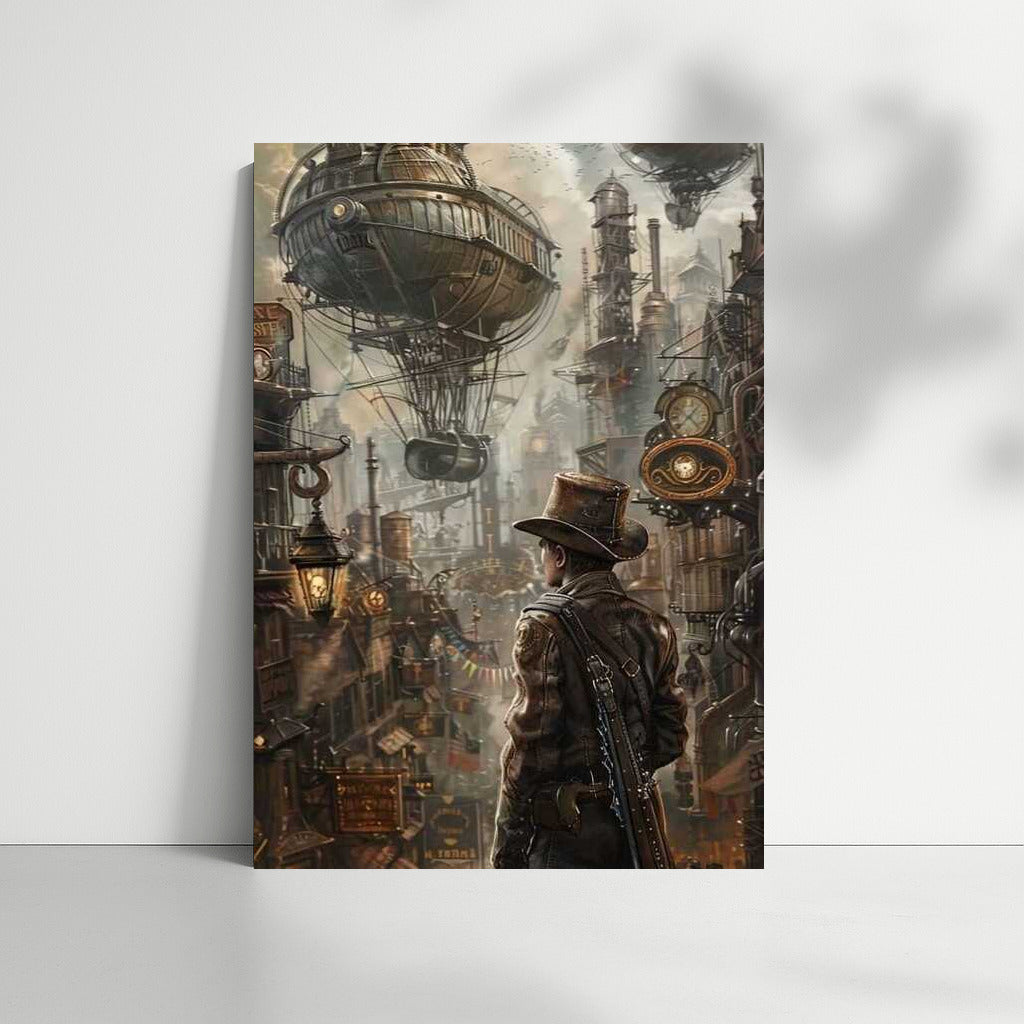Steampunk Whirlwind: A Mysterious Traveler in the World of Steam Engines. The painting will enliven your walls with the spirit of adventure and retro-futurism. See more from the collection: Steampunk Art