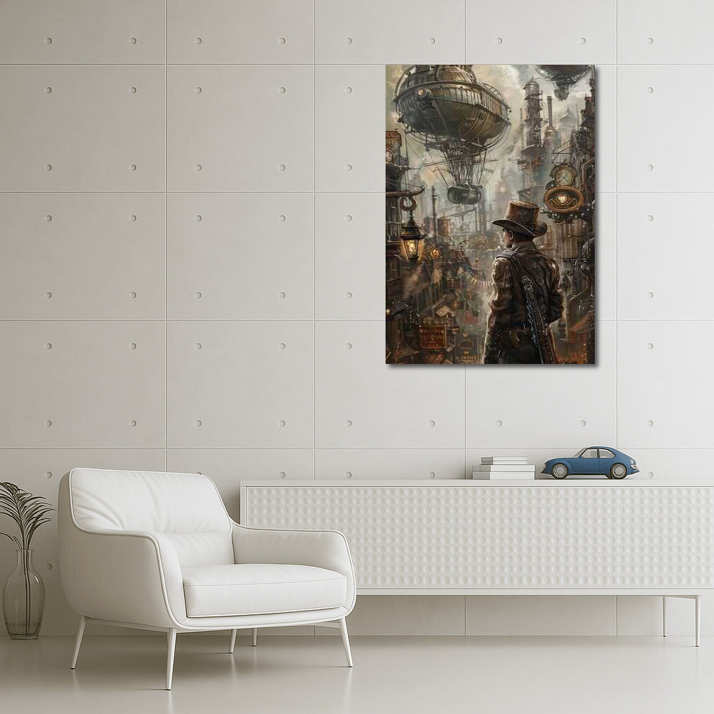 Mysterious Traveler in the World of Steampunk Machines Wall Art