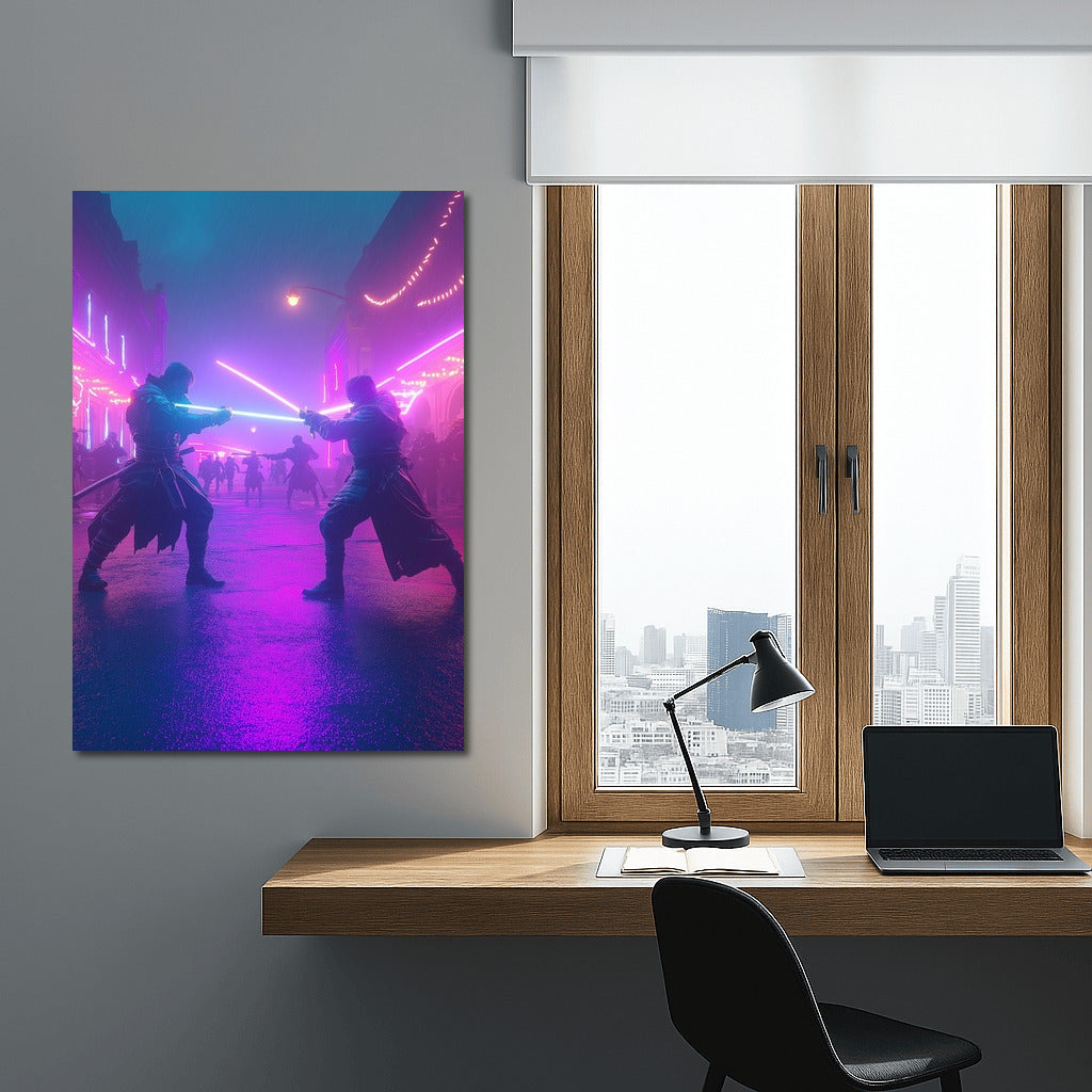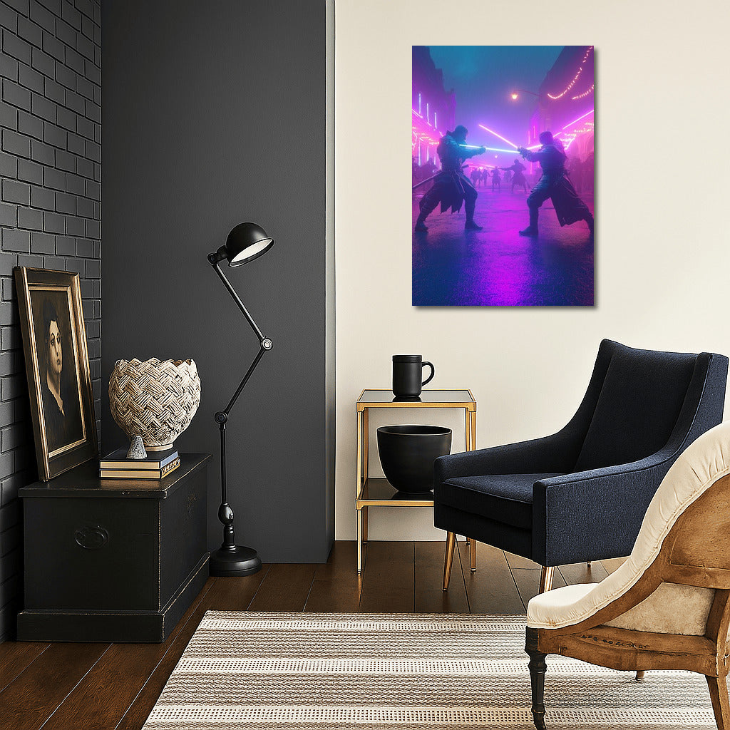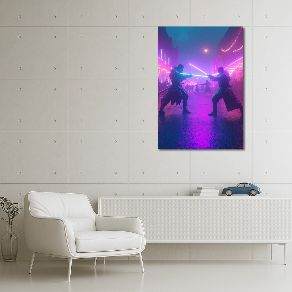 Glowing blades and neon lights: immerse yourself in a futuristic duel with this exciting wall art poster! See more from the collection: Neon Art