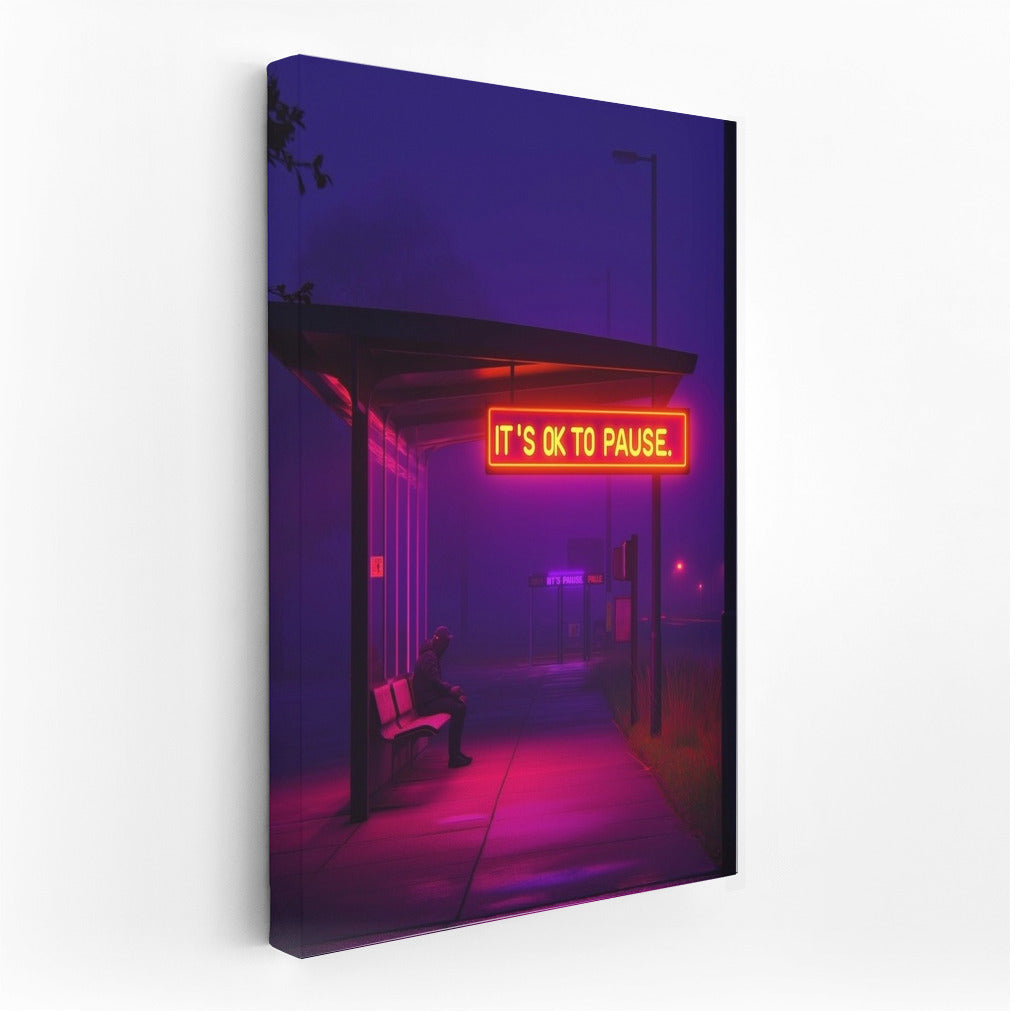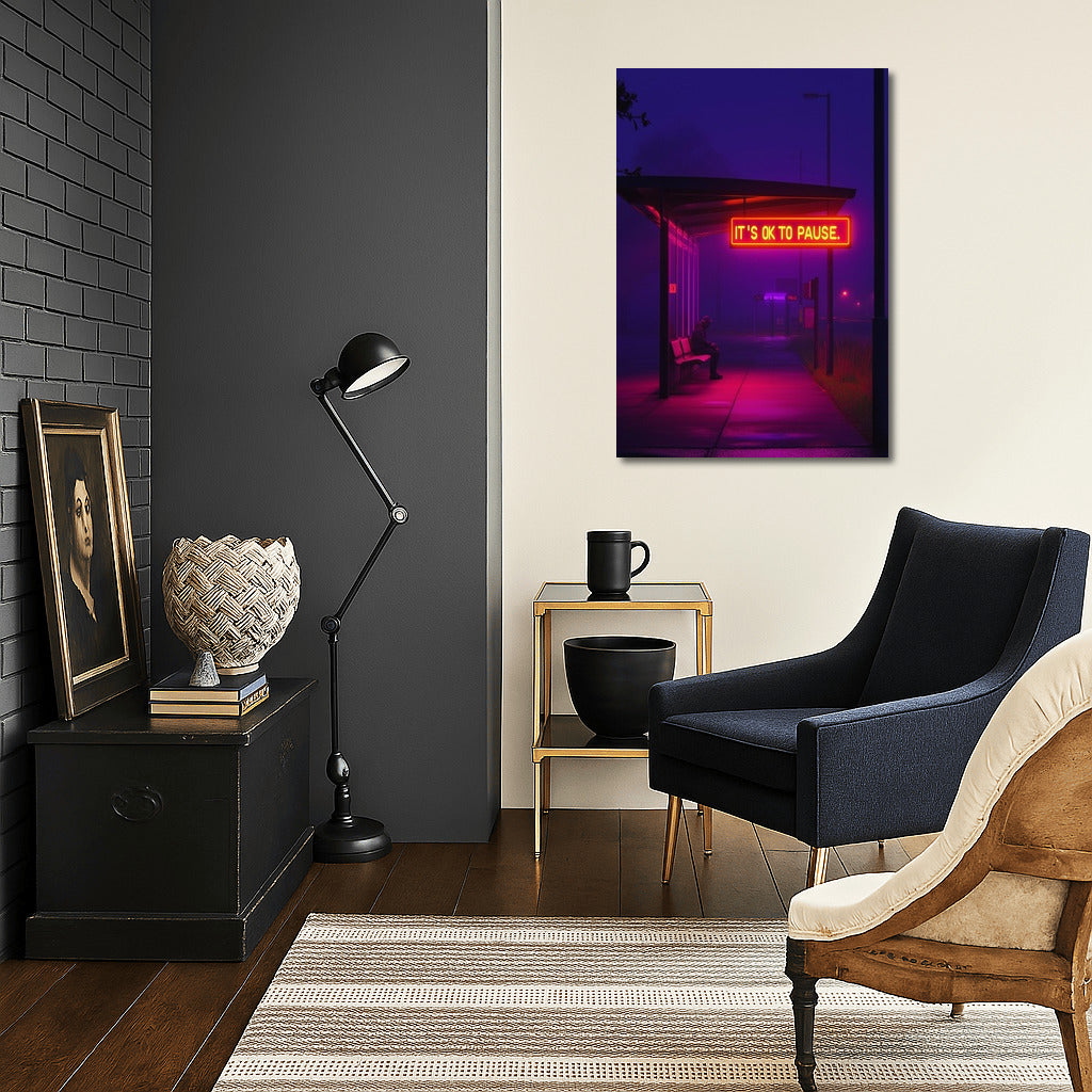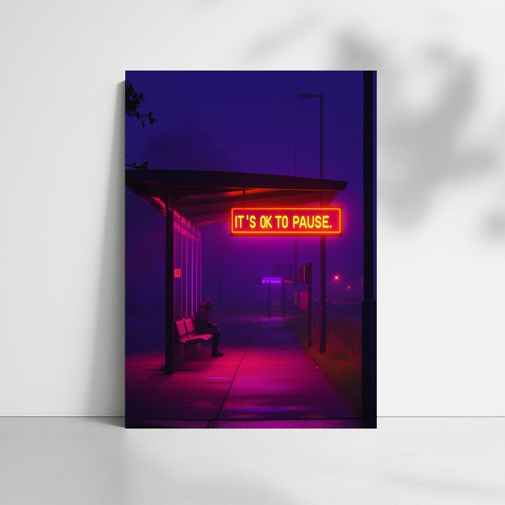 A vibrant poster with neon glow in the middle of the night. Wall art that reminds us of the importance of pauses and inner peace. See more from the collection: Neon Art