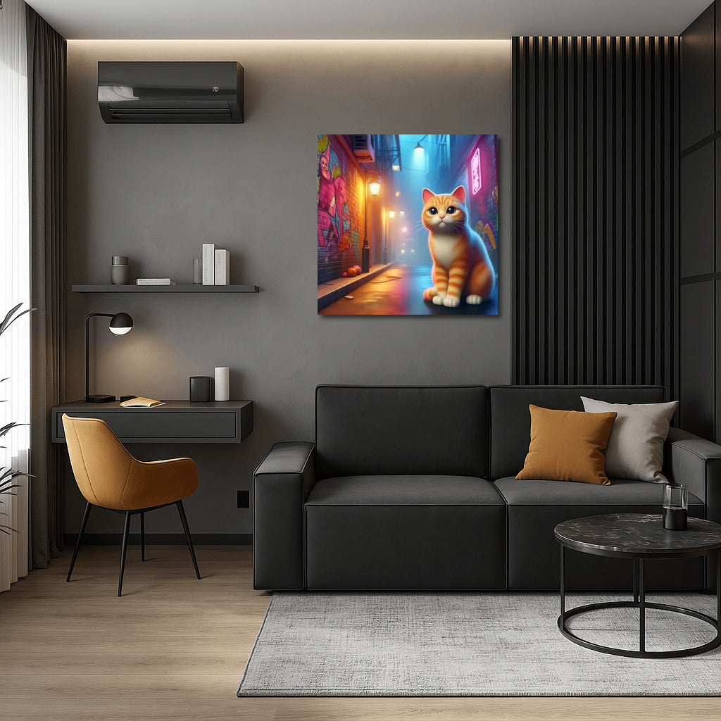 Neon Cat in City Lights: Journey Down the Alley Wall Art