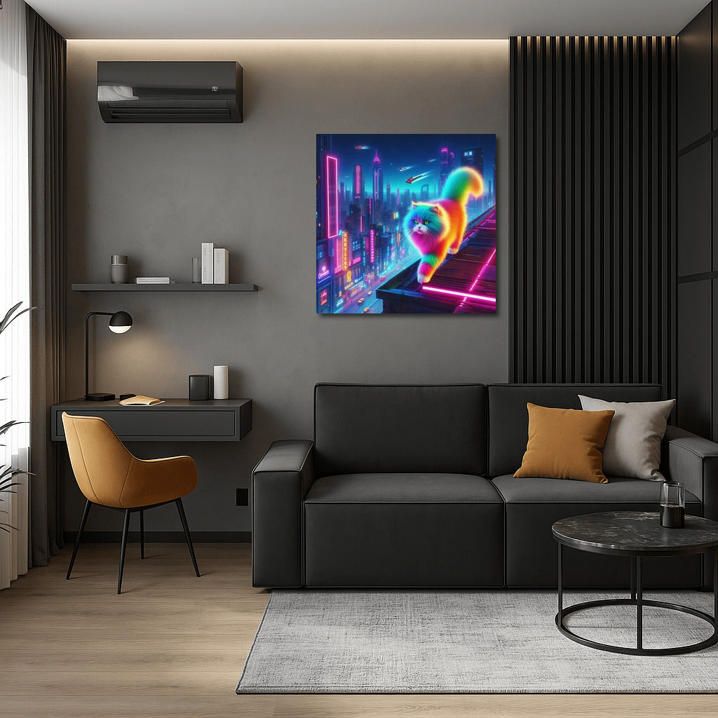 Captivating painting: cat in neon city. Bright poster will add futurism and color to your wall art. See more from the collection: Animals Art