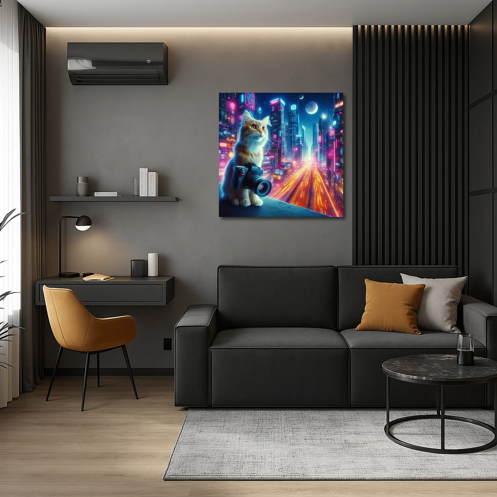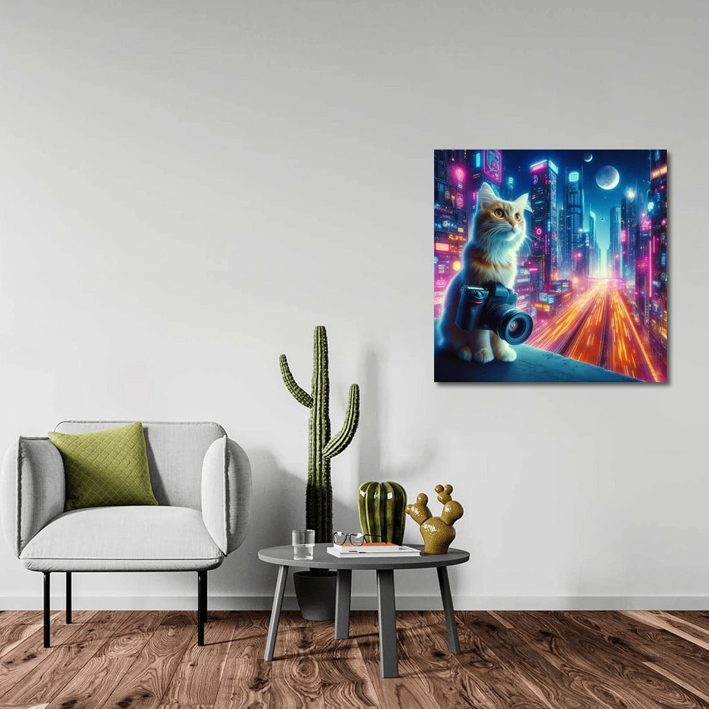 Dive into the future with a cat photographer in the neon lights of the metropolis! Create an atmosphere with this unique poster. See more from the collection: Animals Art