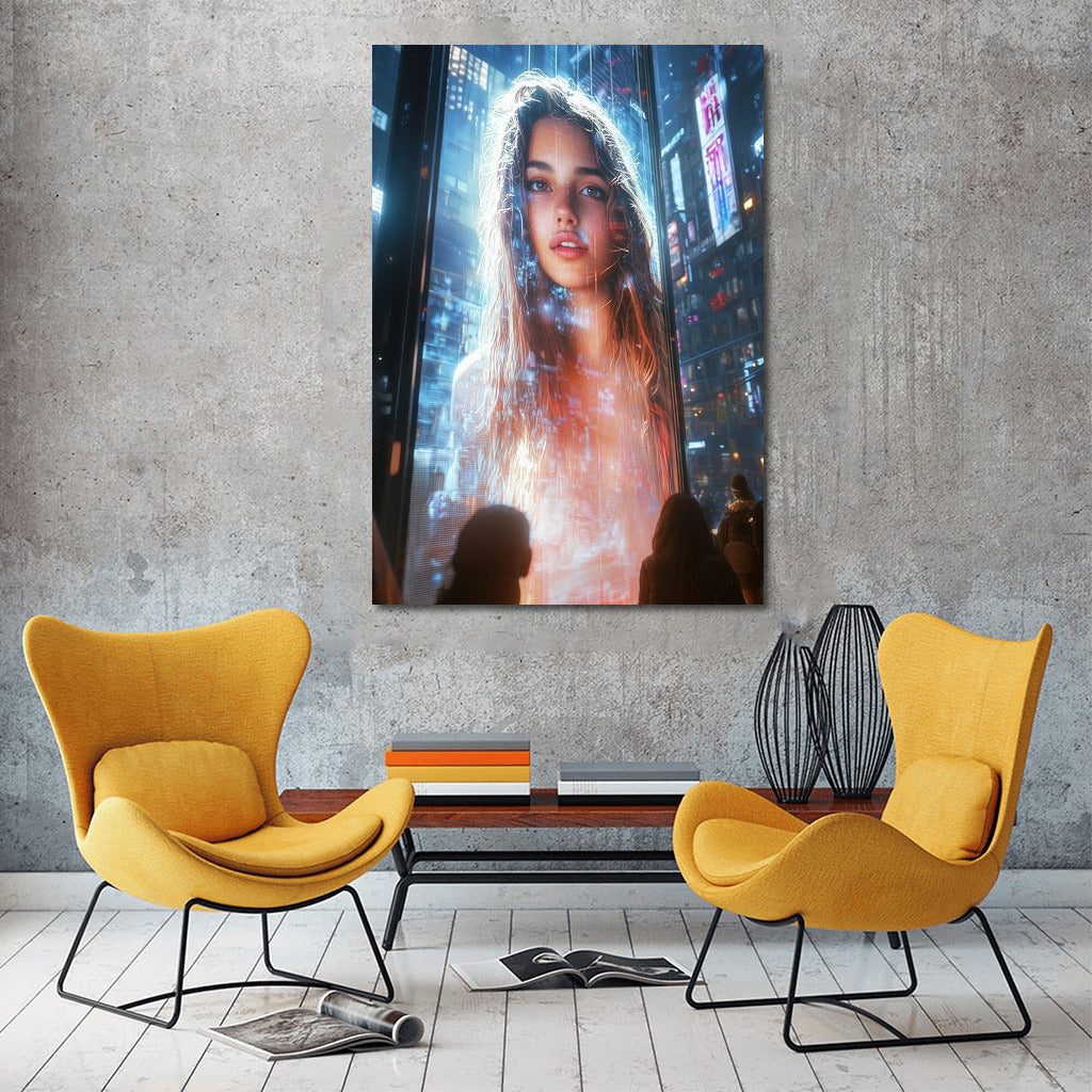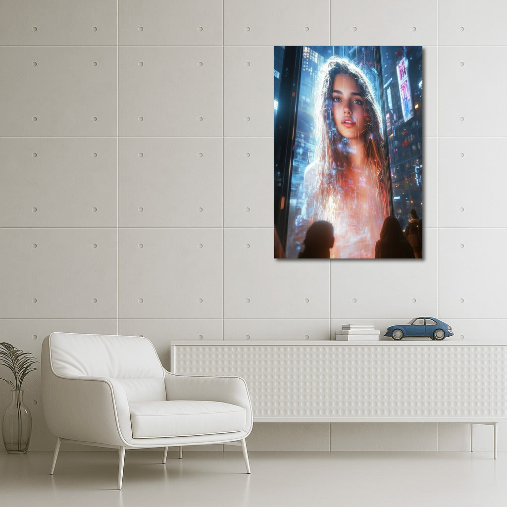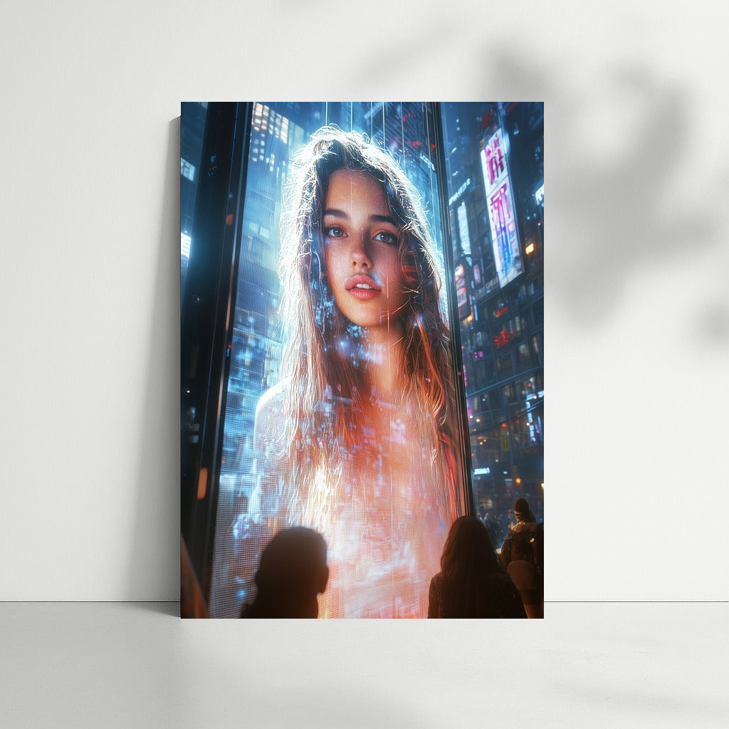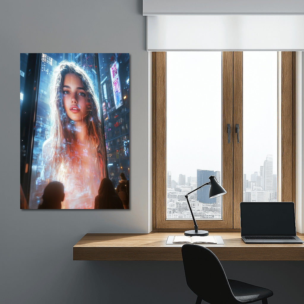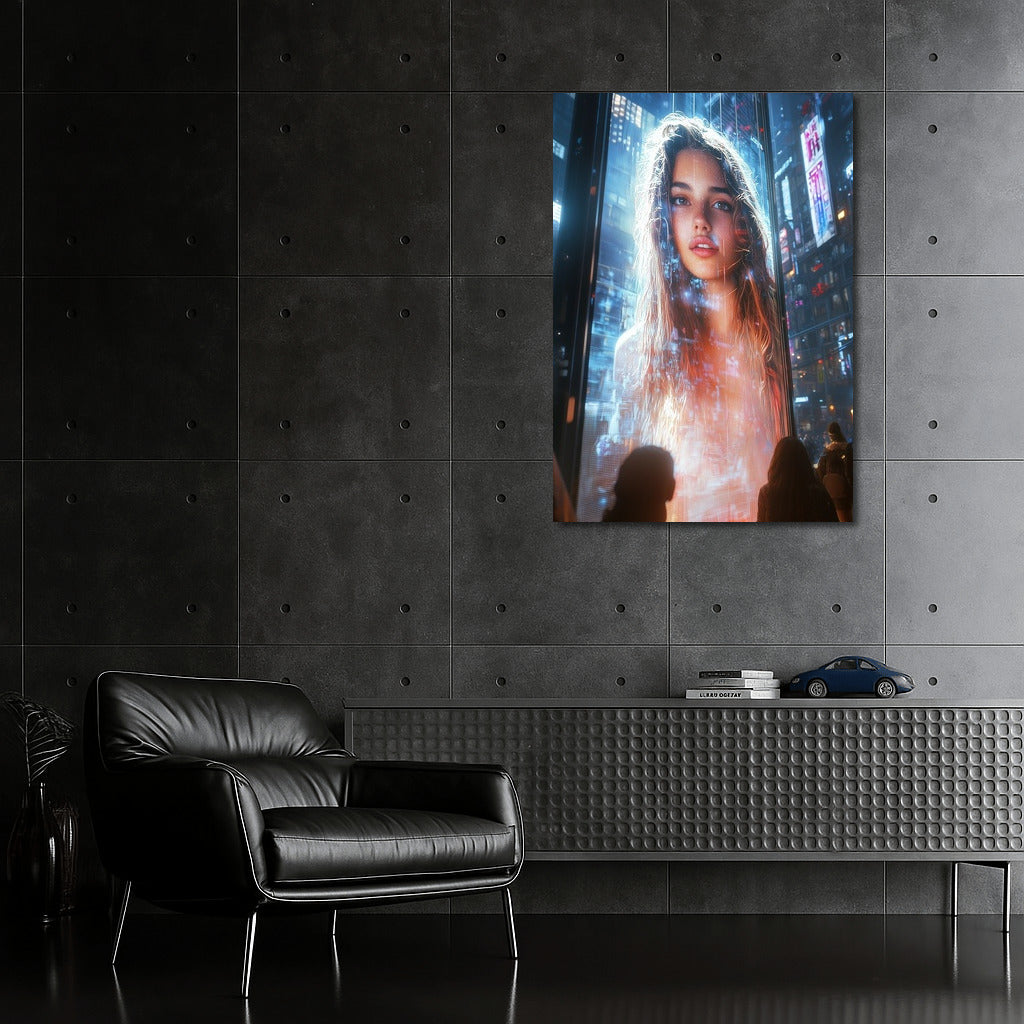 Cyberpunk meets art: a glowing poster brings a dream city to life, merging reality and fantasy in a unique wall art. See more from the collection: Mixed Wall Art