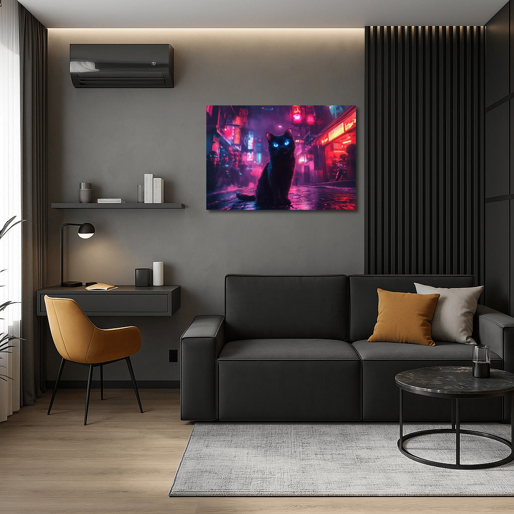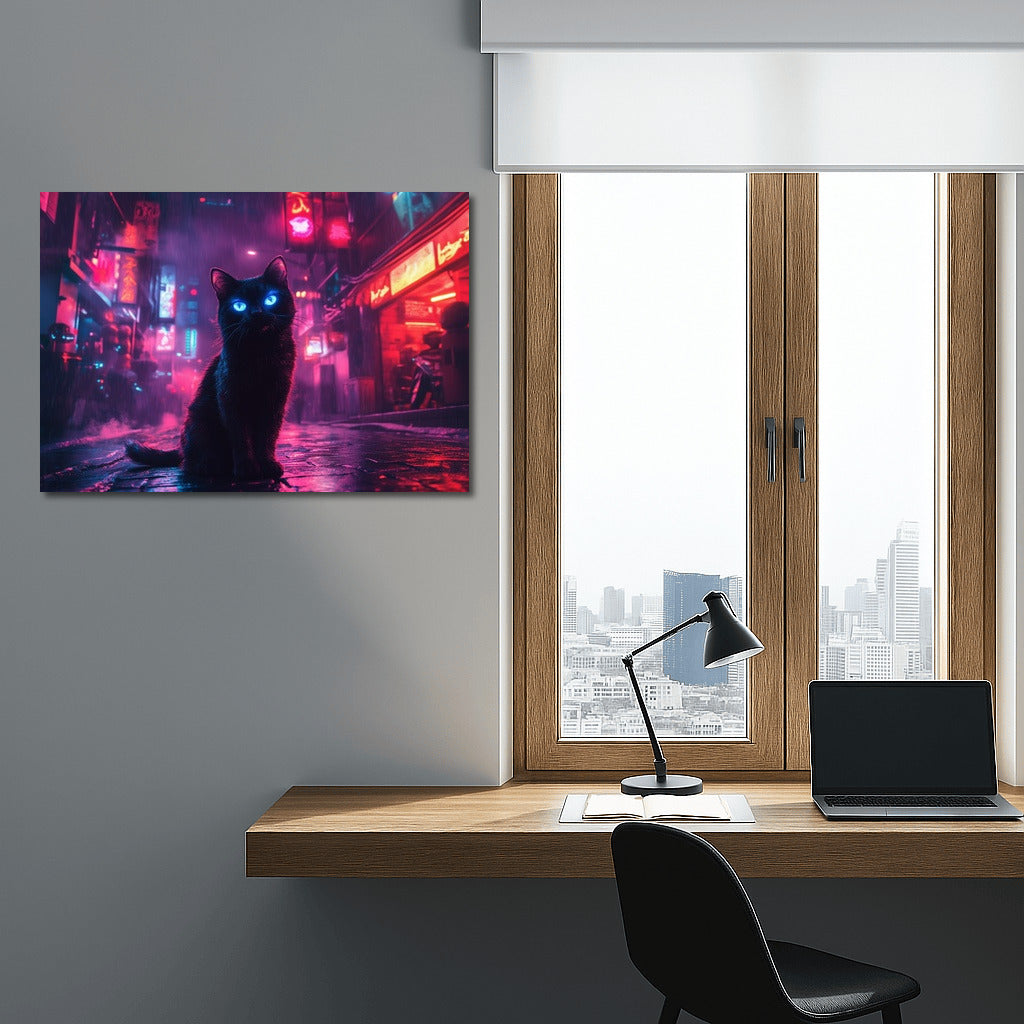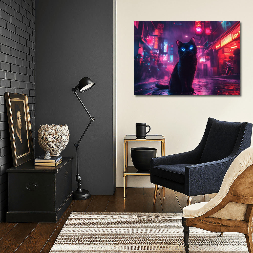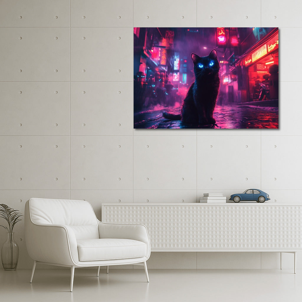 A mystical cat with bright eyes in the neon lights of the night city. The painting turns your walls into a portal to a fantasy world. See more from the collection: Neon Art