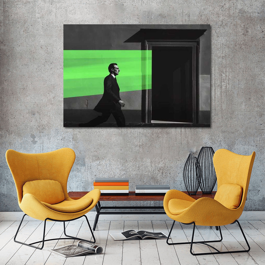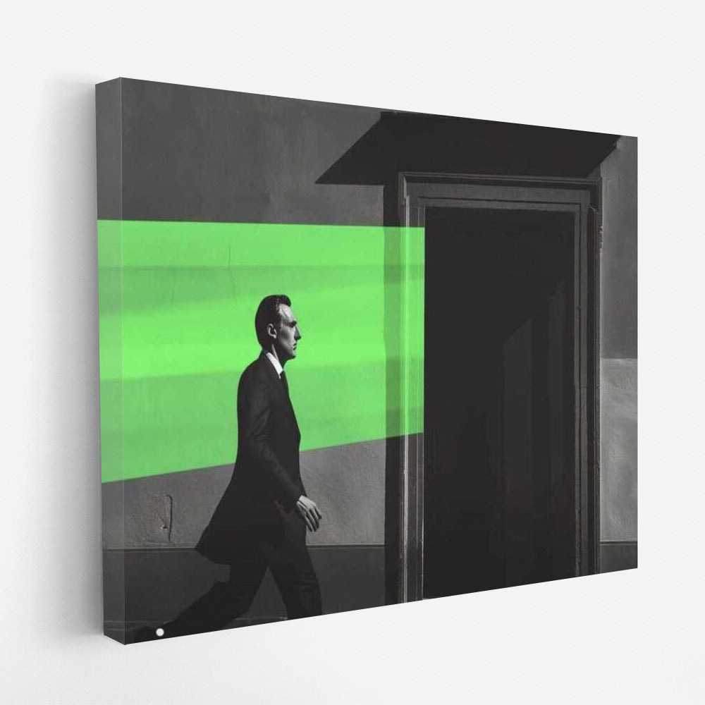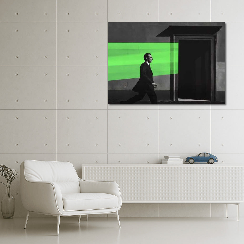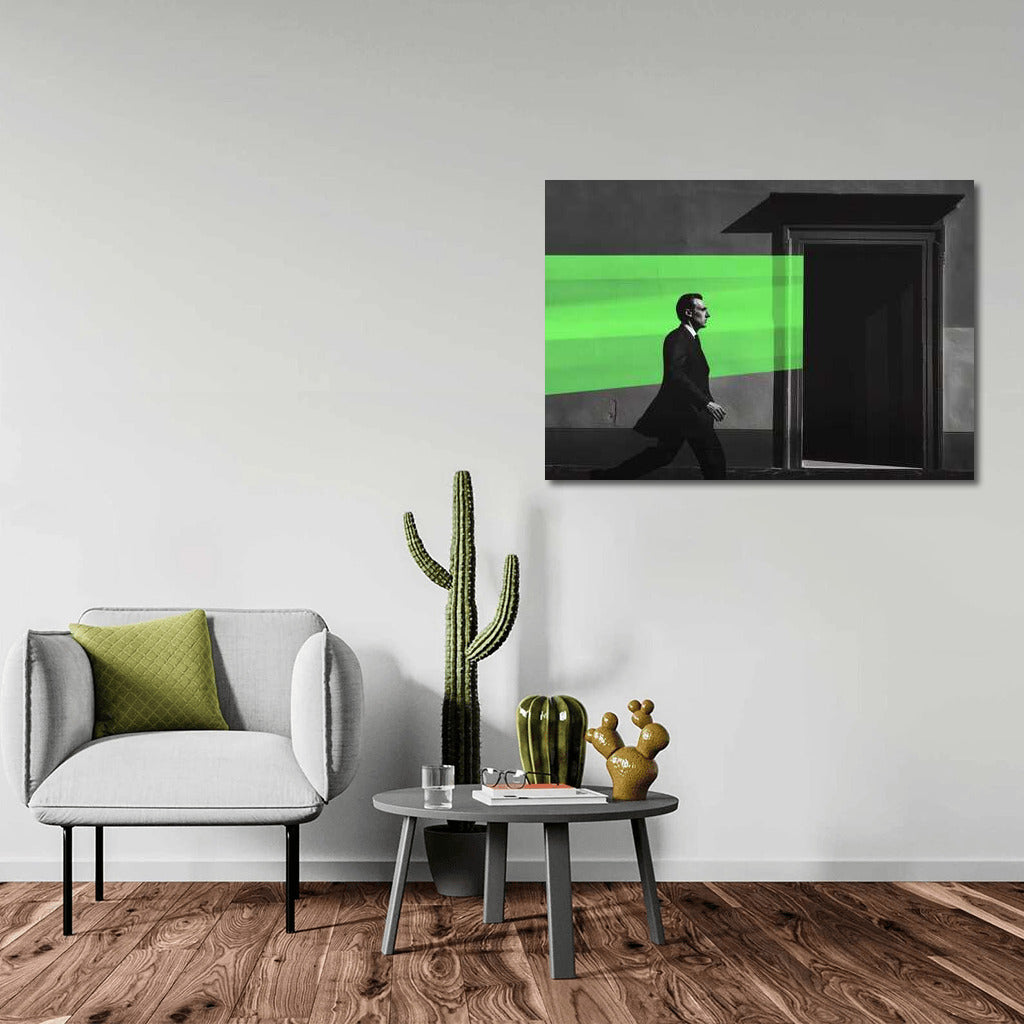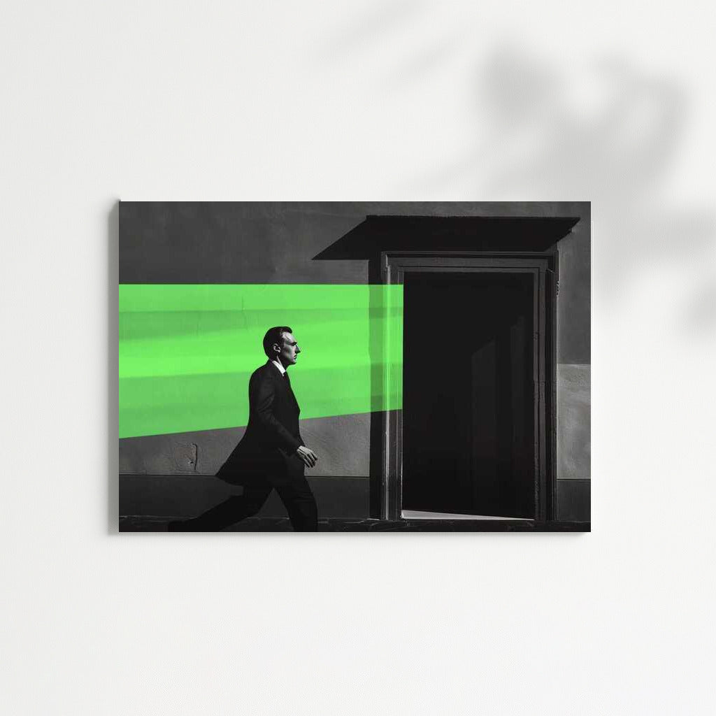 A man walks towards neon light, as if into a fairy tale. A surreal painting that will bring your wall art to life. See more from the collection: Surreal Art