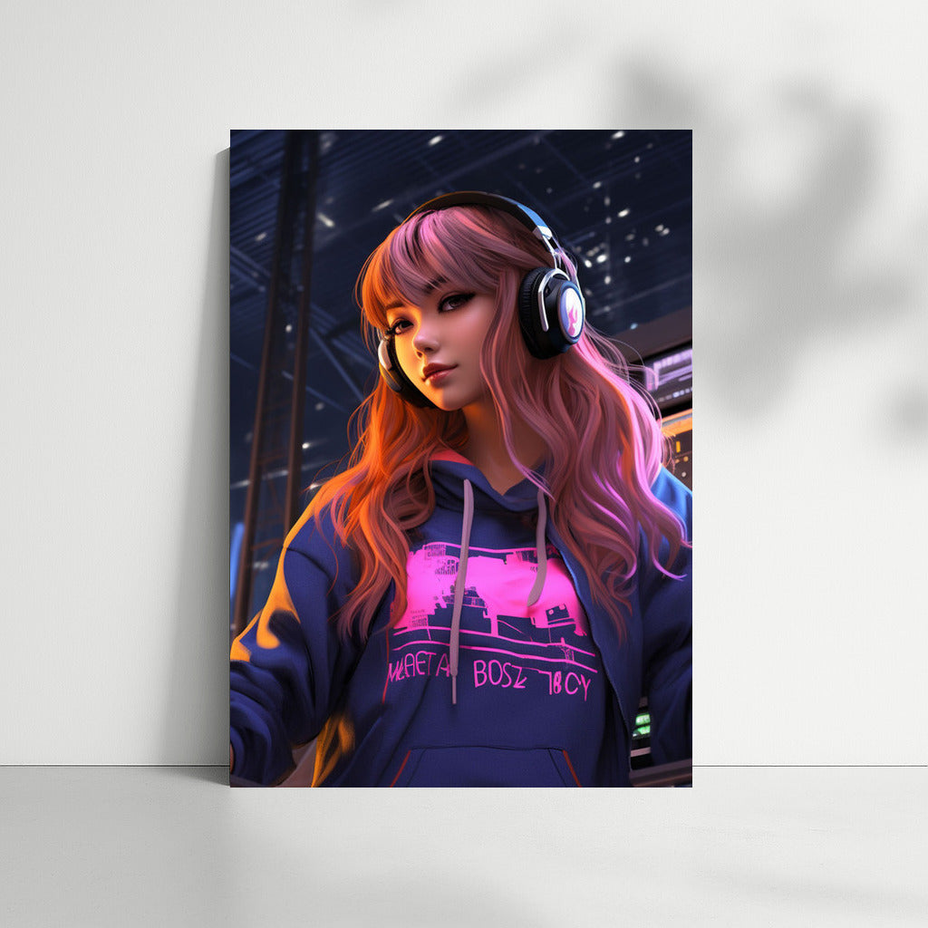 Neon Fantasy: Anime Girl in the World of Bright Lights Wall Art