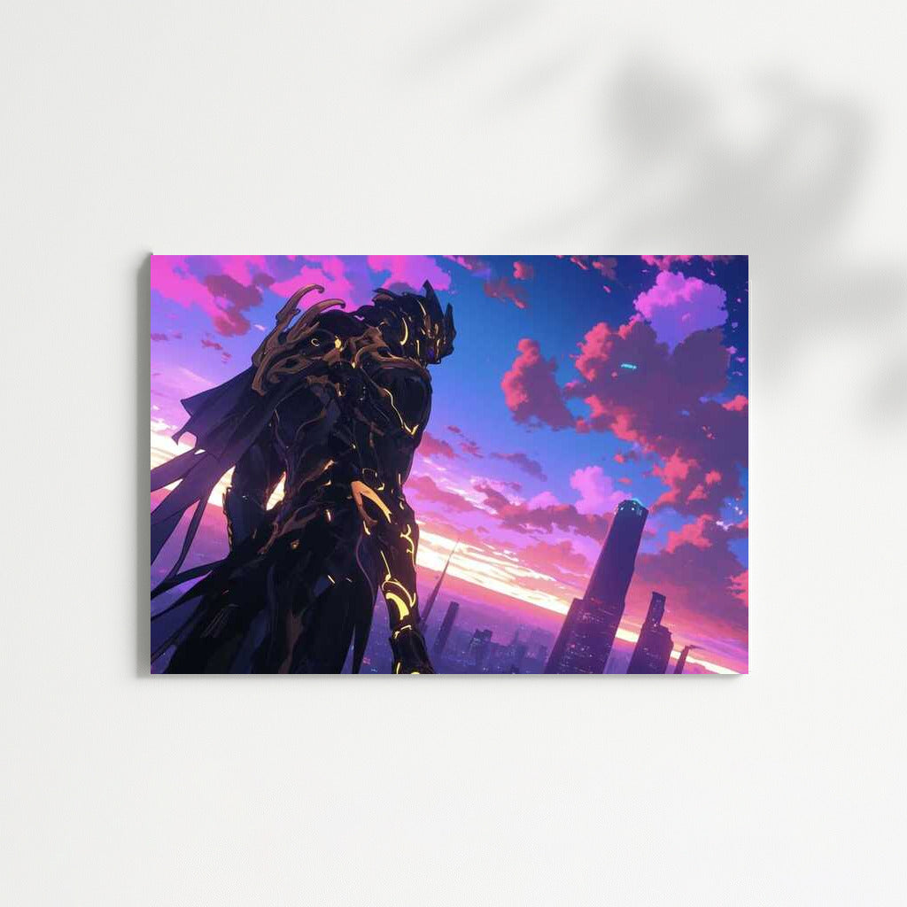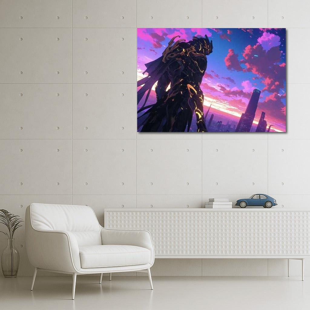 Dive into a world of dark fantasy with this captivating painting: a mysterious guardian against a neon sunset. Wall art comes to life! See more from the collection: Fantasy Art