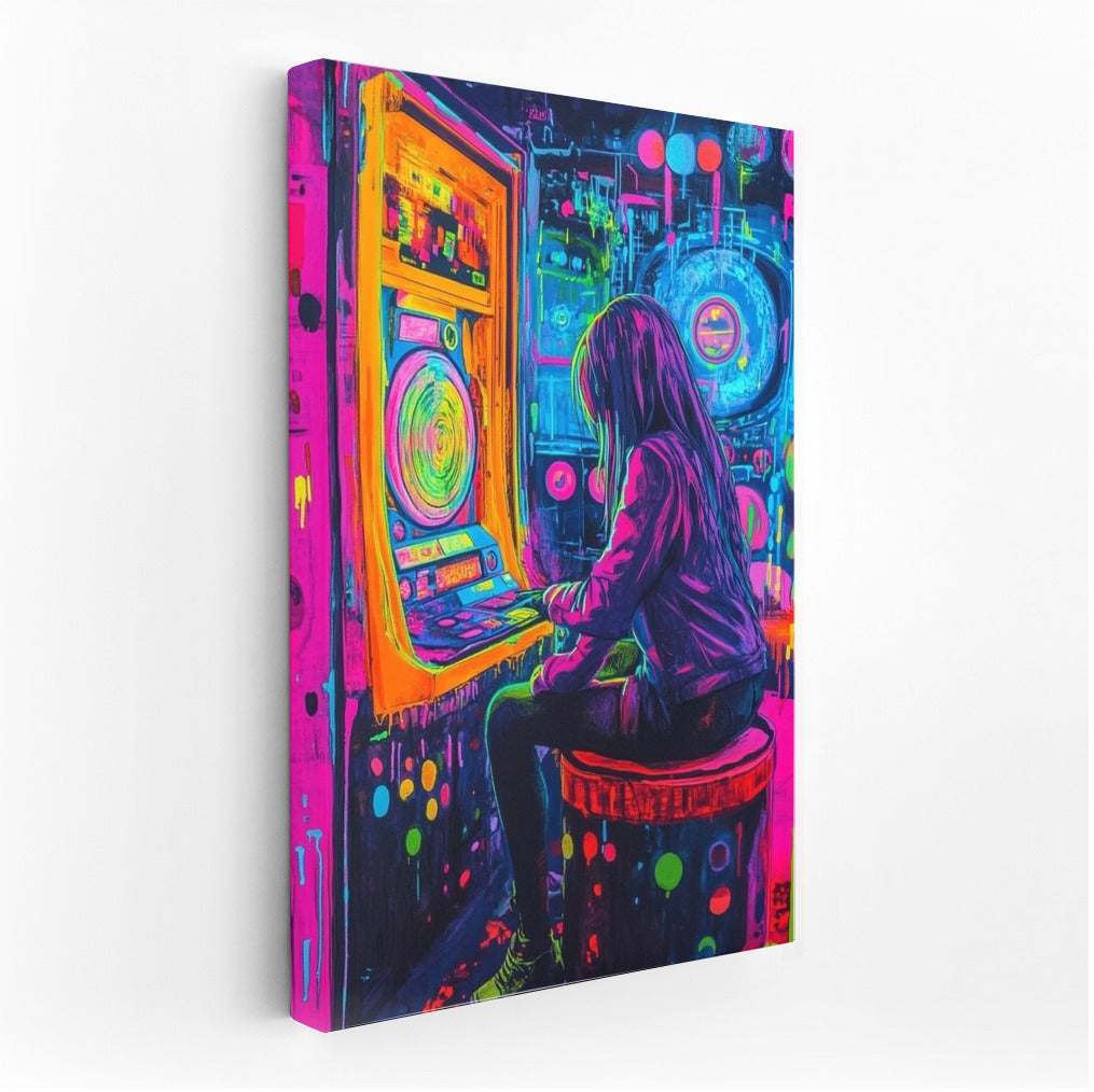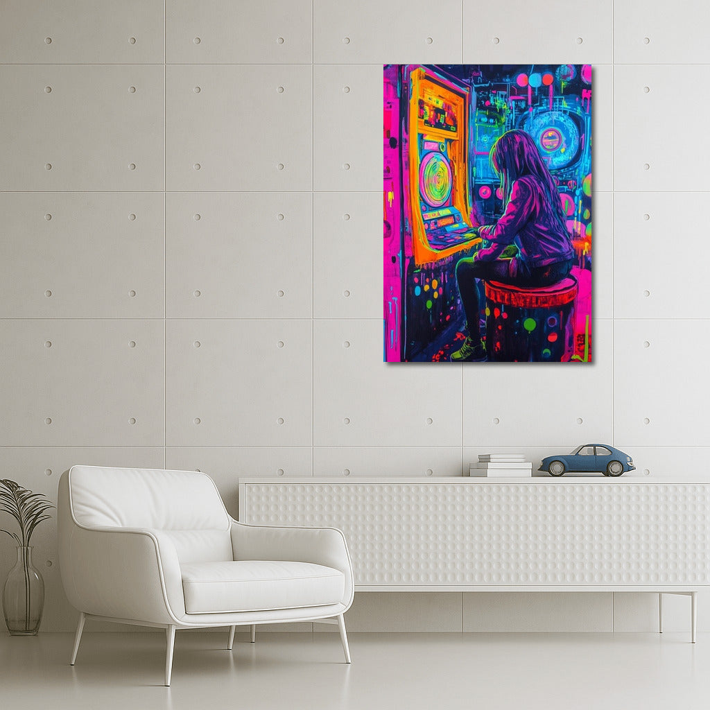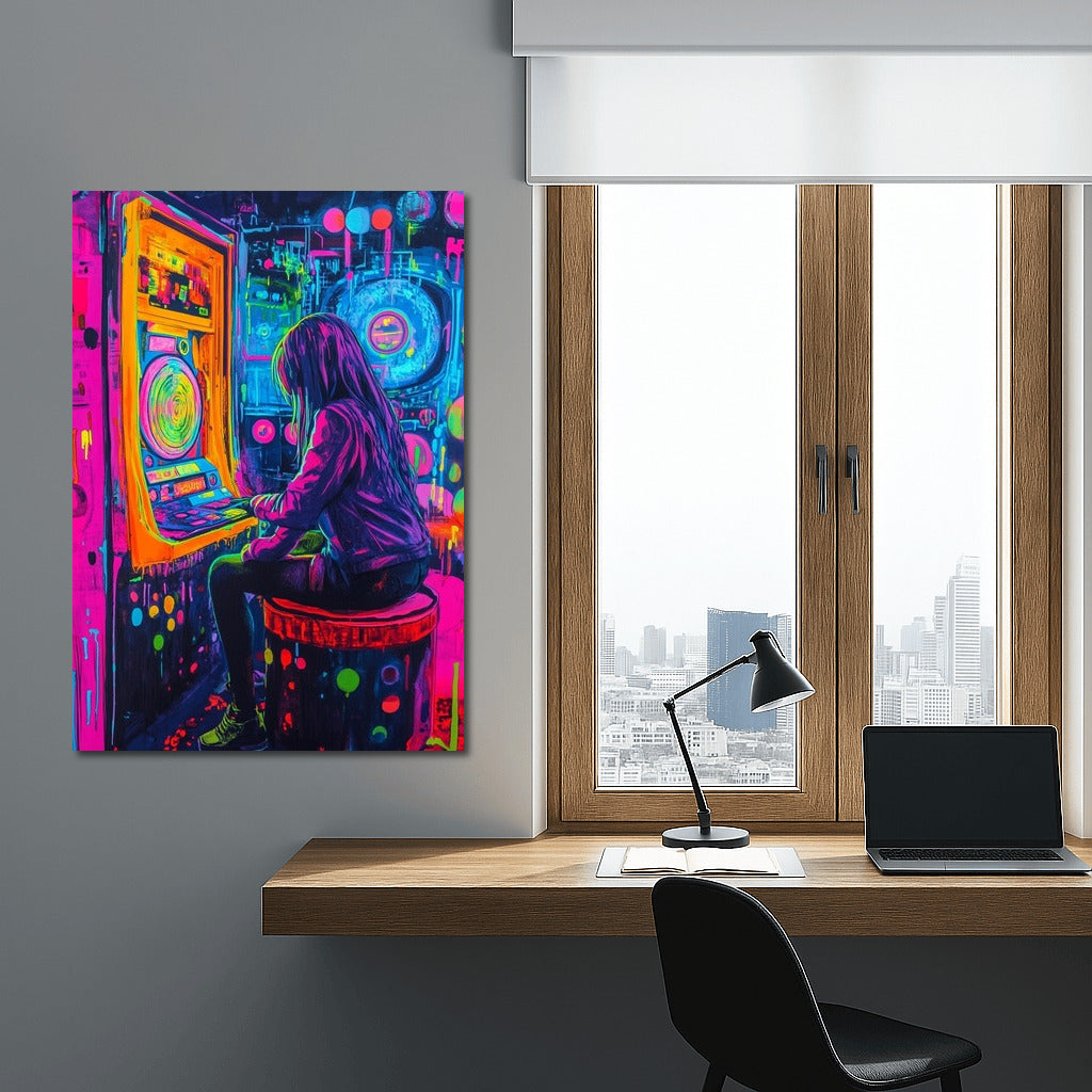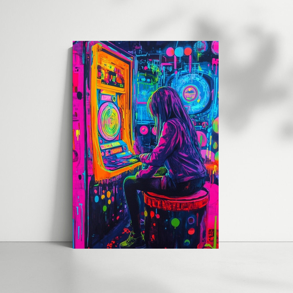 A bright poster in neon colors: a neutral figure and a retro slot machine create an atmosphere of cyberpunk and nostalgia. See more from the collection: Neon Art