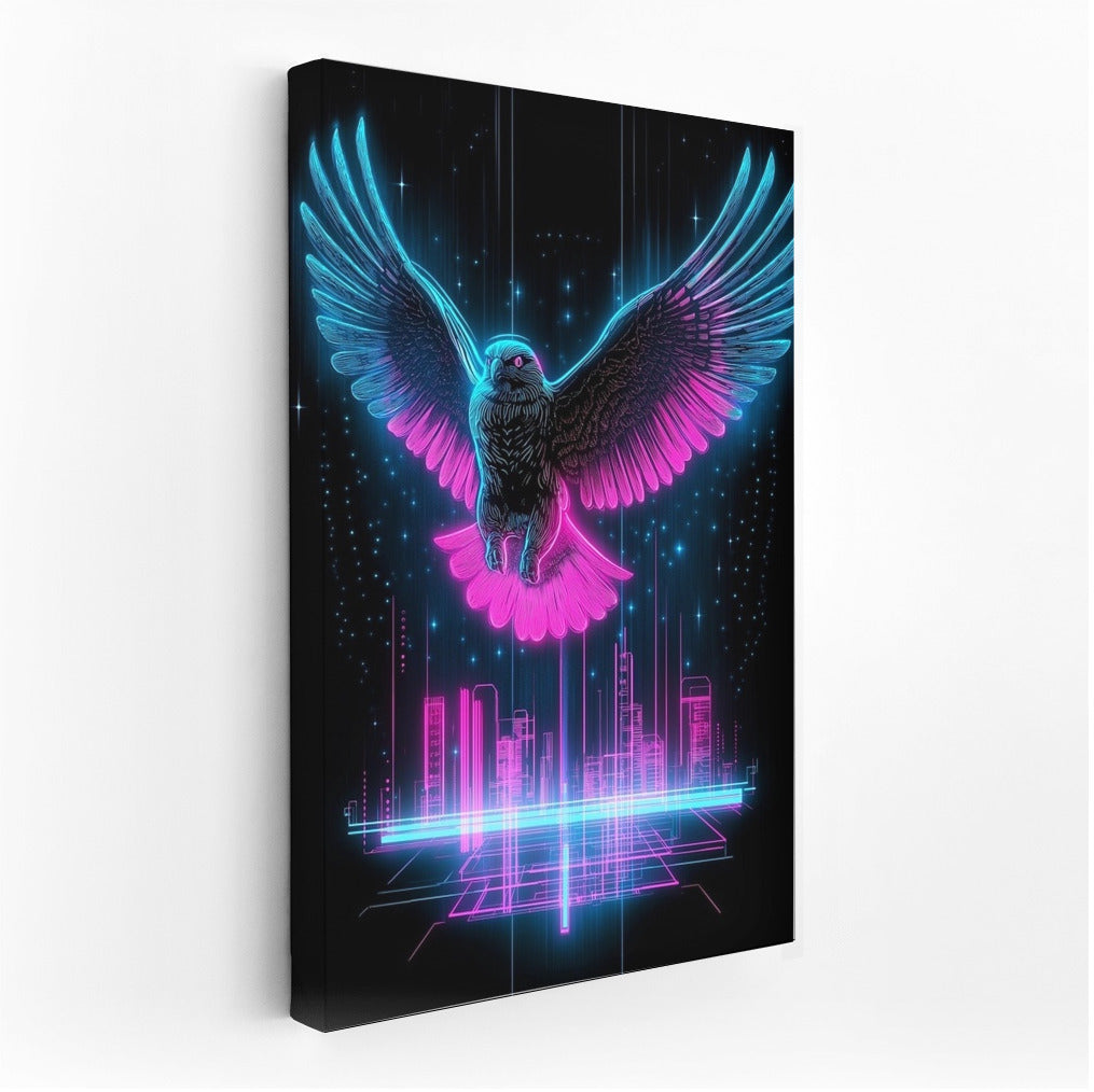 A vibrant poster featuring a neon falcon over a futuristic city. Add some cosmic energy to your wall art! See more from the collection: Neon Art