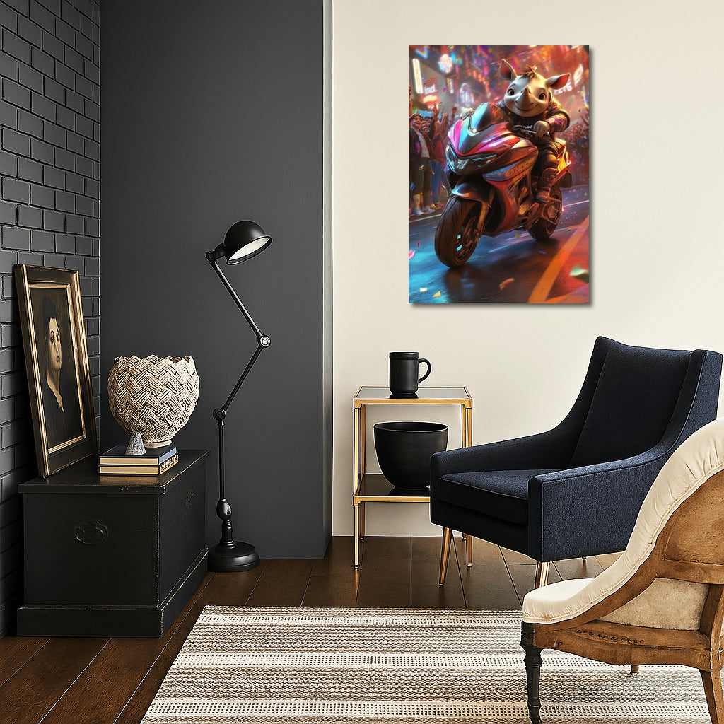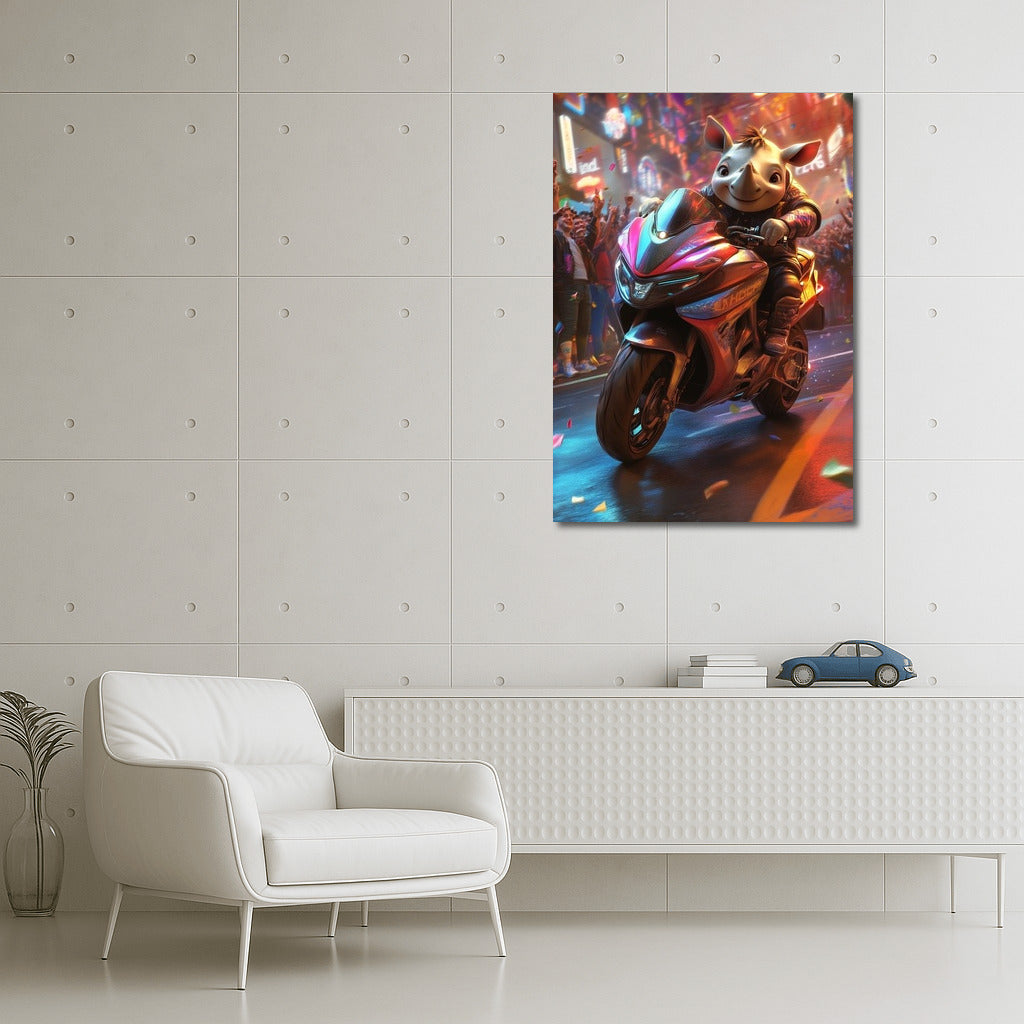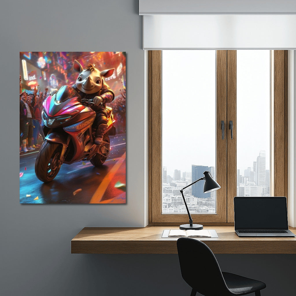 Unique poster: an unreal creature on a bright superbike rushes through the neon lights of the city. Wall art with movement! See more from the collection: Cartoon Art