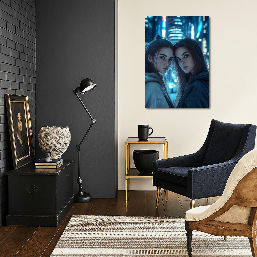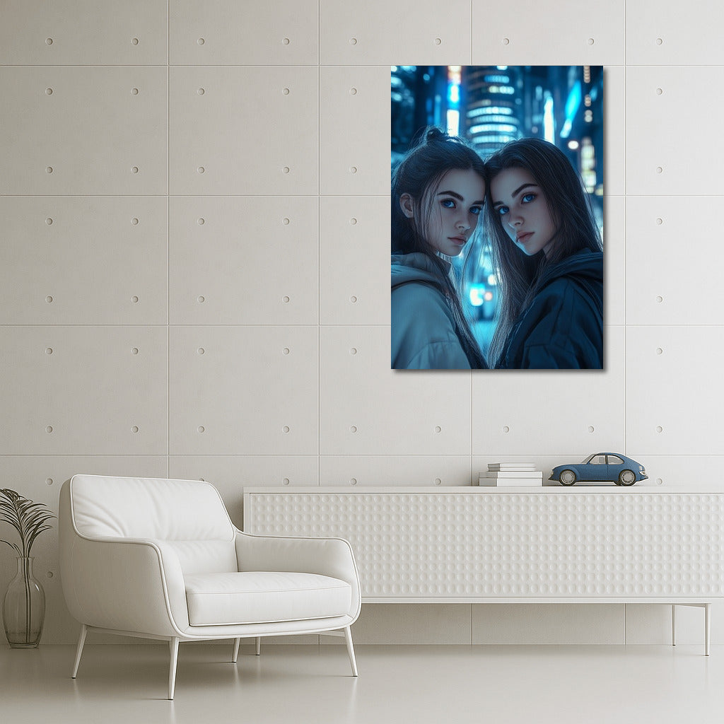 Bright poster art: two mysterious figures in the light of a neon metropolis. A modern painting for a stylish interior. See more from the collection: Wall Art with Women