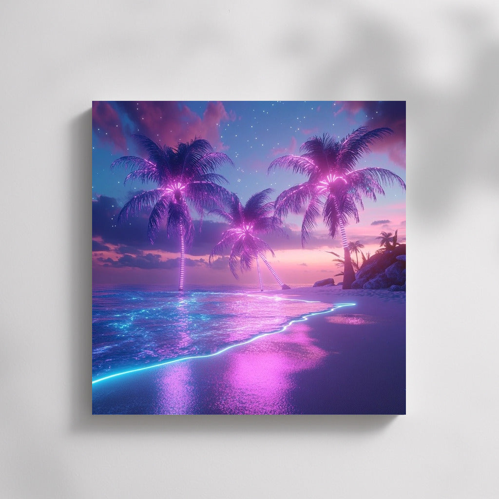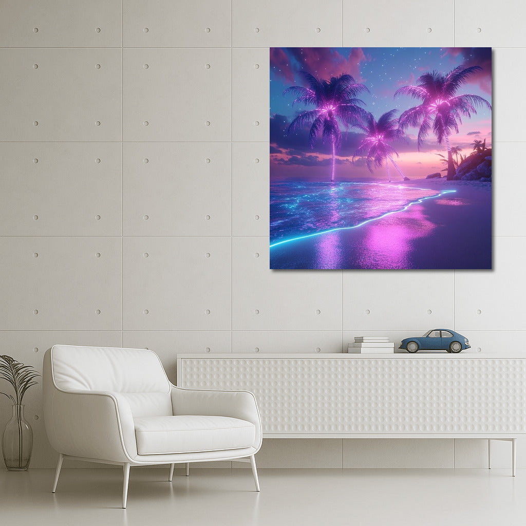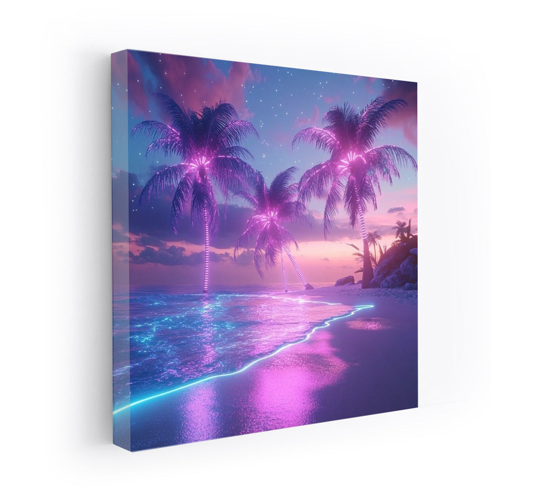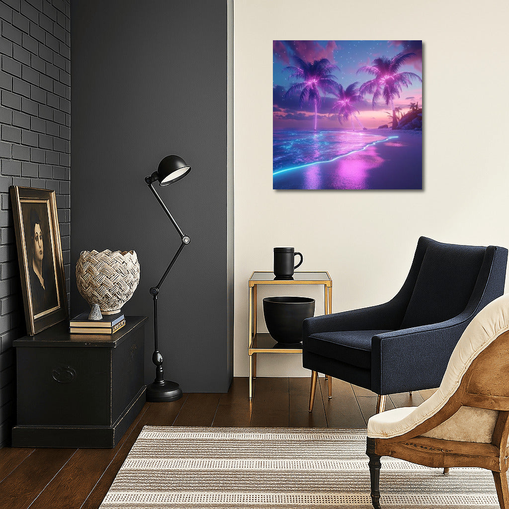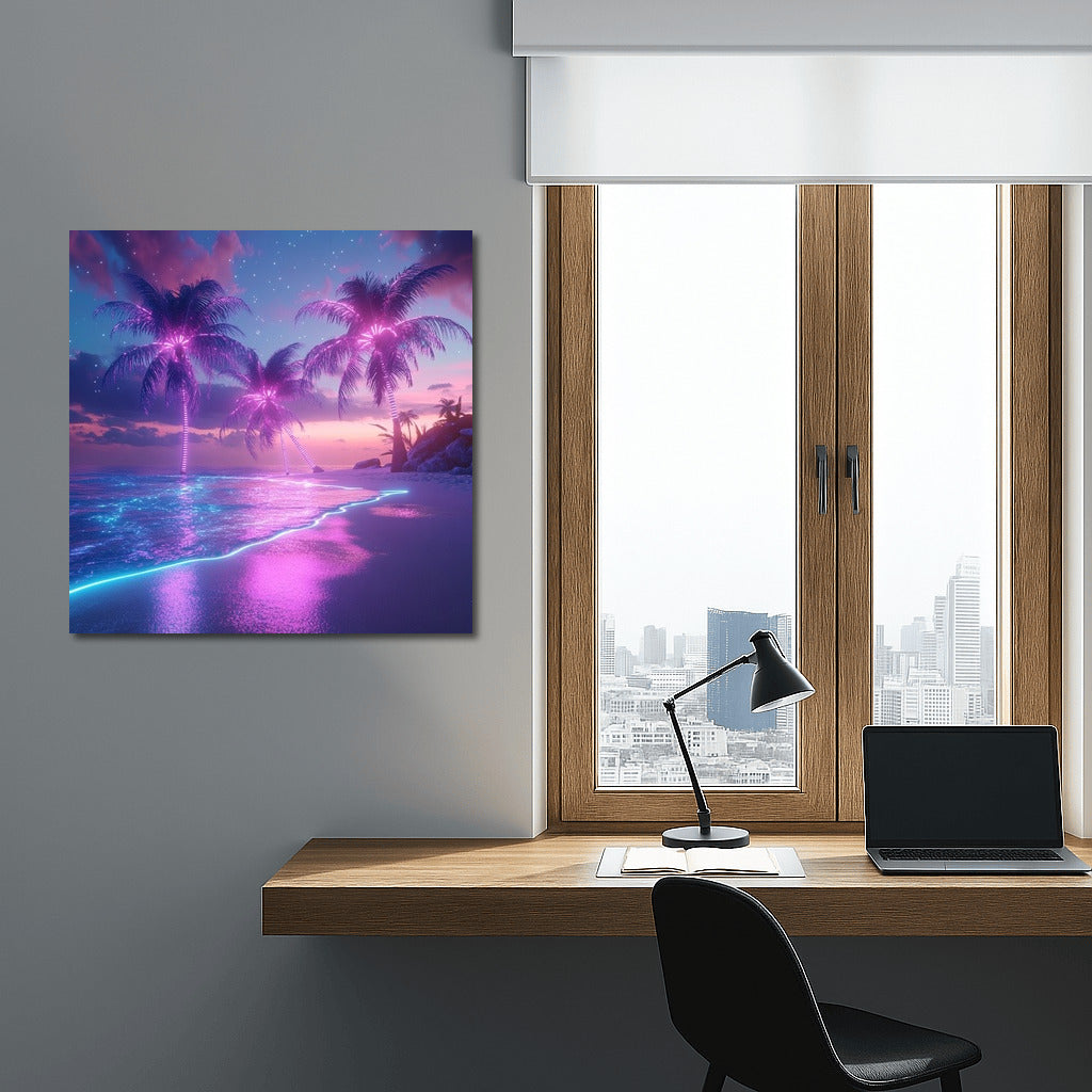 Dive into the dreamy world of this painting: neon sunset, palm trees by the sea. Perfect wall art for inspiration and relaxation! See more from the collection: Neon Art