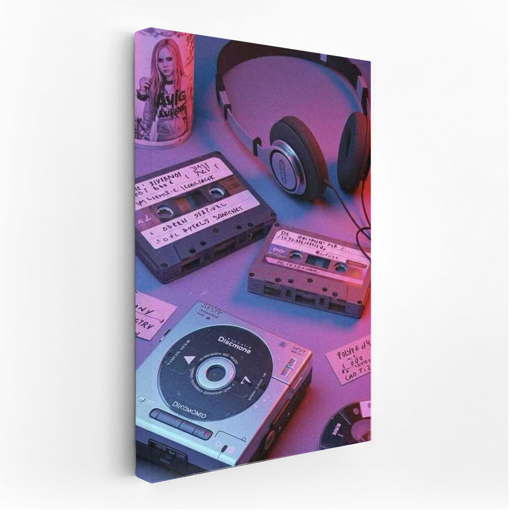 Neon Symphony: Cassettes and Discman in Retro 80s Style Wall Art