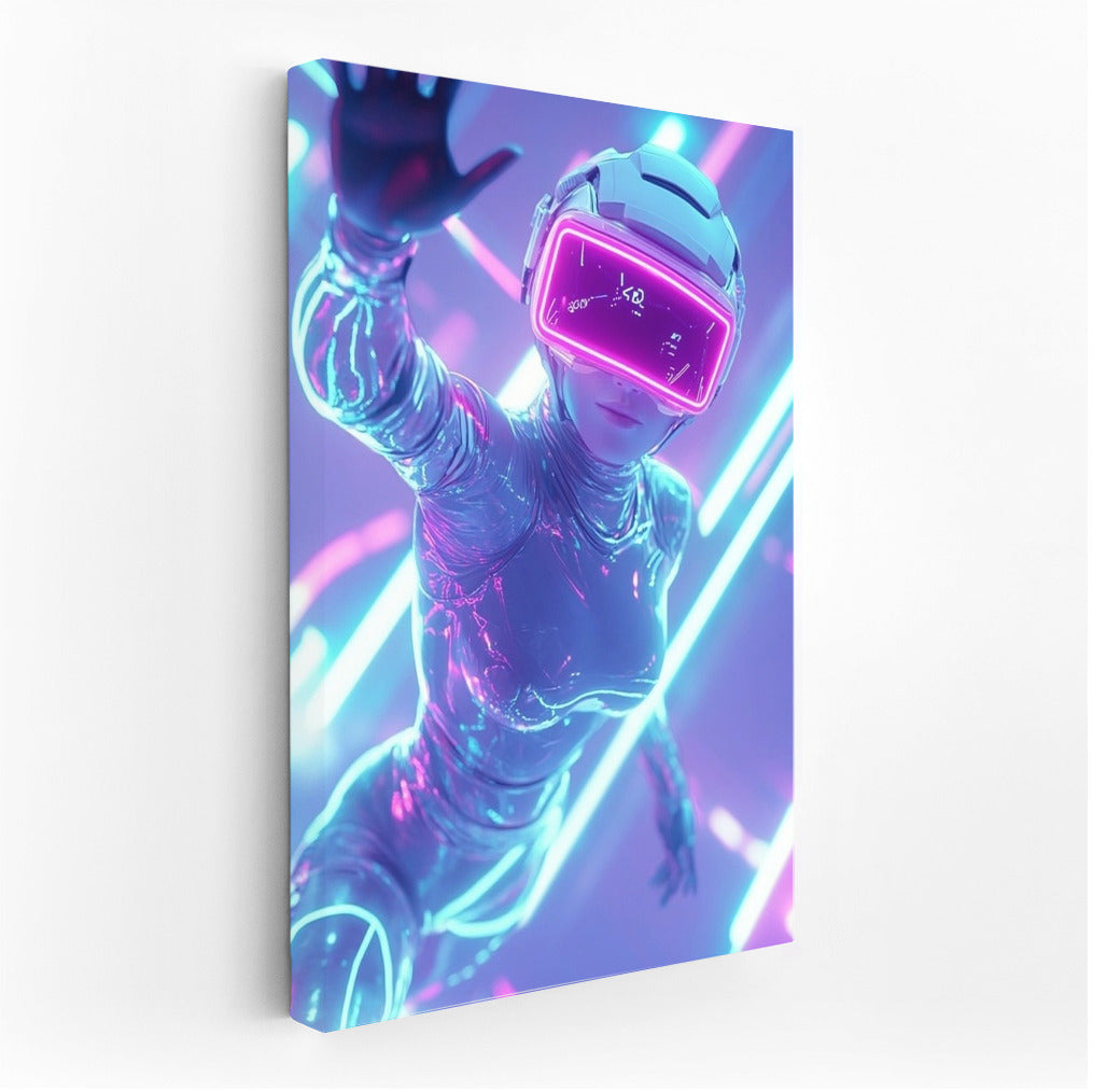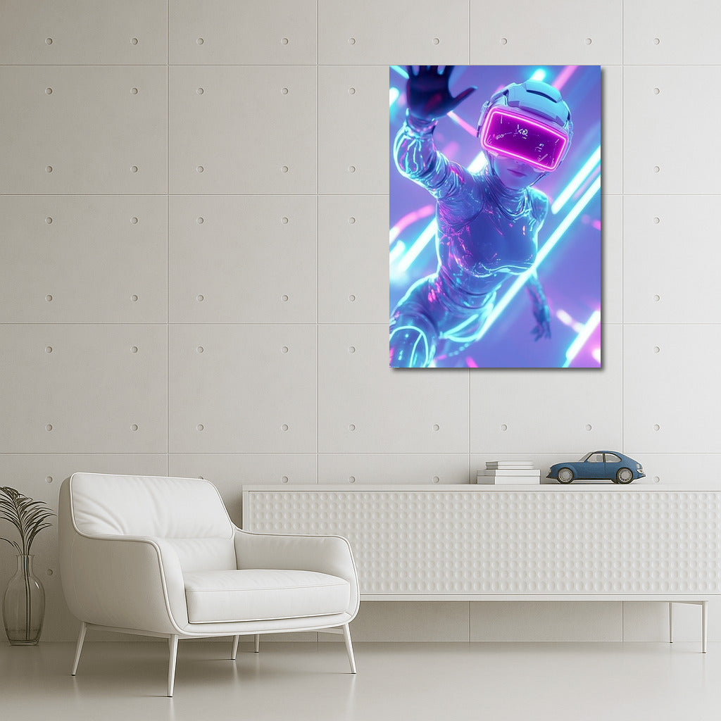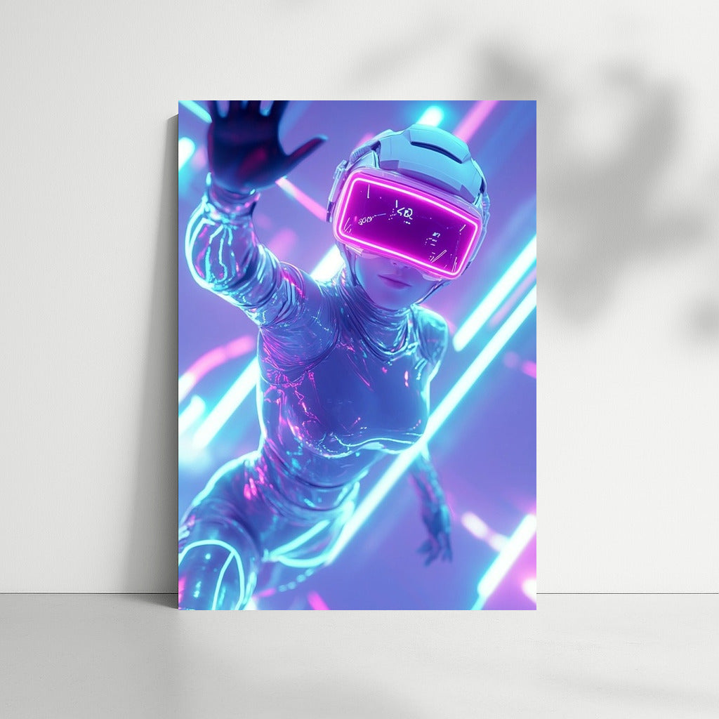 The virtual world comes to life on the poster: a figure in a futuristic suit and VR helmet invites you into the neon reality of wall art. See more from the collection: Neon Art