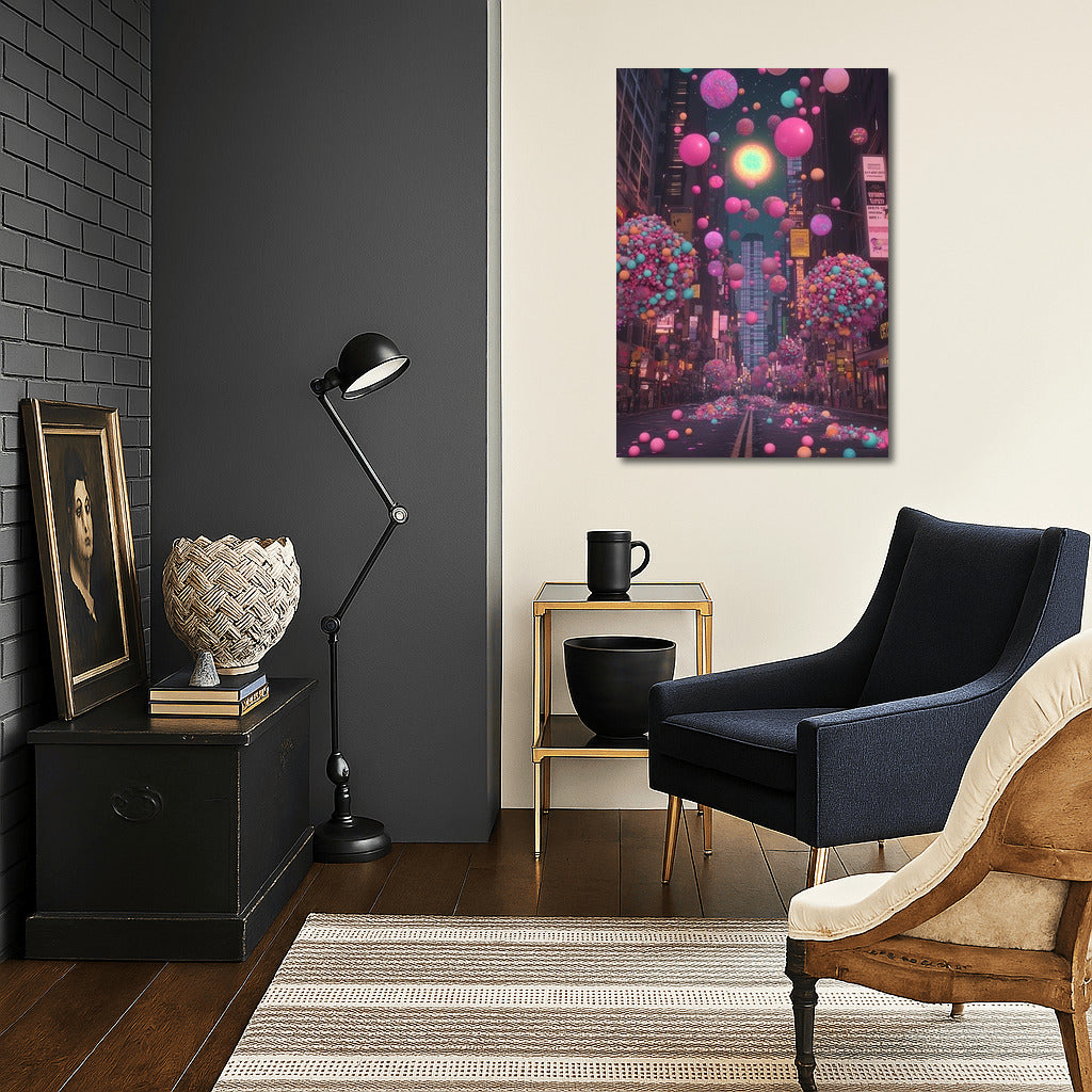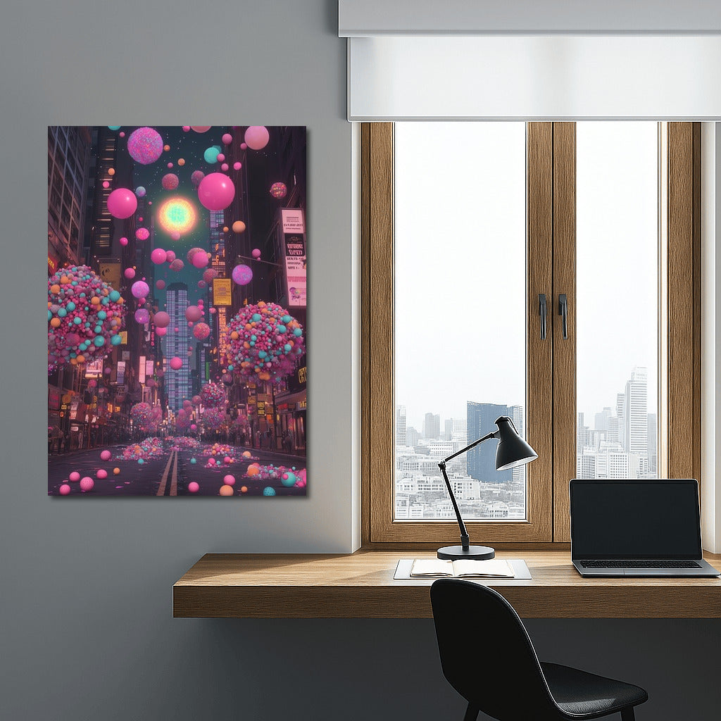 Vibrant Poster: City magic and neon balls create unique wall art to bring your room to life. See more from the collection: Mixed Wall Art