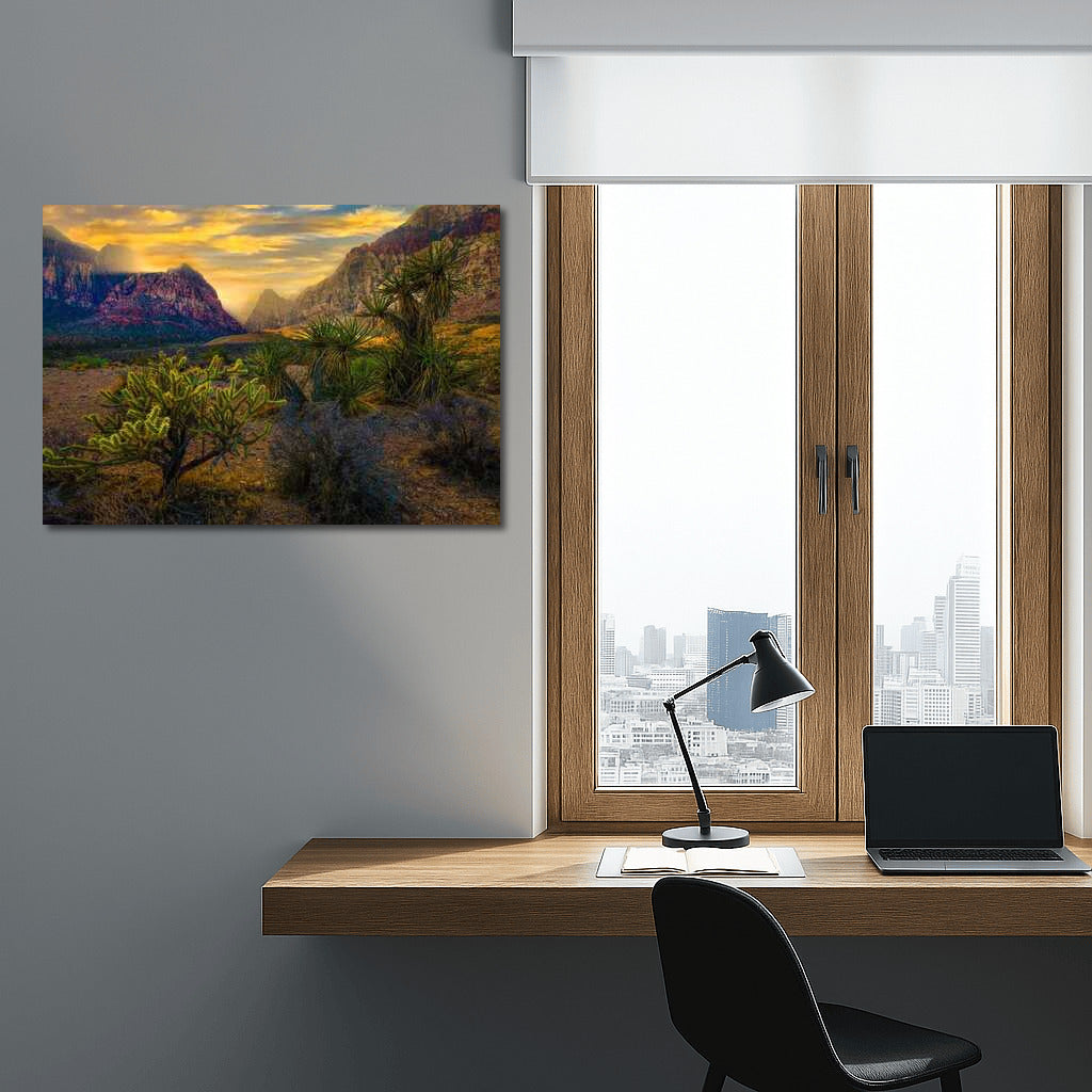 Immerse yourself in the magic of the Nevada desert with this scenic painting. Warm tones and the grandeur of nature for your interior. See more from the collection: Country Art