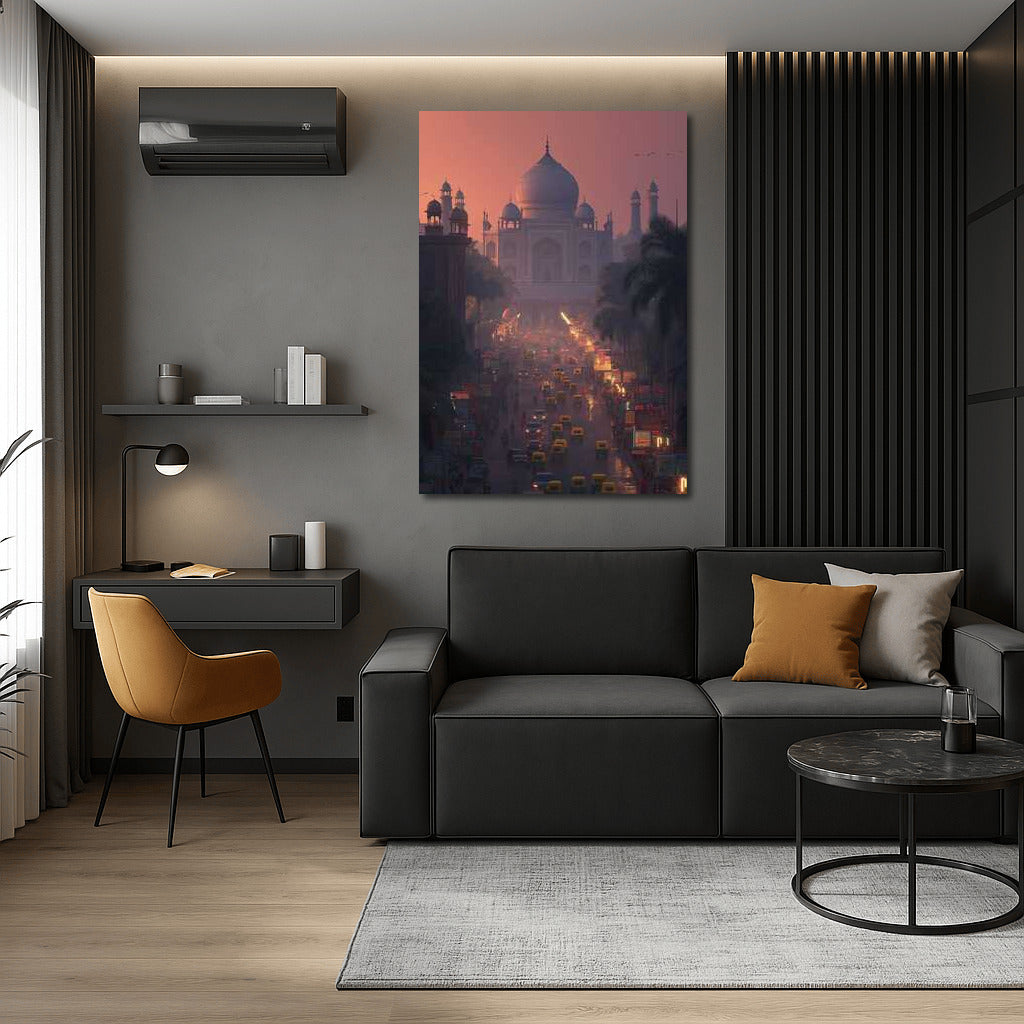 Sunset in New Delhi comes alive in this painting. The cityscape and majestic silhouette make for perfect wall art. See more from the collection: Cityscapes & Skylines Art