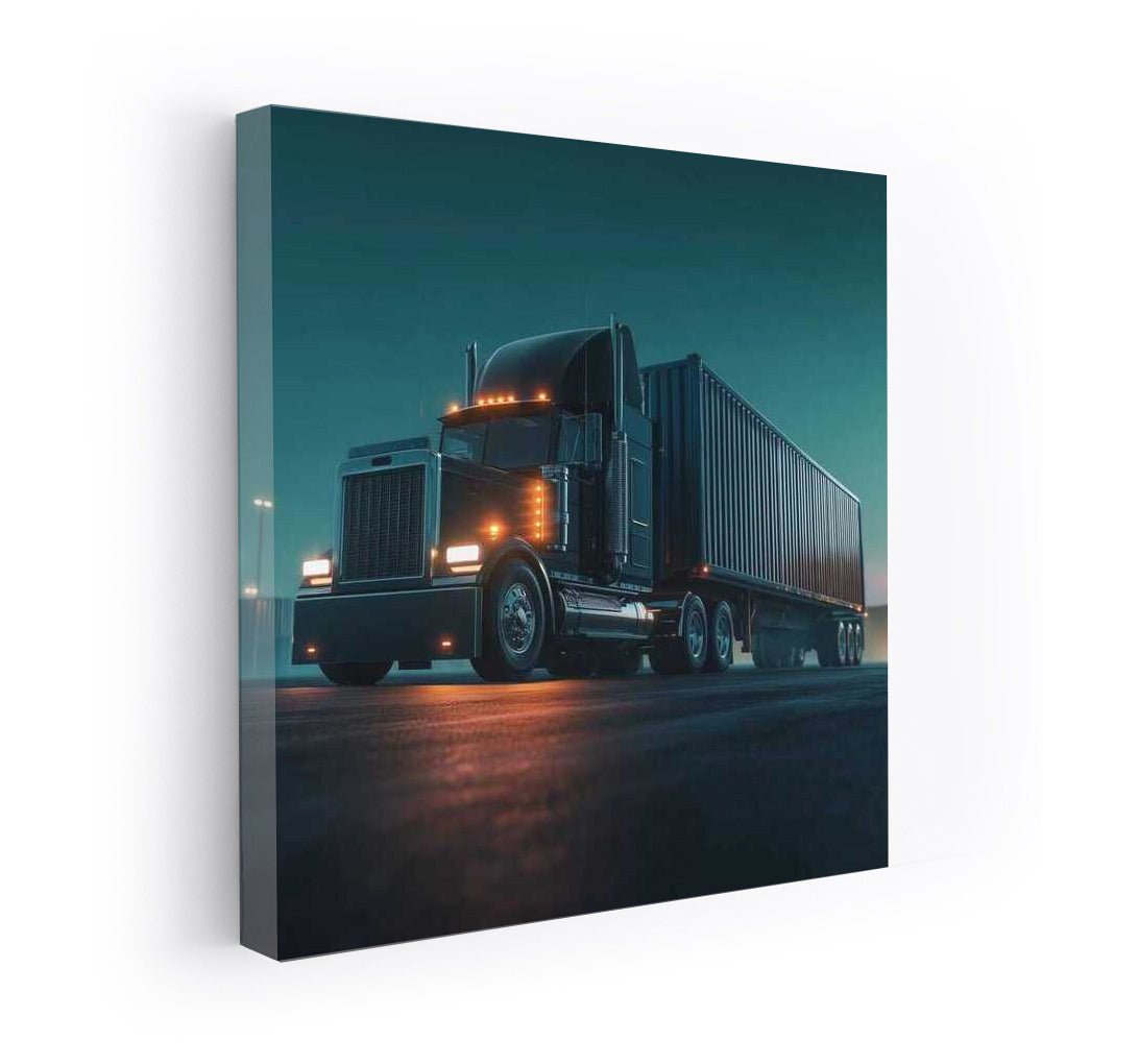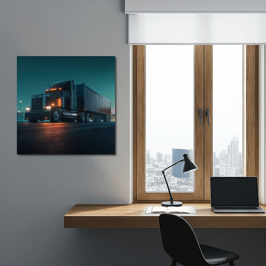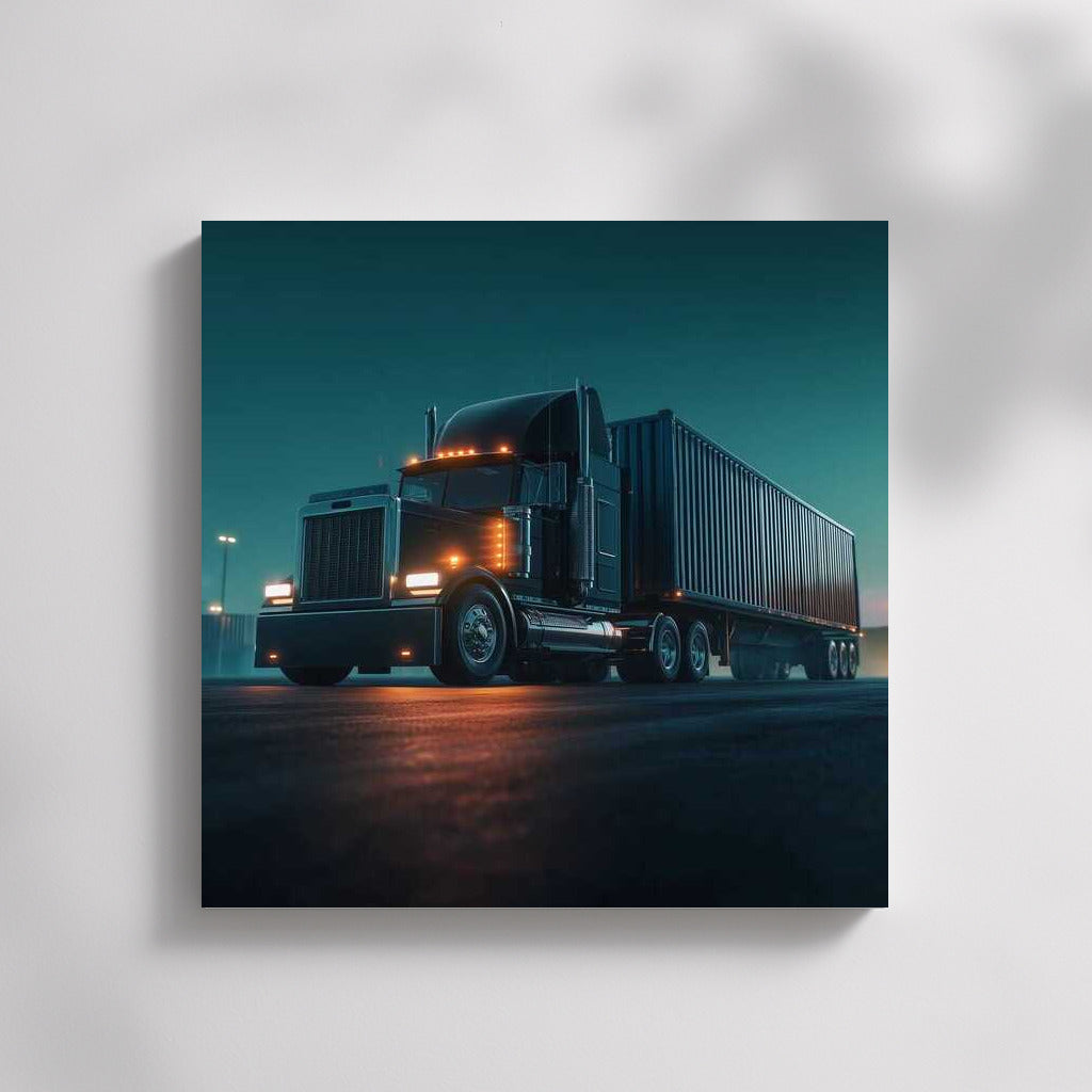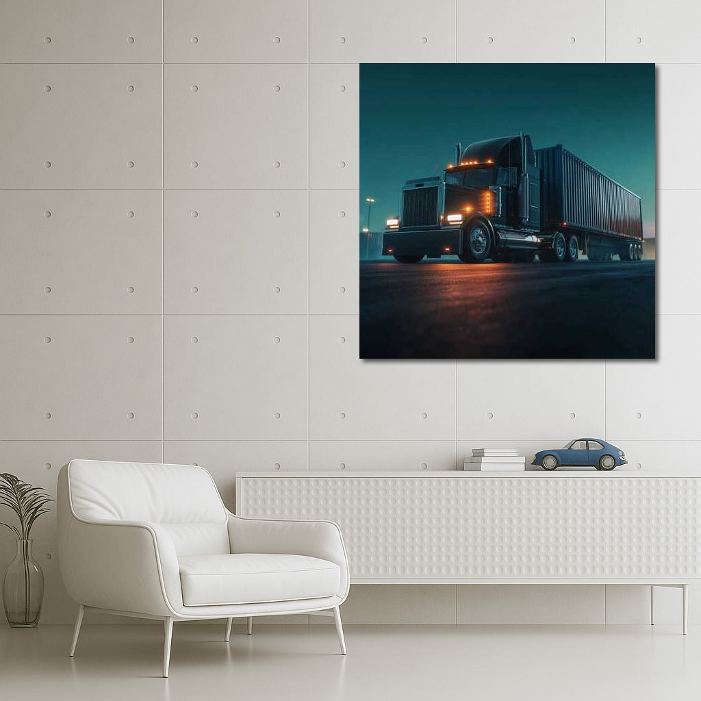 A powerful truck cuts through the night with the glow of lights. The poster brings to life the passion for travel and the power of transport. See more from the collection: Transport Art