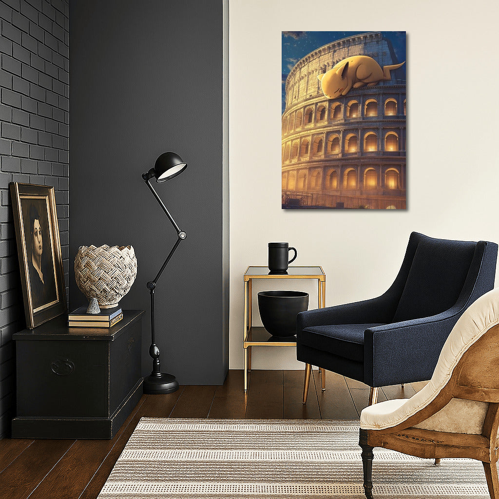 The Colosseum at night and a fantastic creature sleeping peacefully on its arches. A unique poster for your wall art. See more from the collection: Mixed Wall Art