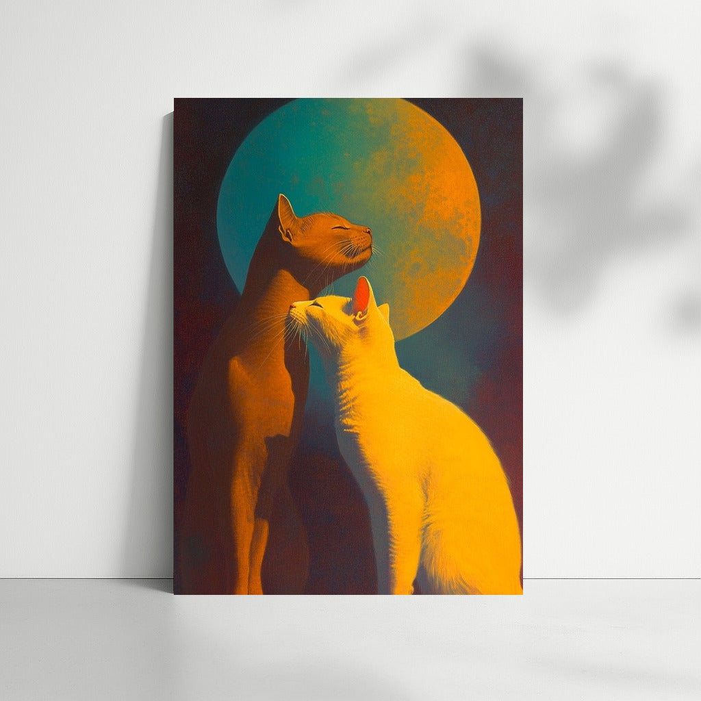Moon Magic: A poster of two cats against a full moon creating an atmosphere of harmony. Perfect wall art. See more from the collection: Animals Art