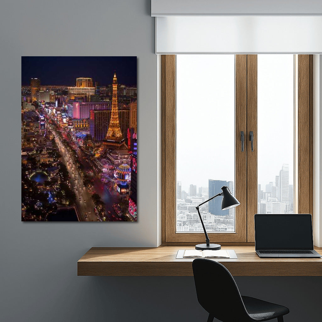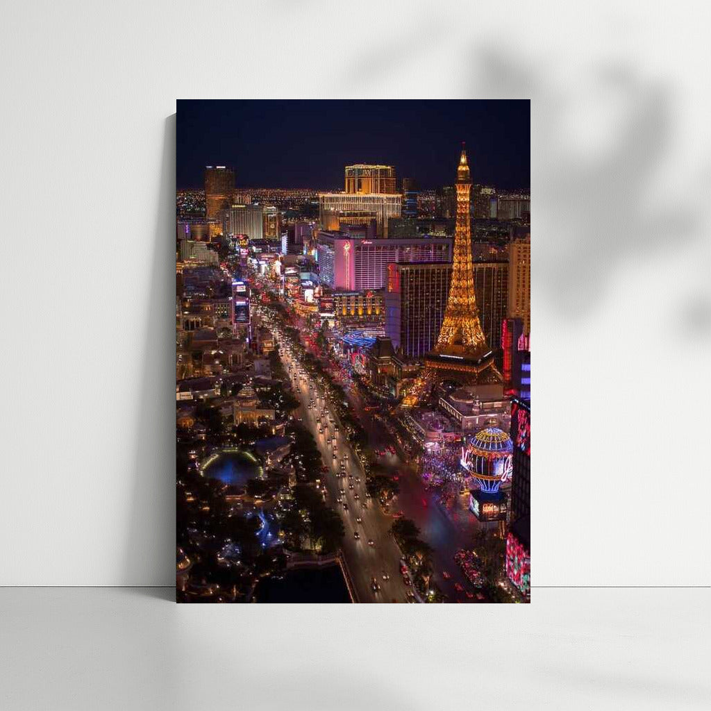 The bright magic of night Las Vegas in a captivating Skyline poster for your interior. Wall art full of lights and life. See more from the collection: Cityscapes & Skylines Art