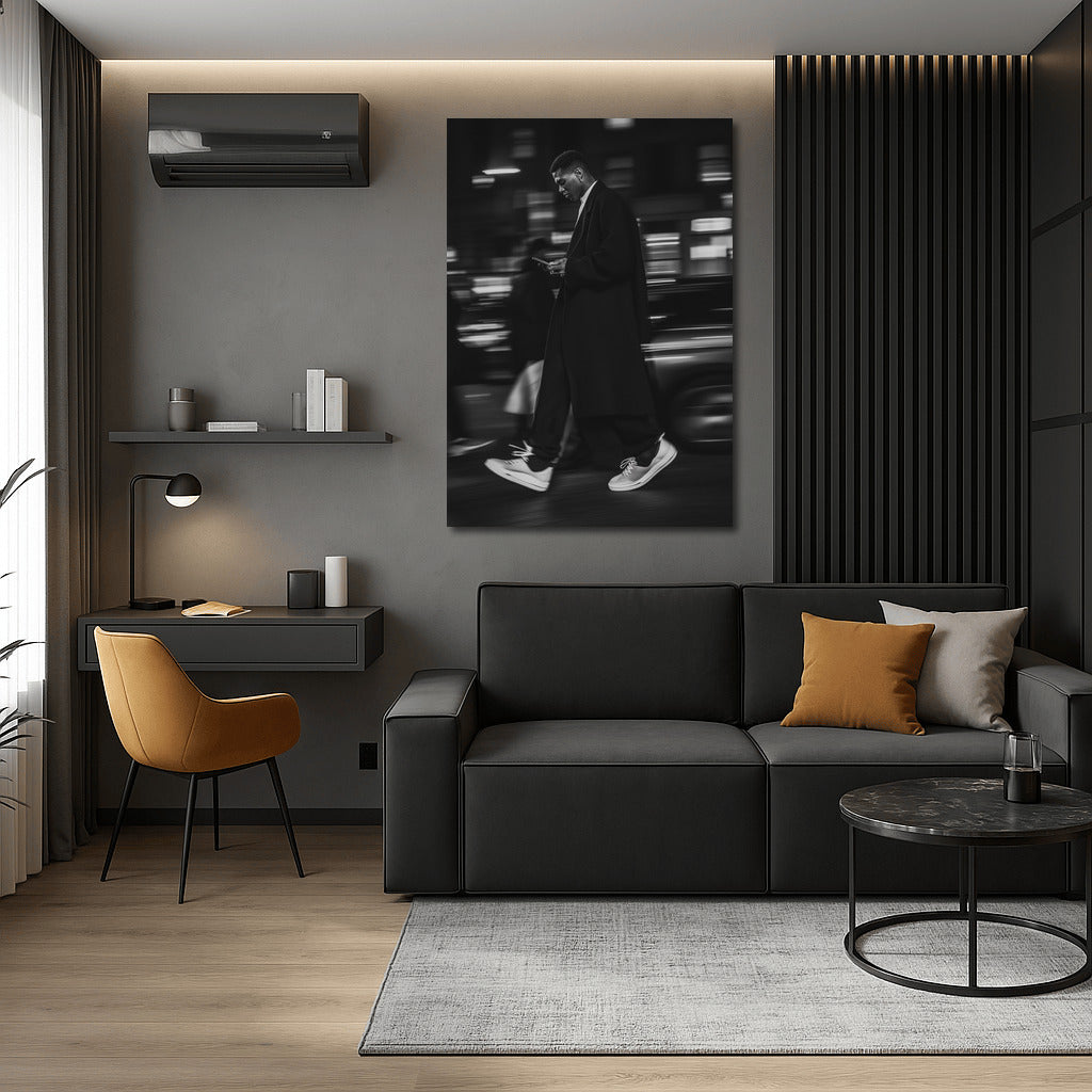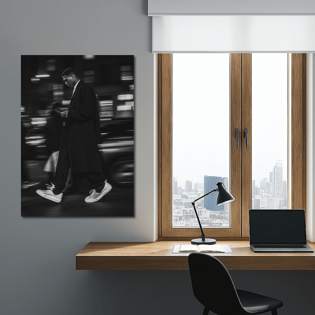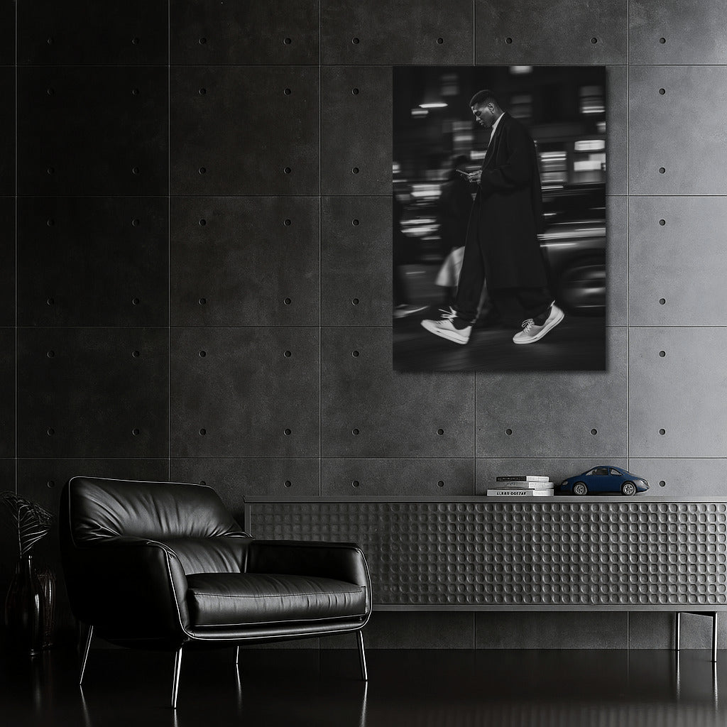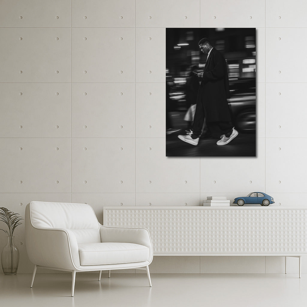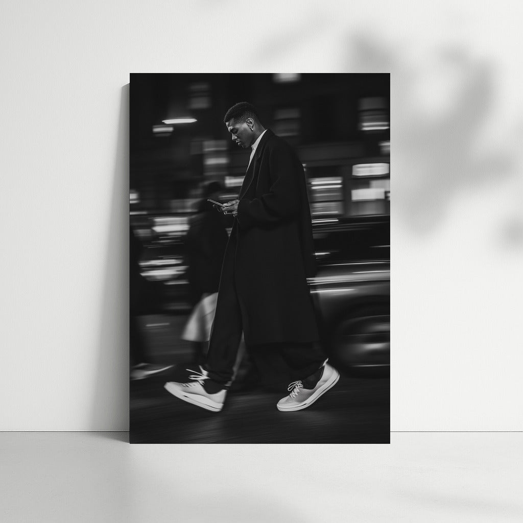 A masterpiece in motion: a stylish figure in the city night. This poster will add dynamics and elegance to your wall art! See more from the collection: Black and White Art