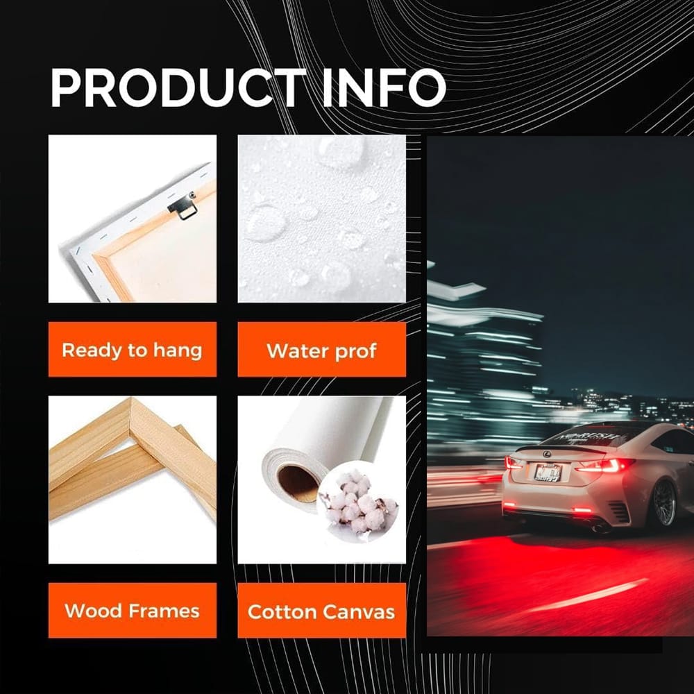 This poster is just a blast! Lexus in the city at night, all the headlights are on, like in the movies. The painting seems to scream: "Drive faster!" Wall art for those who live at full speed and love adrenaline. A car that is always in the spotlight. See more from the collection: Lexus Art