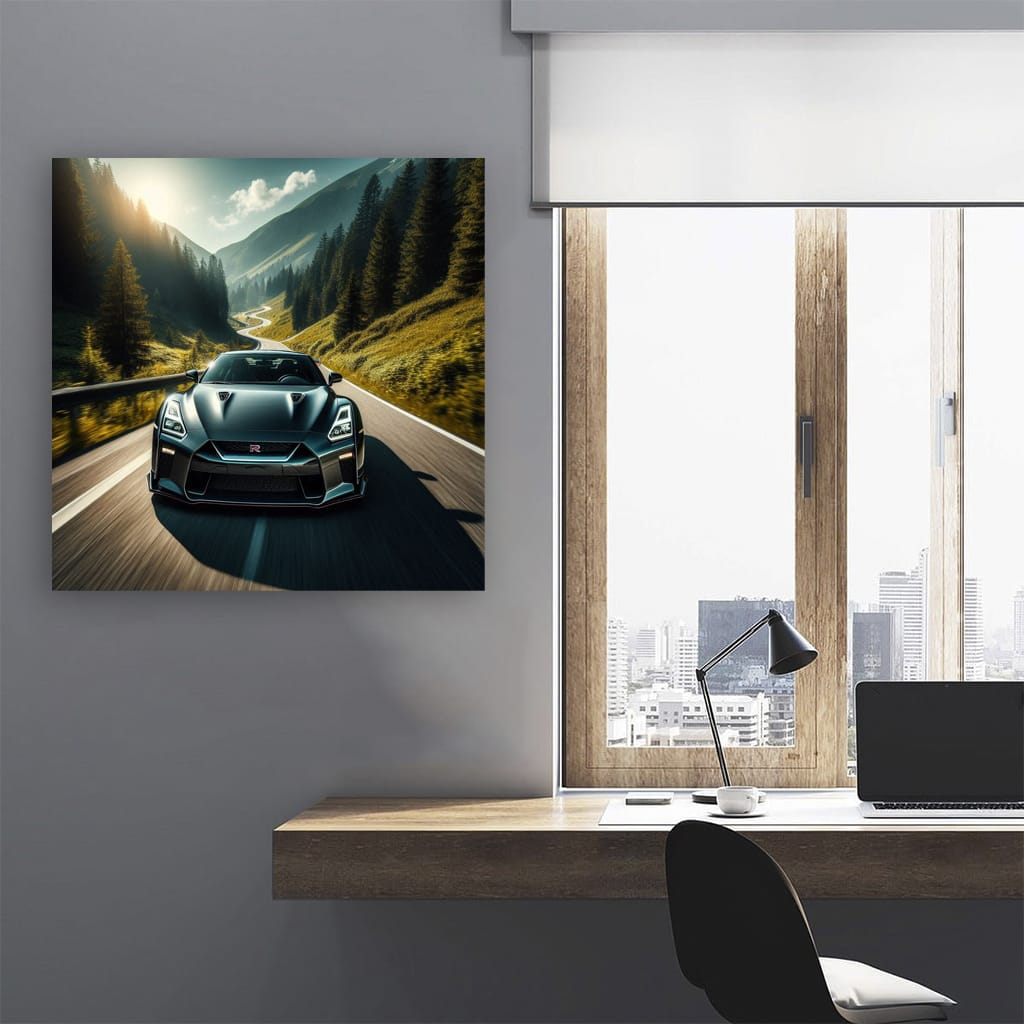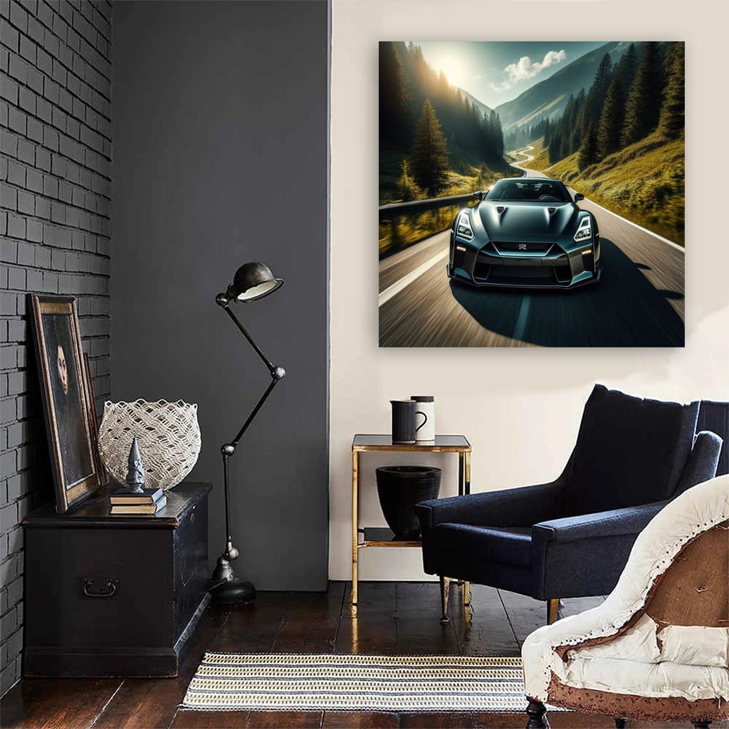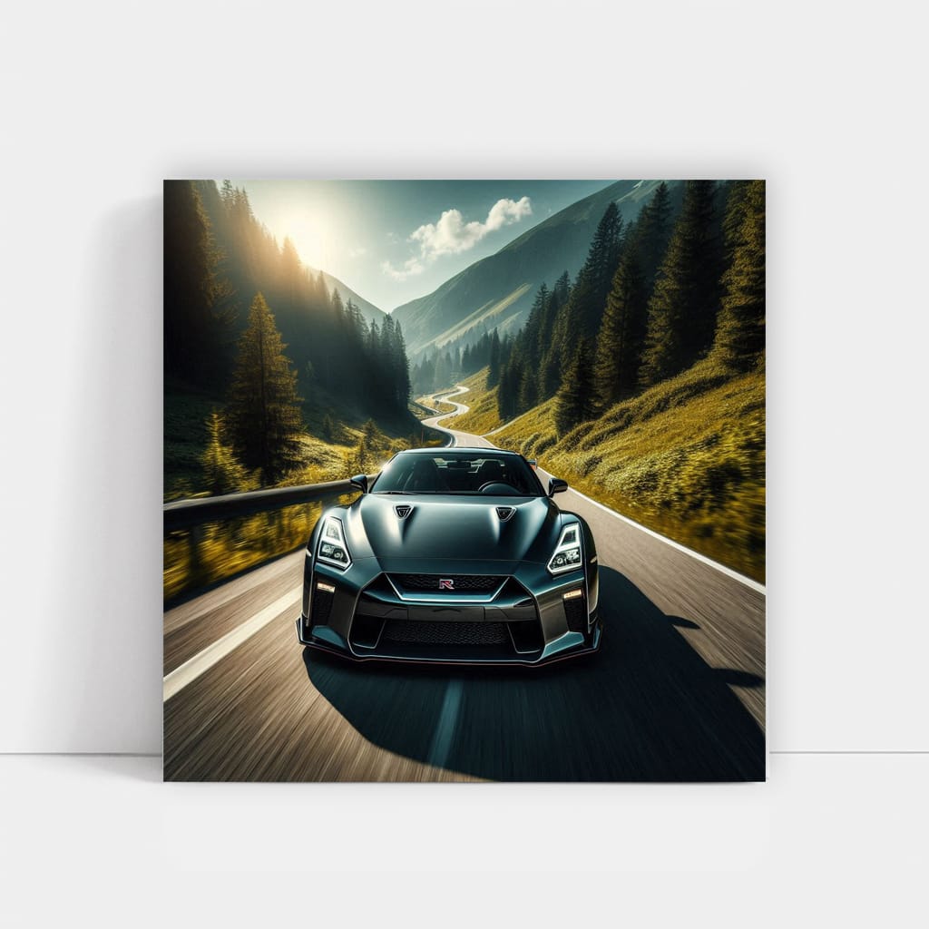 Hey bro, check out this poster of a Nissan GT-R with mountains in the background. This is not just a painting, this is a real bomb for your wall! Wall art for those who are into it. See more from the collection: Nissan Art