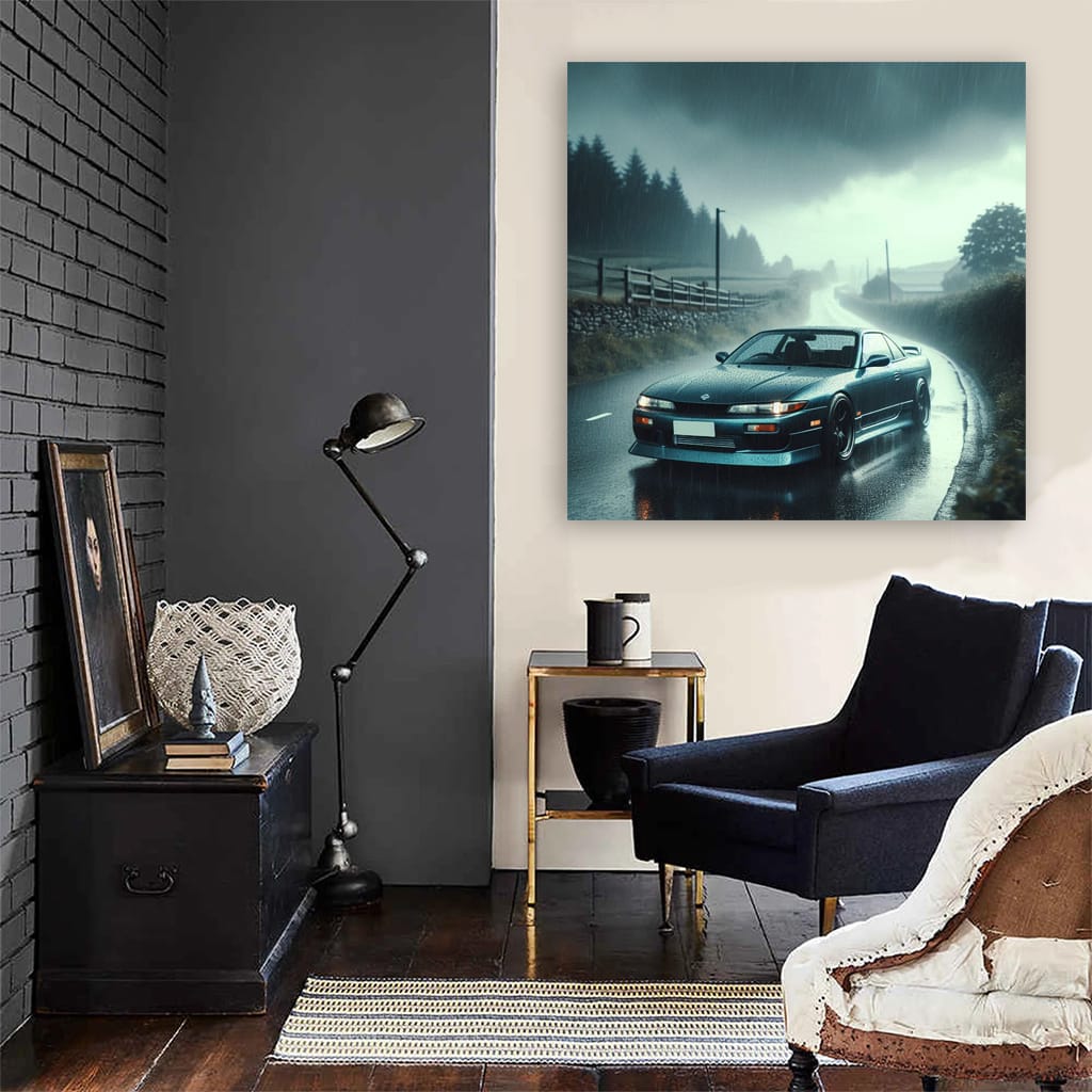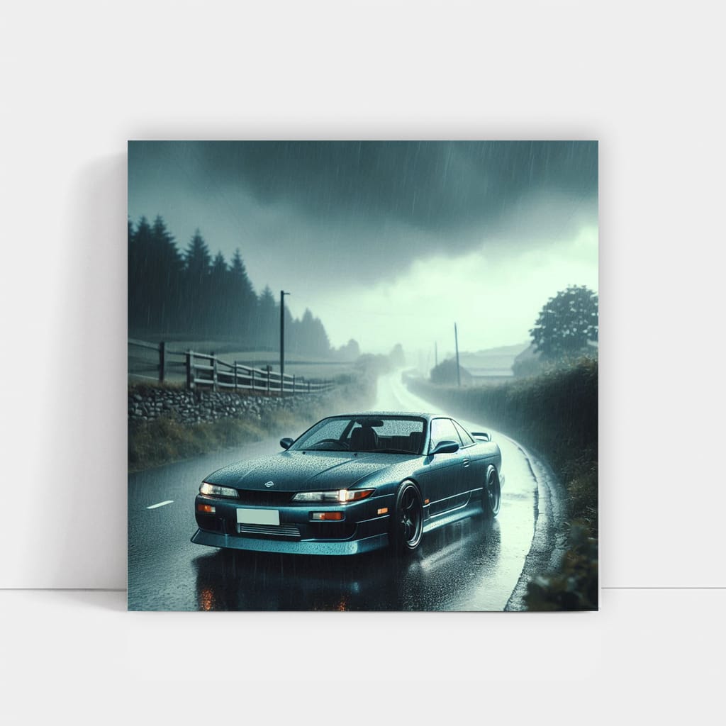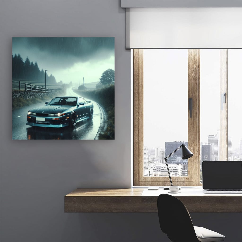 This poster is like a shot of adrenaline! A painting of a Nissan Silvia S13 in a storm is pure wild energy. Wall art for those who live on the edge. Turbo, drift, speed - it's all here. Hang it on your wall and feel like the king of the road! See more from the collection: Nissan Art