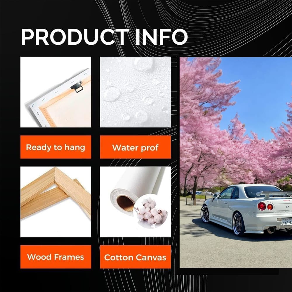 This poster is a real bomb for car lovers! The painting shows the Nissan Skyline GT-R R34 - a legend of the Japanese car industry, surrounded by delicate sakura flowers. This wall art will add boldness and style to any space. Just a thrill for connoisseurs of Japanese cars! See more from the collection: Nissan Art