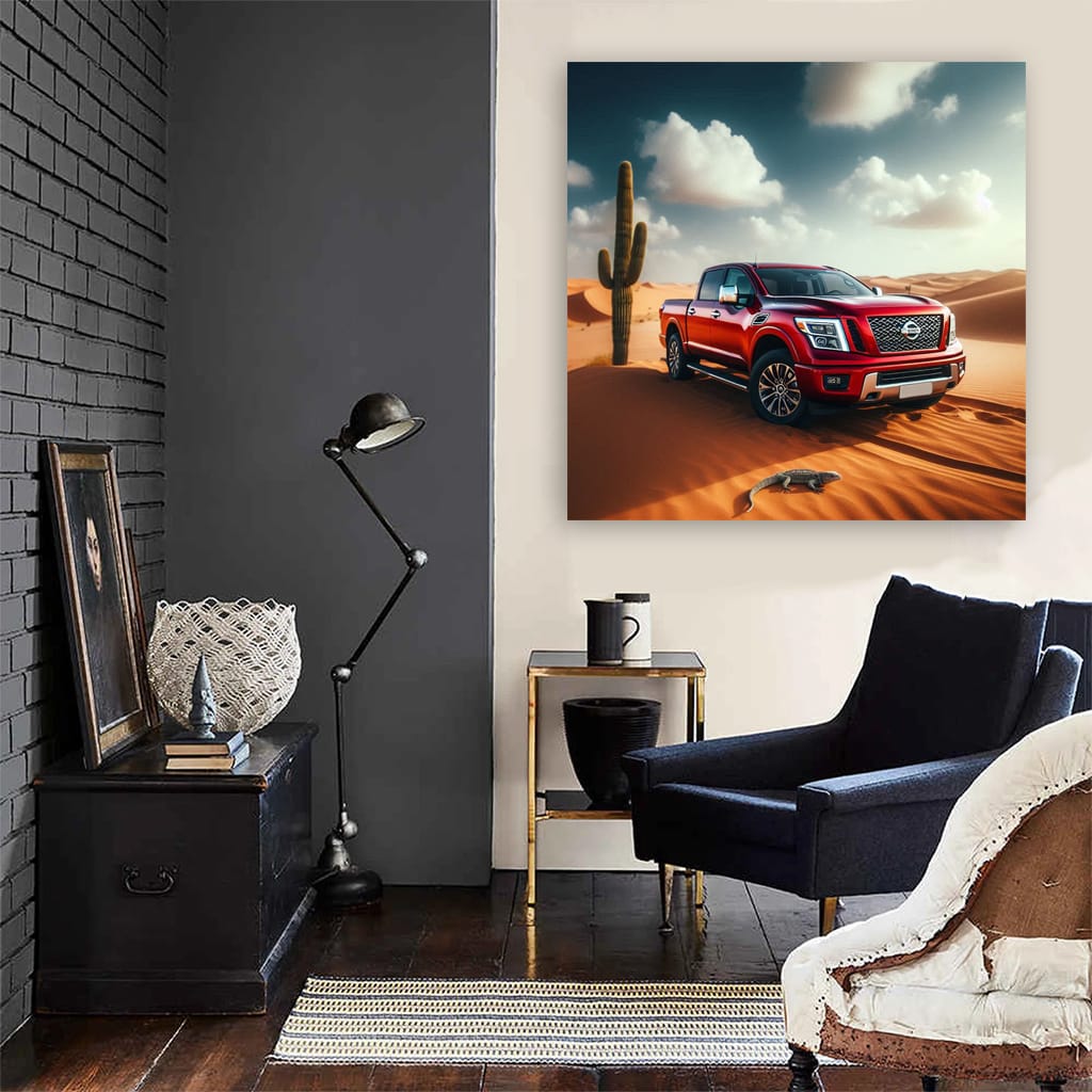 Ahead of you is a piece of roar and power - wall art with Nissan Titan Desert! This poster blows your mind like a crazy burnout at the start. This painting is like smelling hot rubber and sand under your feet. Perfect for the garage or man cave! See more from the collection: Nissan Art
