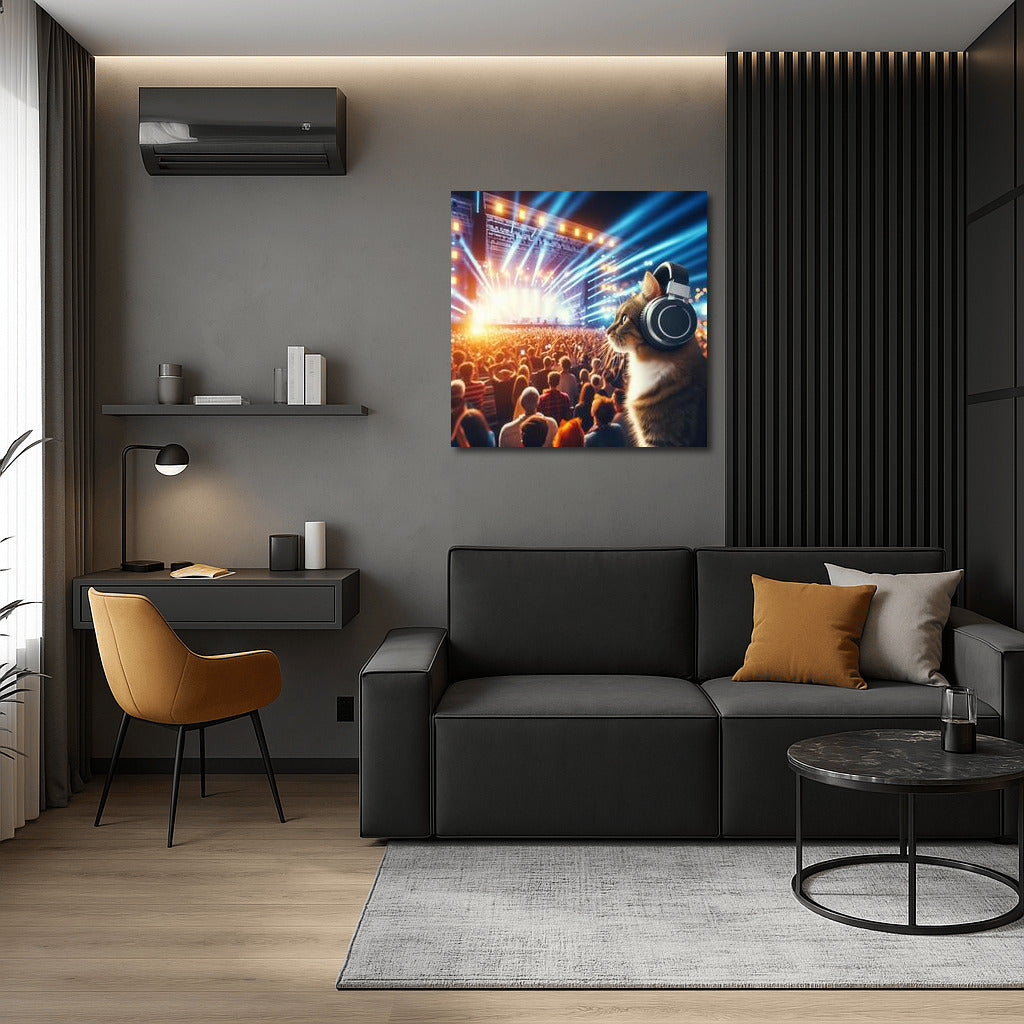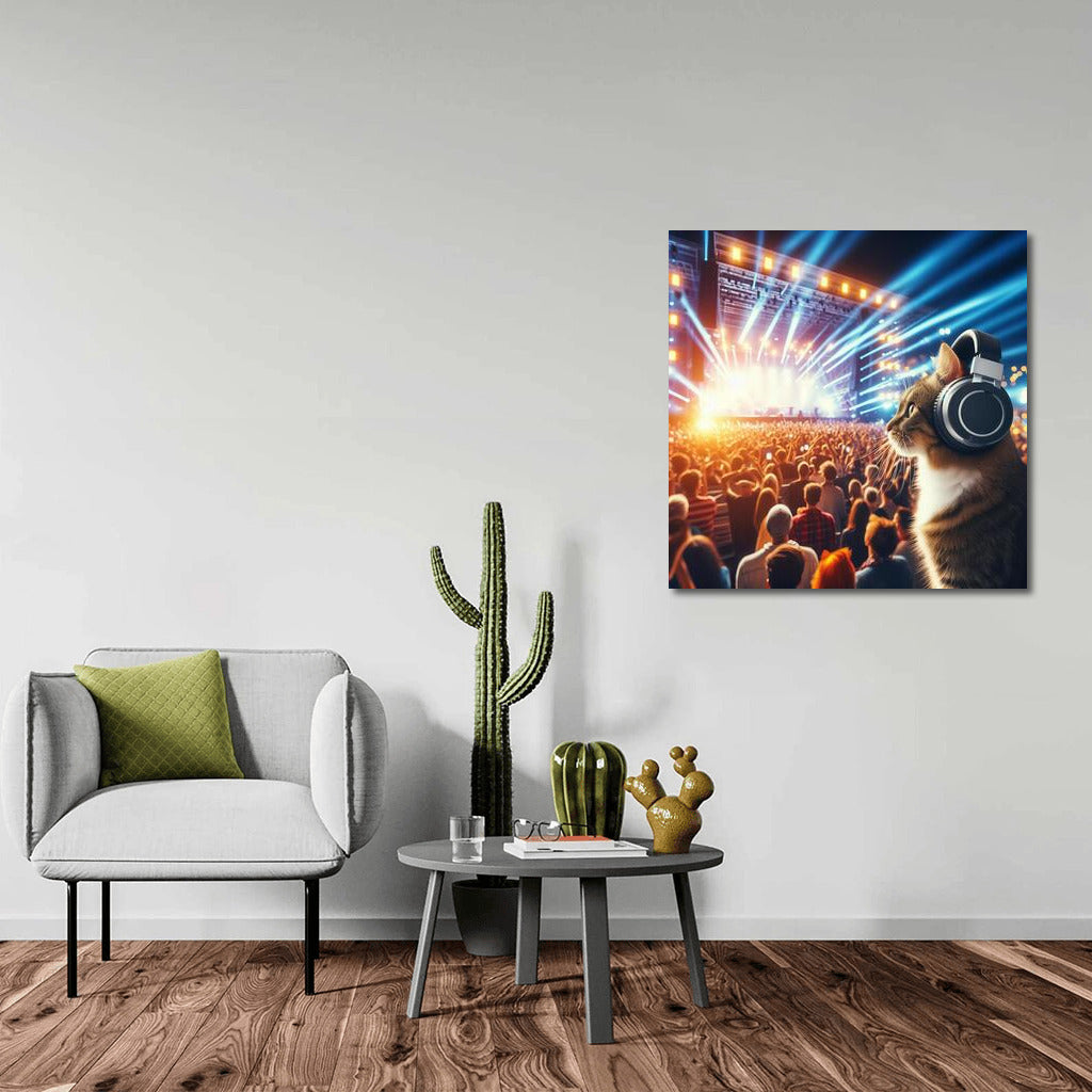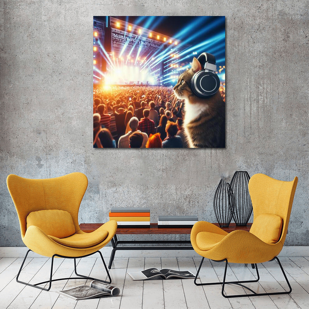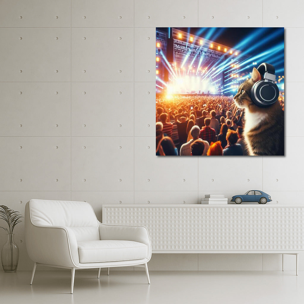 A cat with headphones catches the rhythm at a music festival. Wall art where Norwegian Forest comes alive in sound! See more from the collection: Animals Art