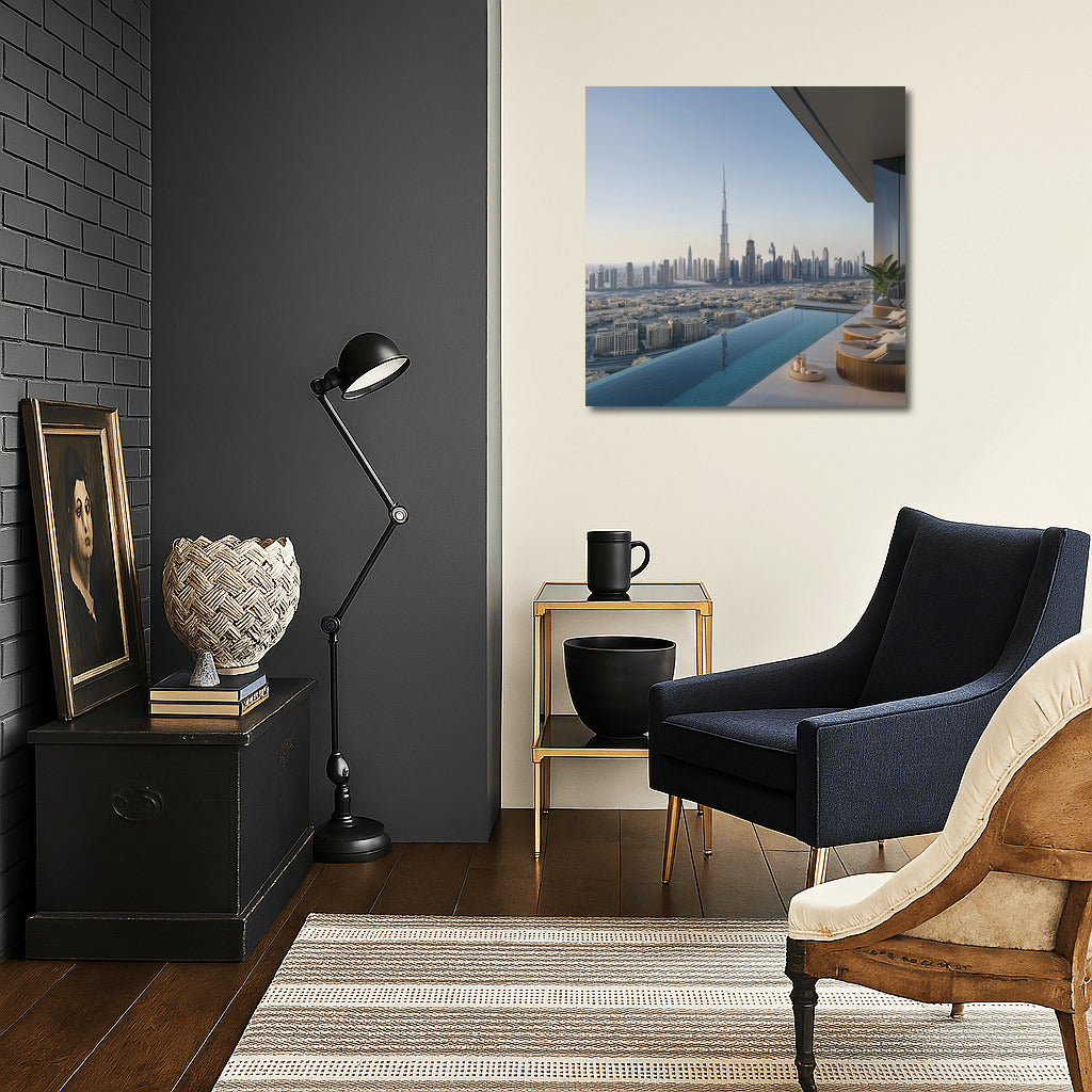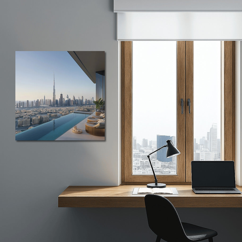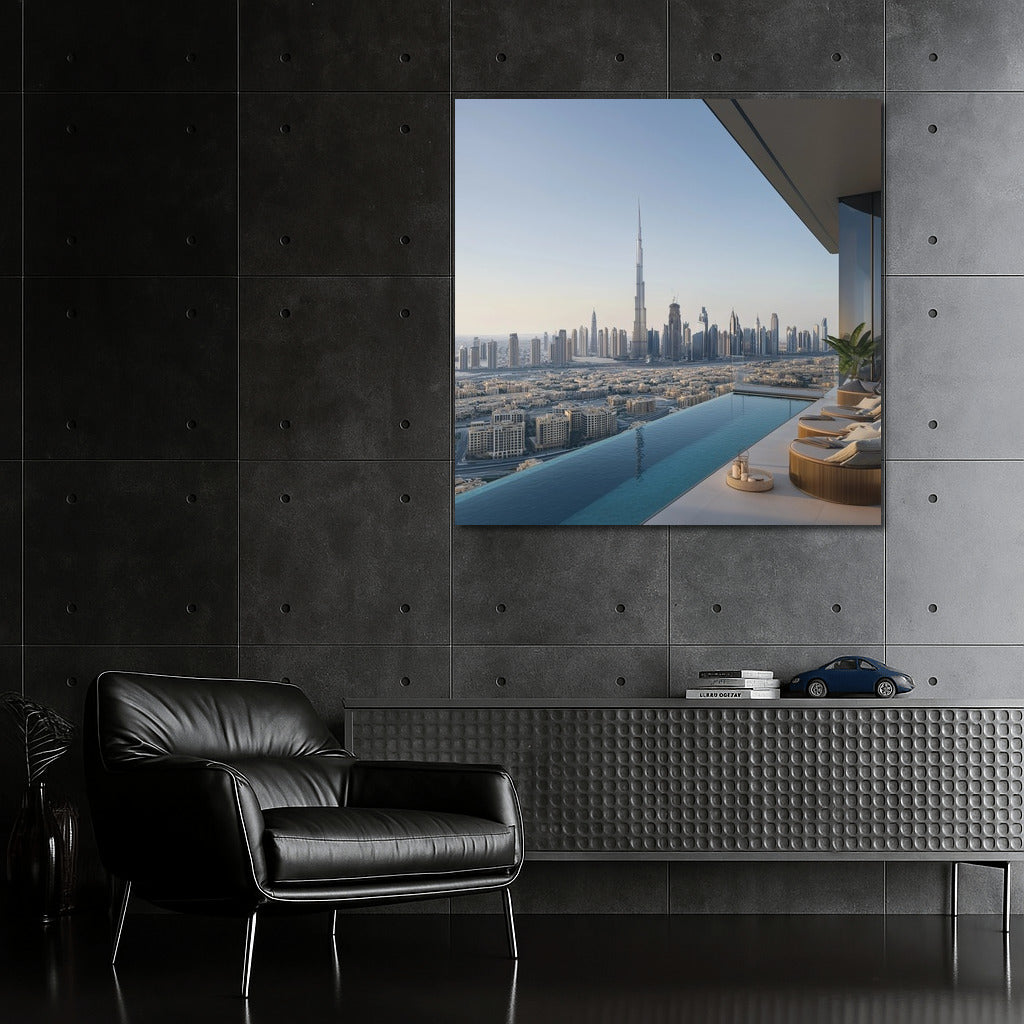 Urban dream: poster with view of modern skyscrapers from luxury swimming pool. Wall art for stylish interior. See more from the collection: Cityscapes & Skylines Art