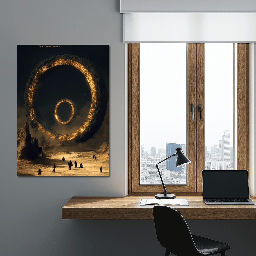 Mysterious glowing rings in a desert landscape - an inspiring poster for lovers of fantasy wall art. See more from the collection: Mixed Wall Art
