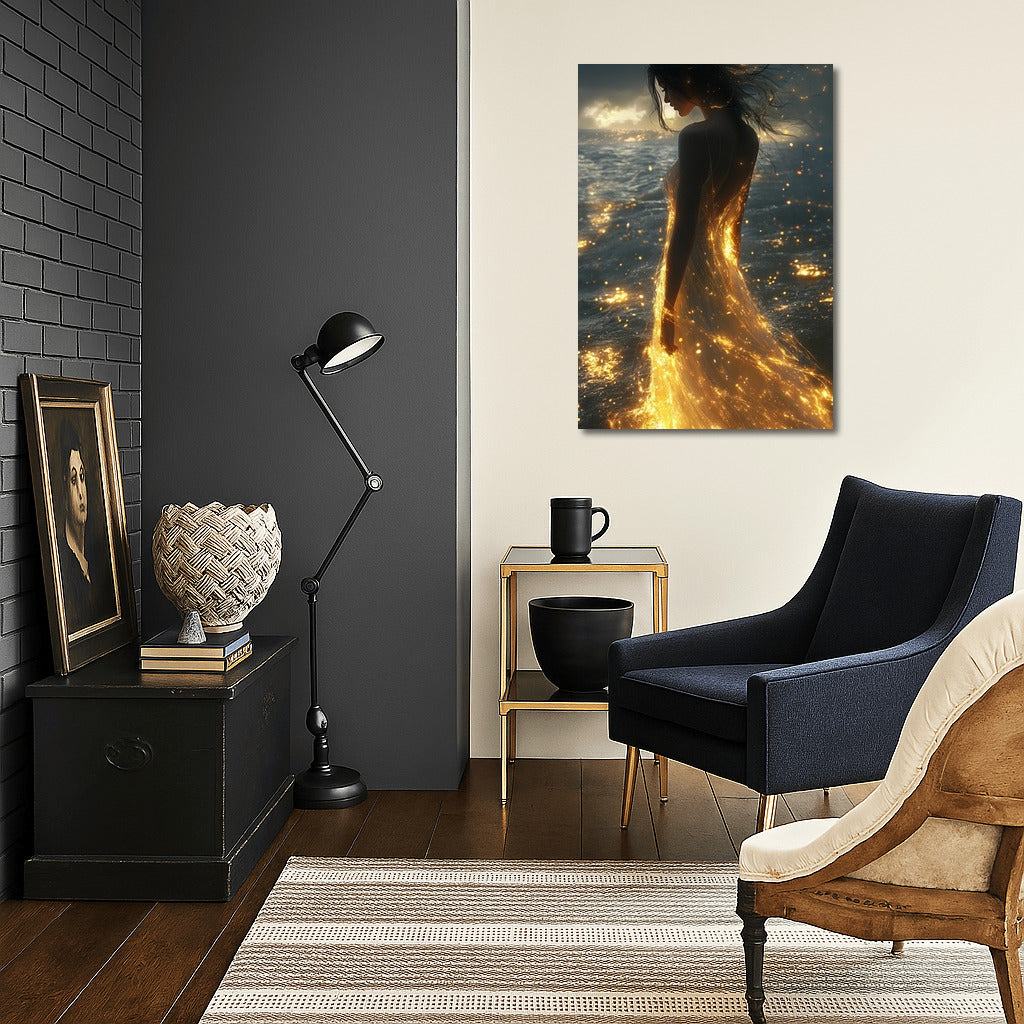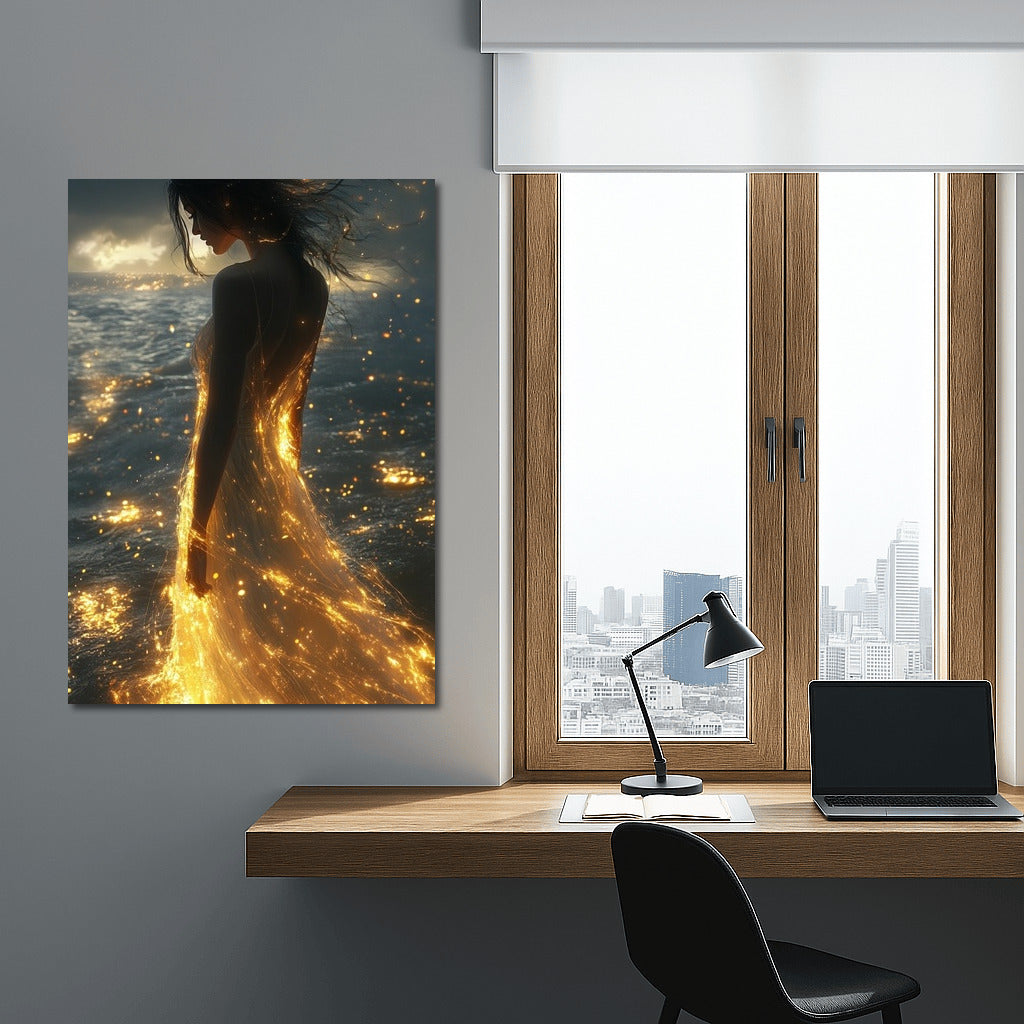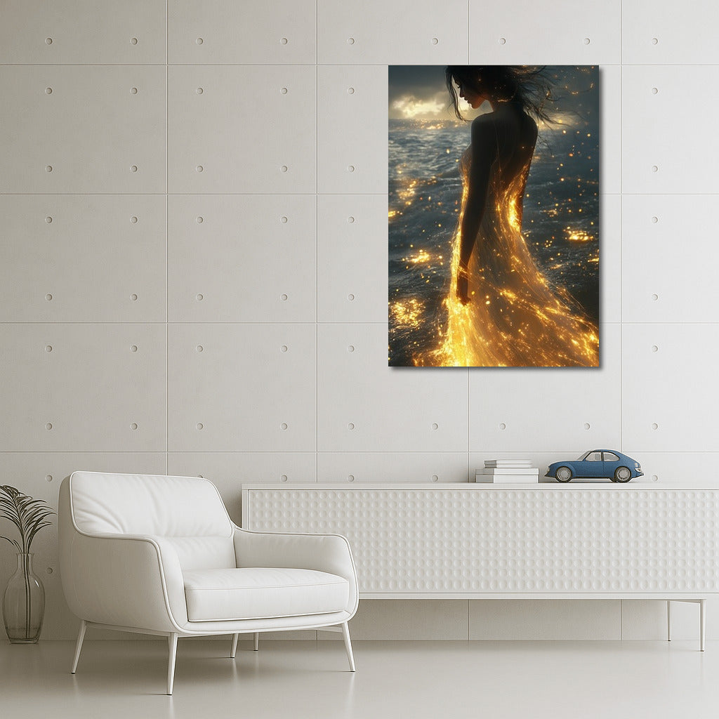 Light and water art: poster with a shining figure in the ocean. Add magic to your interior with this atmospheric painting. See more from the collection: Mixed Wall Art