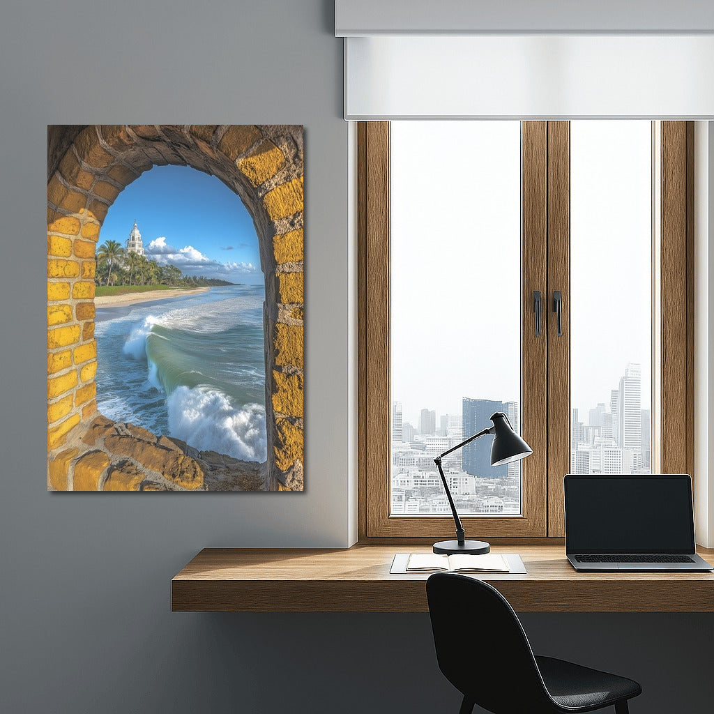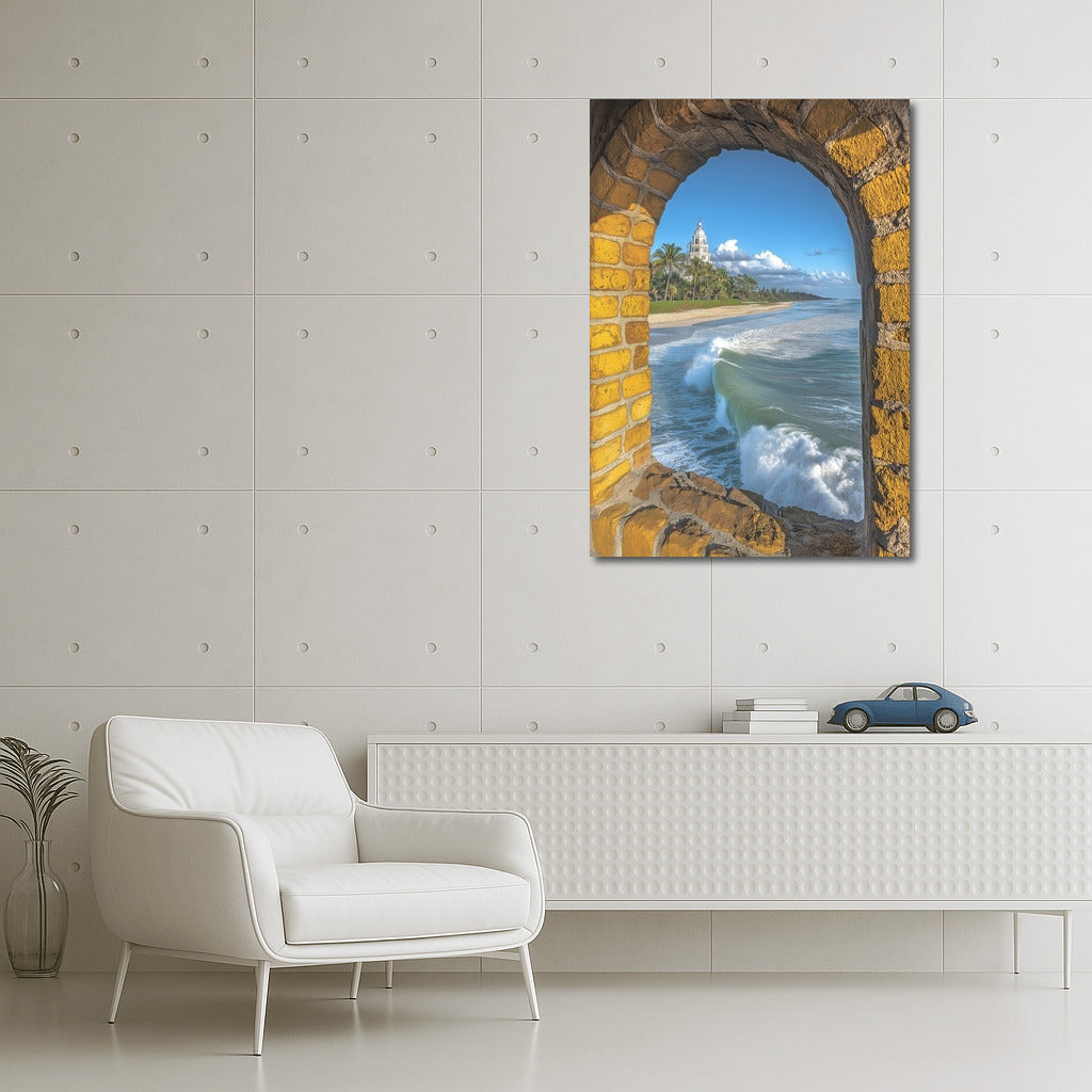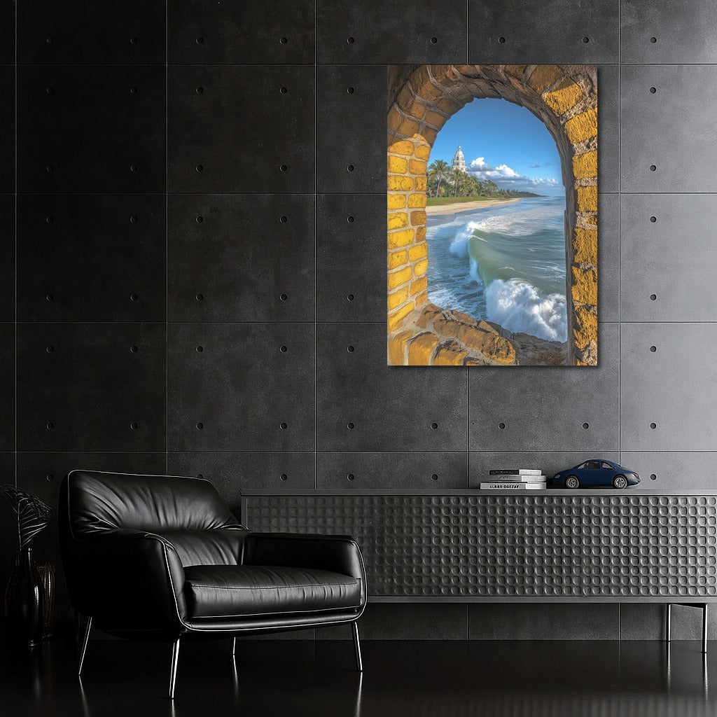paintingsque poster: view from an arched window of the endless ocean, waves and a tower in the distance. Perfect wall art for dreamers. See more from the collection: Beaches, Oceans & Coastal Views Art