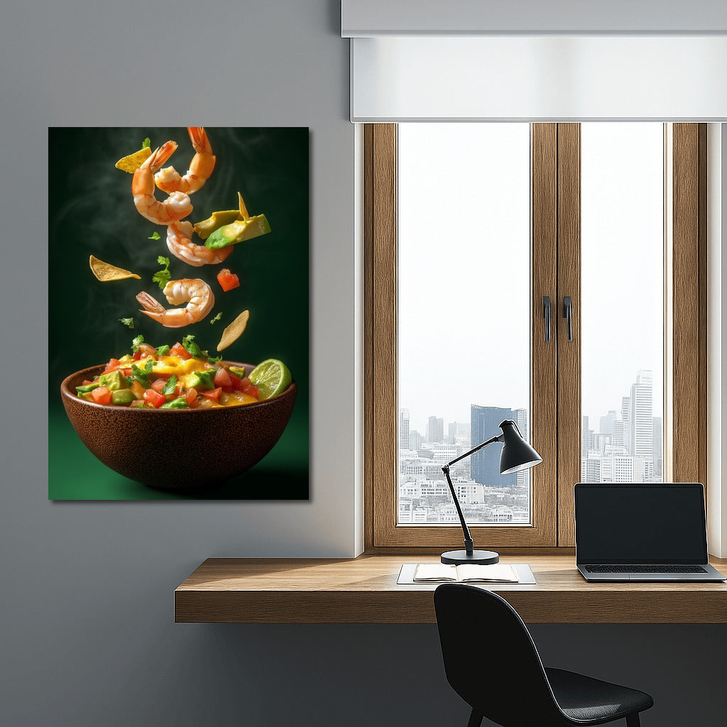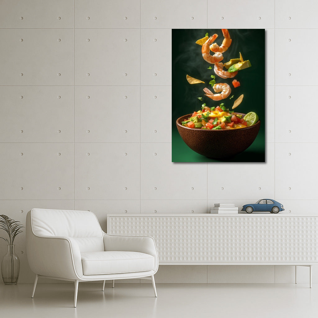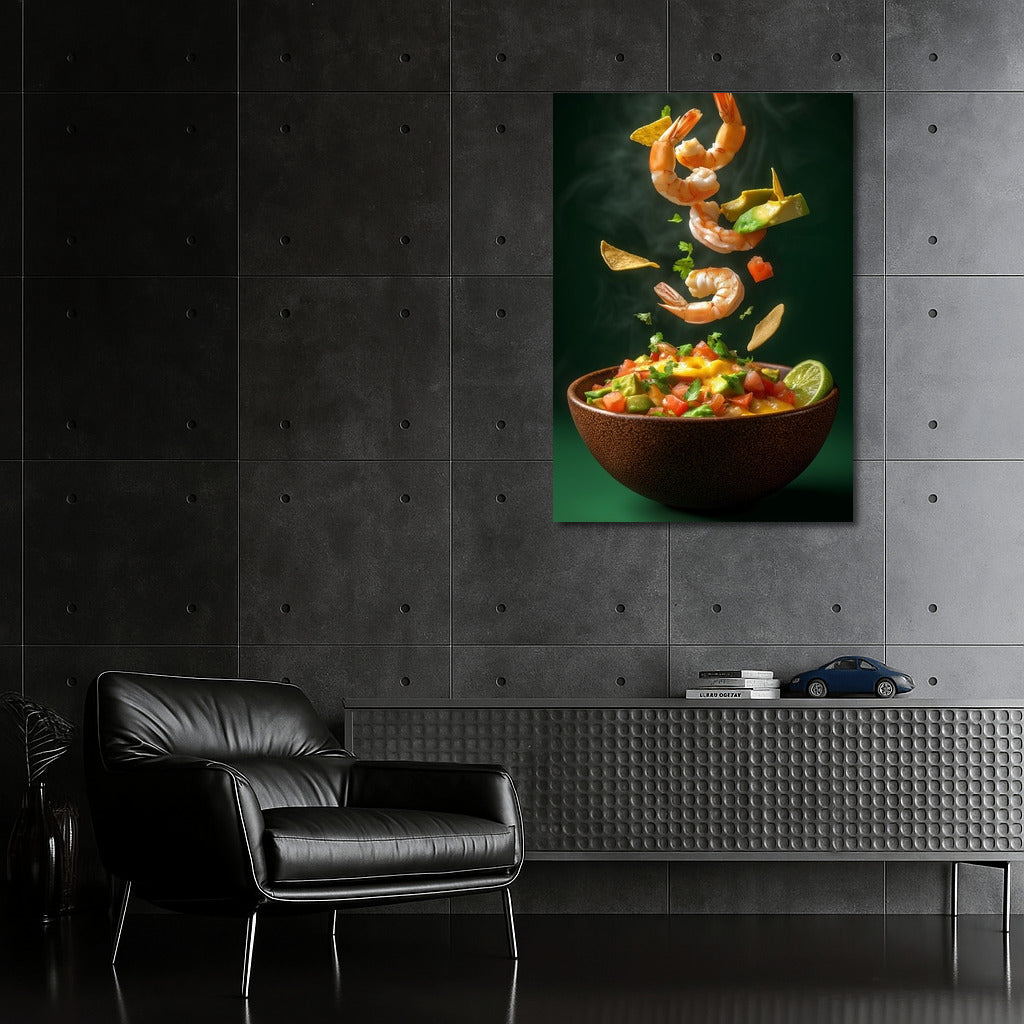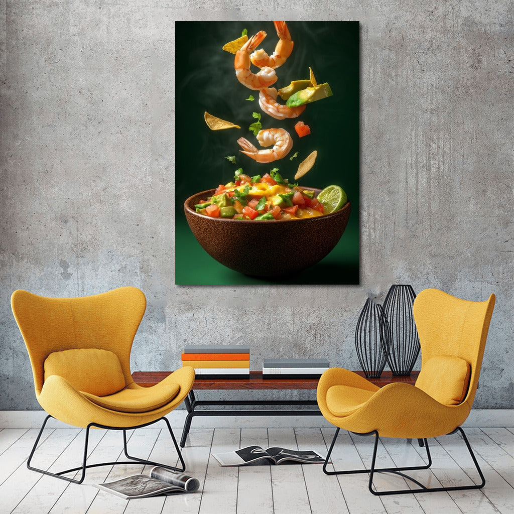 Freshness and color in every stroke! A poster with floating shrimp and vegetables will liven up any space. Wall art that inspires. See more from the collection: Food Art